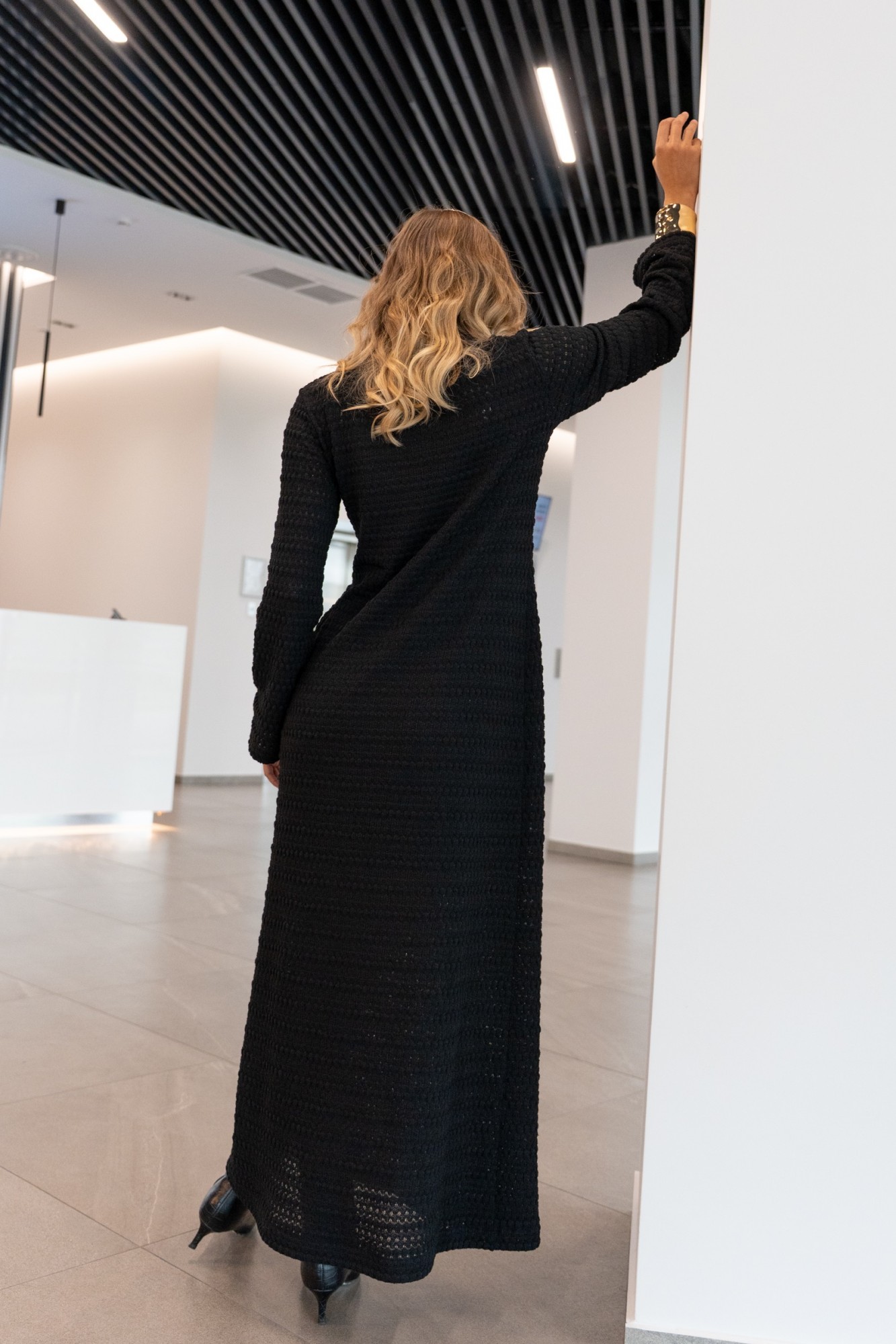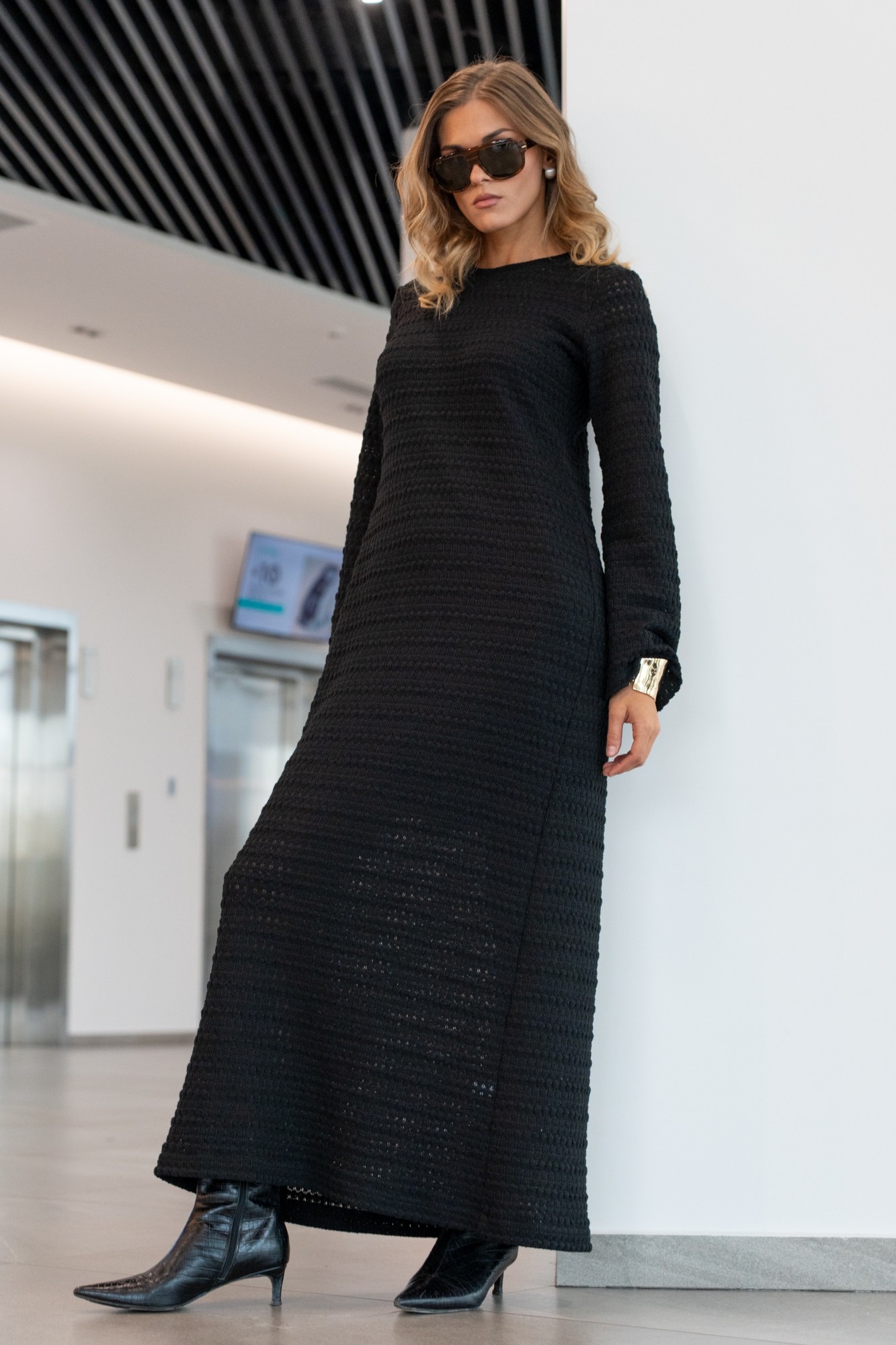 Платье макси из трикотажа, полуприлегающего А-образного силуэта. Рукав втачной прямой. Горловина округлой формы, обработана бейкой. Полупрозрачная "вязаная" текстура трикотажа делает платье стильным и романтичным. Подкладкой служит отдельное нижнее платье-комбинация на бретелях из трикотажного полотна.