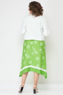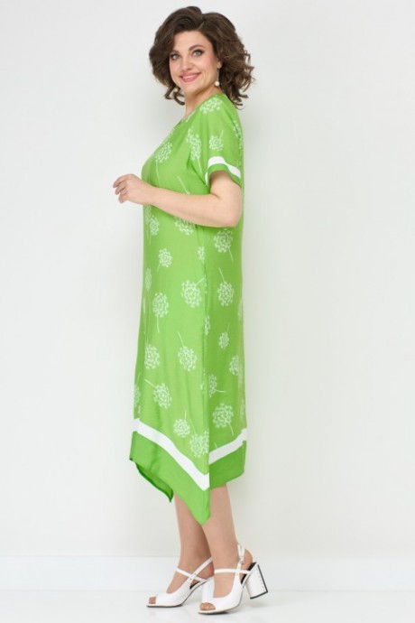 Платье женское свободного кроя, расширенное к низу. По низу изделия и по рукавам притачная декоративная деталь состоящая из двух цветов. Горловина круглая, по боковому шву -карманы. Рукав втачной, выше локтя. По полочке фигурный подрез по линии груди. По спинке притачная кокетка и средний шов. Низ изделия короче по центру и длиннее по бокам. Рекомендуется для женщин молодого и среднего возраста для повседневной и праздничной носки. Хорошо смотрится с кроссовками, а так же с туфлями на каблуках. Длина изделия по боковому шву-123 см, длина рукава-26 см.