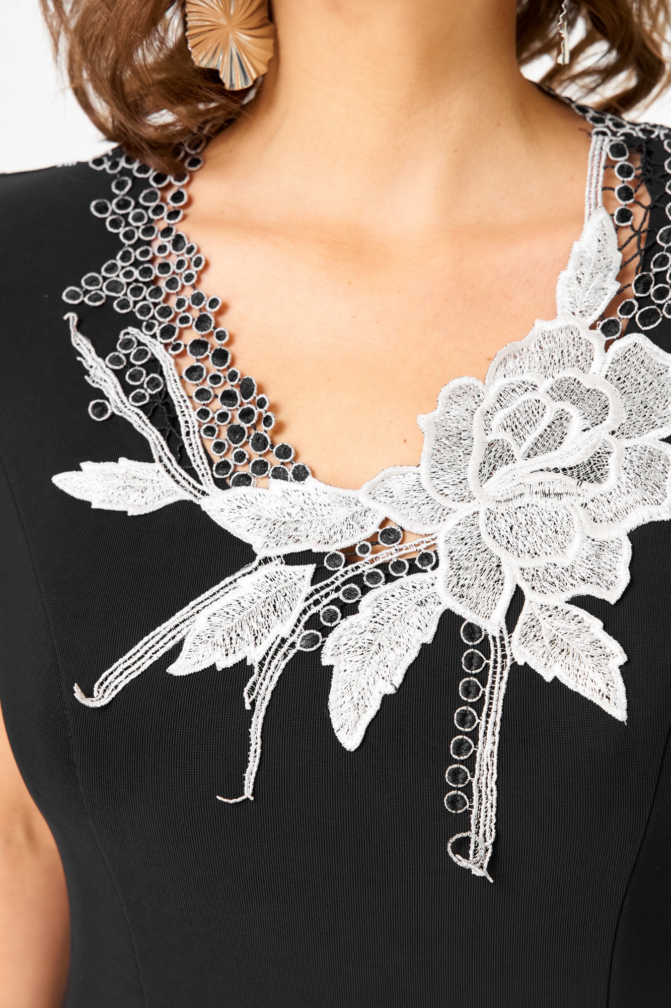 Платье облегающего силуэта. Украшением изделия служит вставка-аппликация вышитая на сетке. Аппликация расположена спереди и по спинке платья. По передней части рельефы, внизу полочки слева вырез. Рукава короткие фигурные.