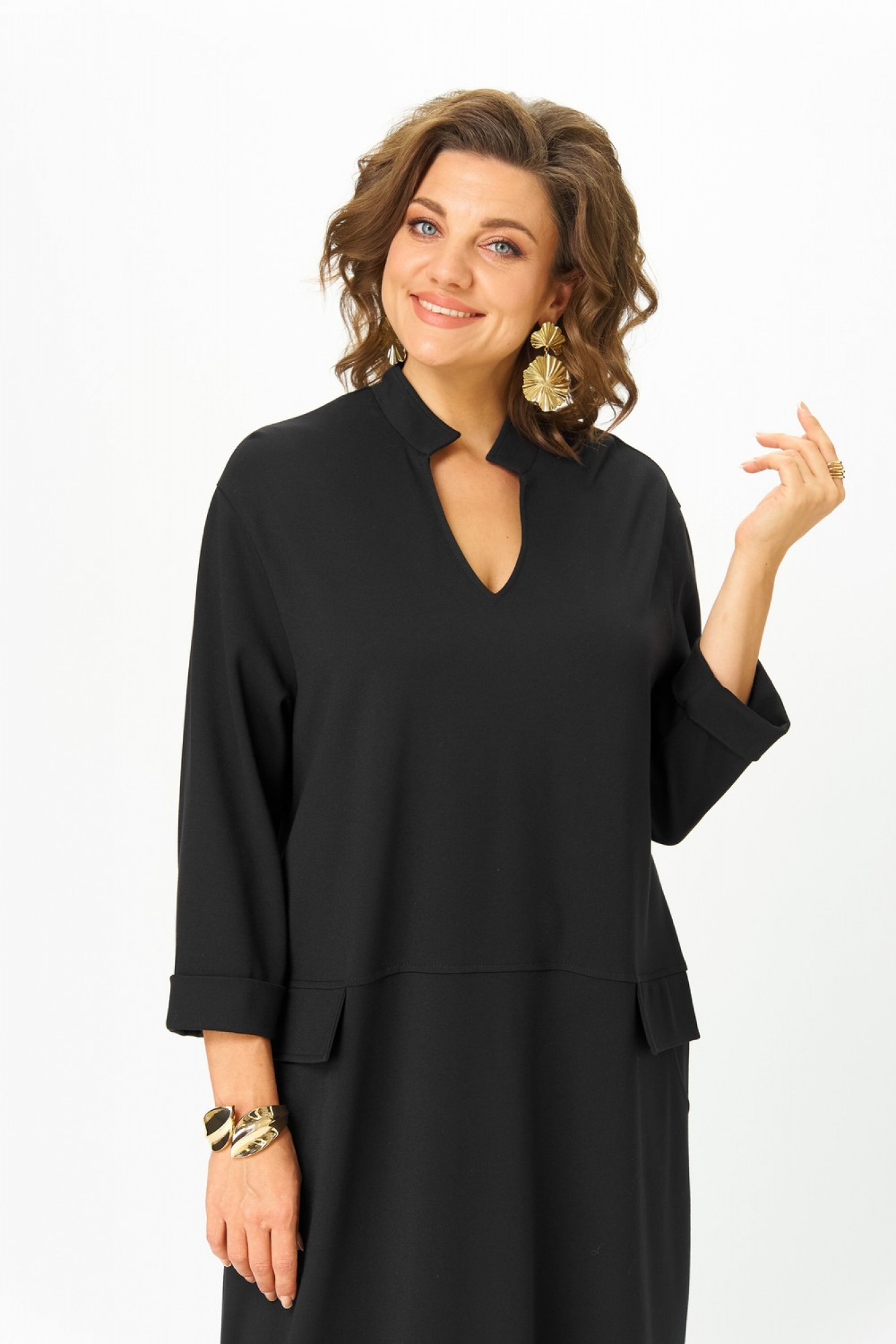 Платье женское прямого силуэта из трикотажного полотна длины миди, станет идеальным выбором для создания стильного и комфортного образа. Линия плеча спущена. Горловина v-образной формы с воротником-стойкой. По переду горизонтальный шов и боковые карманы с клапаном в нижней части. По спинке расположен центральный шов. Втачные рукава длиной 7/8 с отложной манжетой к низу добавляют легкости. В боковых швах обработаны разрезы.