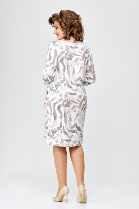 Платье из эластичного трикотажного полотна полуприлегающего силуэта. По переду обработаны нагрудные вытачки. Спинка цельнокроеная. Рукав втачной одношовный длиной 4/5 с манжетой из декоративного трикотажного довяза. В боковых швах обработаны карманы. Горловина V- образной формы, обработана декоративным трикотажным довязом.