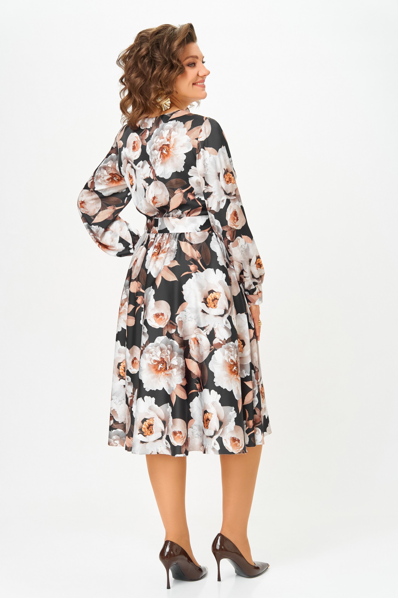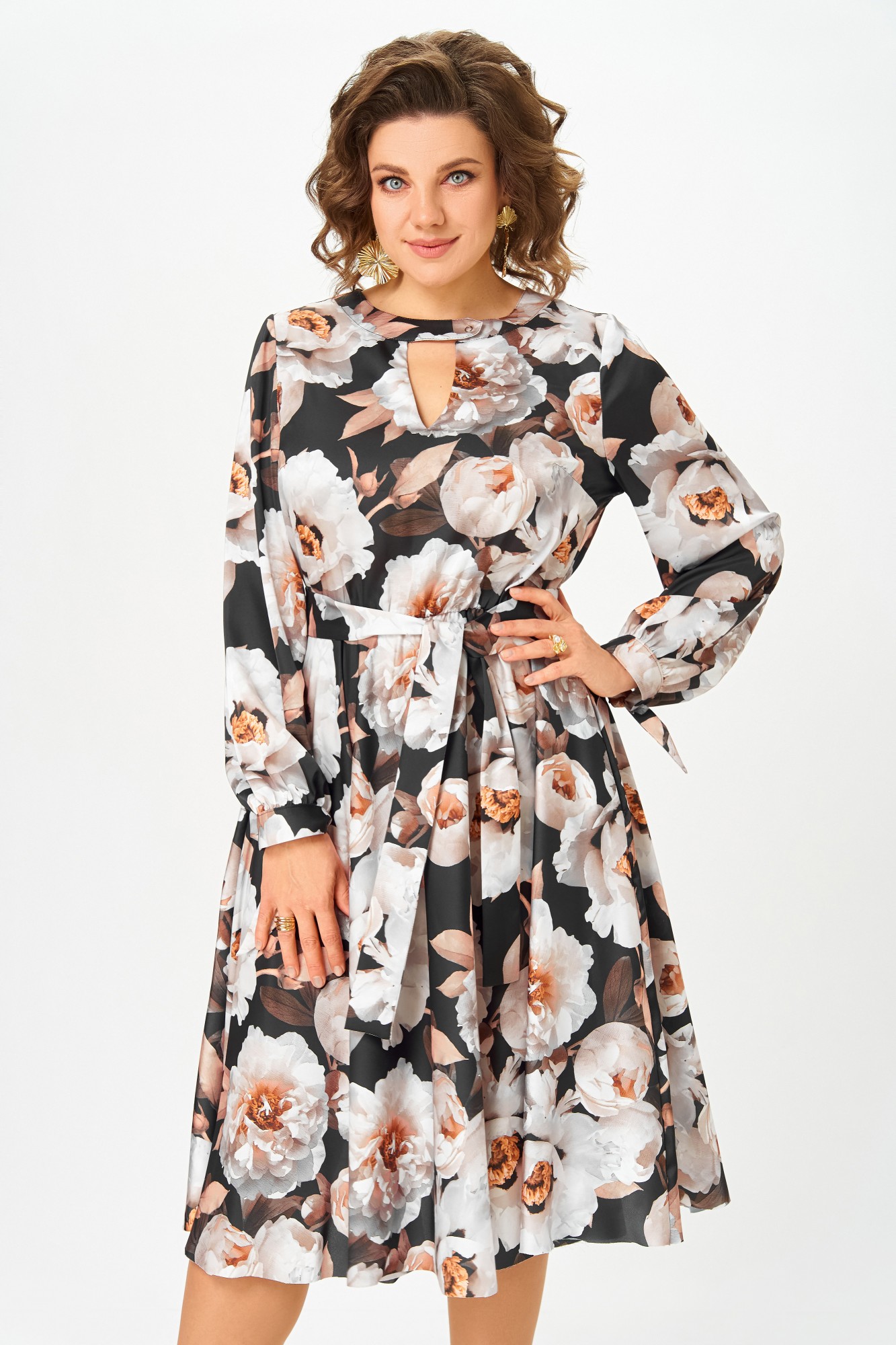 Платье из нежной ткани, имитирующей шёлк, Х-образного силуэта, отрезное по линии талии.
