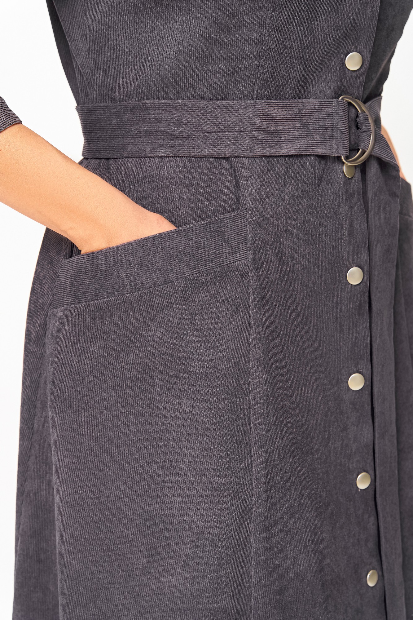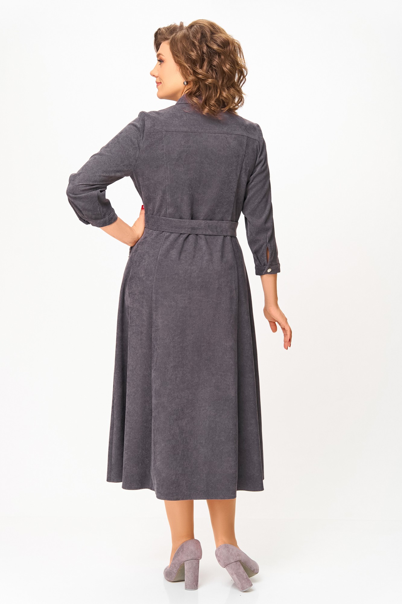 Платье из мягкой ткани вельвет, отрезное по линии талии с полуприлегающим лифом и юбкой А-силуэта, с центральной застёжкой на петли и декоративные пуговицы. Полочка лифа с вертикальными рельефами, спинка с кокеткой и отрезными бочками. Юбка состоит из семи клиньев. По переду между швами обработаны карманы с планкой на косую. Воротник отложной рубашечного типа, с отрезной стойкой. Рукав втачной, одношовный длиной ¾, внизу с манжетой, которая застёгивается на петлю и пуговицу. Платье комплектуется поясом из основной ткани, с декоративными полукольцами. На планке кармана фирменная декоративная эмблема «swallow».