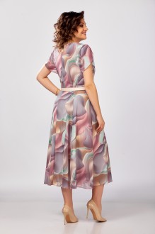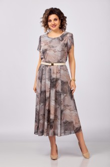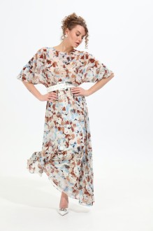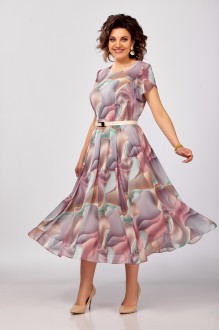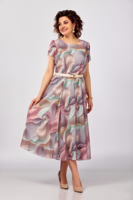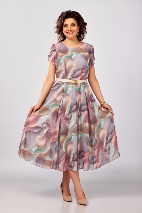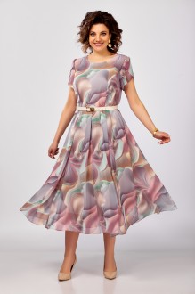 Платье из шифона на трикотажной подкладке, Х-образного силуэта с полуприлегающим лифом. Платье отрезное по линии талии. По переду лифа расположены рельефы, по спинке лифа таллиевые выточки. Юбка расклешенная из шести клиньев со встречными складками по линии талии. В среднем шве спинки предусмотрена потайная тесьма- молния. Рукав втачной покроя тюльпан, длина рукава 15 см. В подарок ремень с декоративной пряжкой. Размер 64 комплектуется поясом из основной ткани.