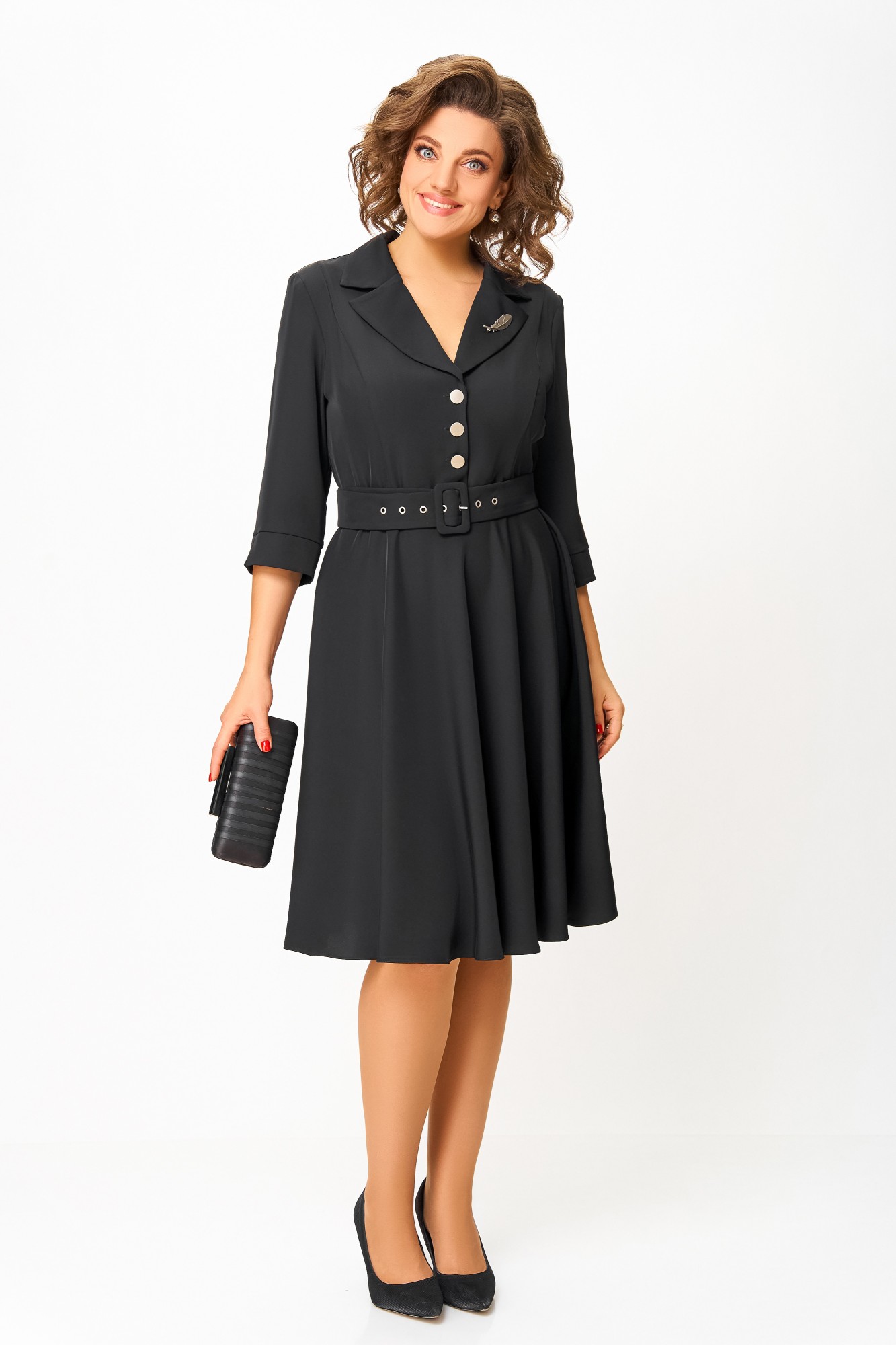 Платье из мягкой поливискозной ткани, Х-образного силуэта с полуприлегающим лифом. Платье отрезное по линии талии. Перед лифа с вертикальными рельефами и застёжкой на петли и 4 декоративные пуговицы. Горловина V-образной формы, с отложными лацканами и воротником пиджачного типа. Спинка лифа с таллиевыми выточками. Рукав втачной, длиной ¾, по низу манжет с разрезом. Застёжка в боковом шве на потайную тесьму-молнию. В комплекте пояс из основной ткани с пряжкой и блочками. В подарок декоративное украшение – брошь.