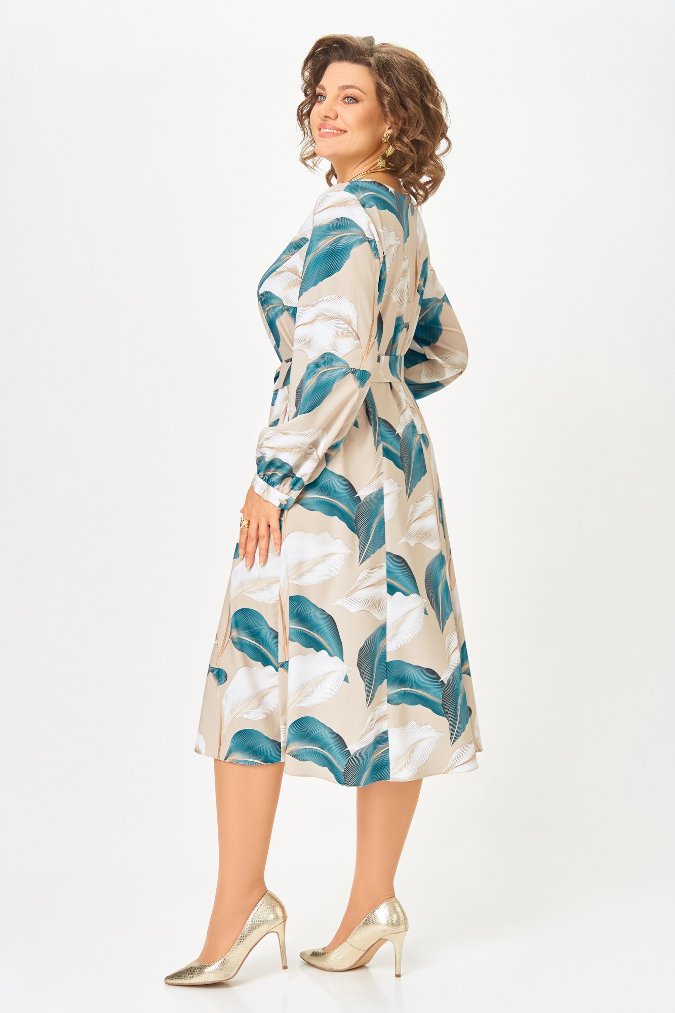 Платье полуприлегающего силуэта из мягкой вискозной ткани. Полочка с отрезными рельефами, спинка с центральным швом и рельефами. Горловина округлой формы. Рукав втачной, длинный внизу со сборкой и манжетой, которая застёгивается на петлю и декоративную пуговицу. В центральном шве спинки застёжка на потайную тесьму-молнию. В комплекте пояс из основной ткани.