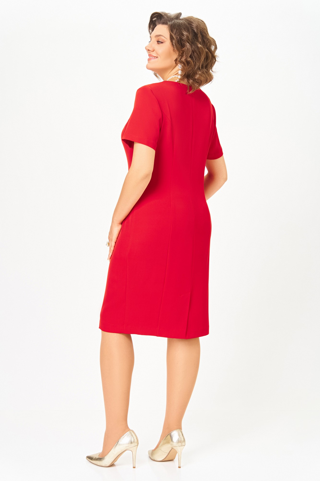 Платье полуприлегающего силуэта из мягкой поливискозной ткани. По полочке выполнены рельефные швы, по спинке рельефные швы, средний шов со шлицей и застёжка на потайную тесьму-молнию. Горловина круглая, обработана обтачкой. Рукав втачной, короткий. В подарок украшение – жемчужное колье.
