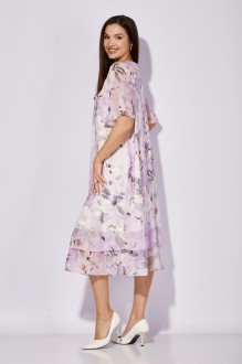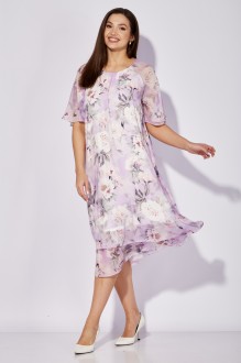 Платье женское, трапециевидного силуэта, двухслойное. Нижнее платье из трикотажного полотна (масло) с притачным воланом по низу из основной ткани. Рукав реглан, короткий, расширенный к низу. Вырез горловины круглой формы, по центру с небольшой сборкой.