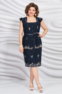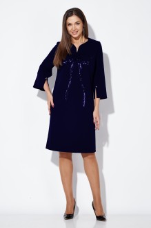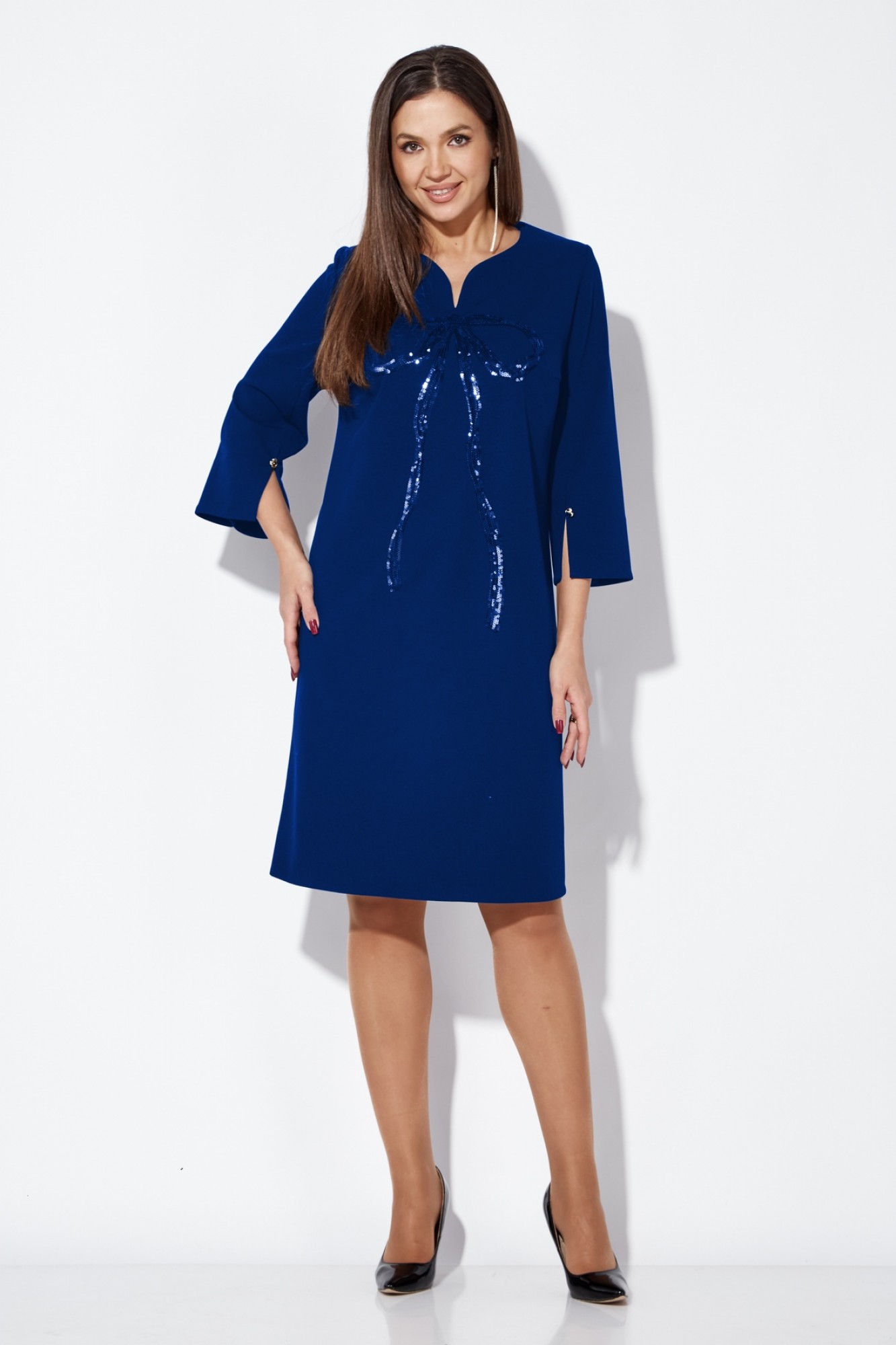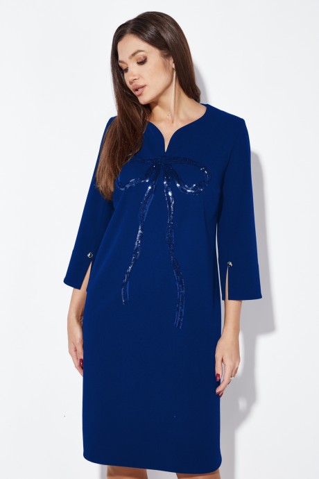 Платье женское, А силуэта, с втачным рукавом, длинной 3/4. Рукав расширенный к низу с разрезом по шву. Разрез зафиксирован на навесную петлю и отделочную пуговицу. Вырез горловины фигурной формы. Перед задекорирован вышивкой из паеток. По спинке средний шов и талевые вытачки. Застежка на потайную тесьму "молния" в среднем шве.