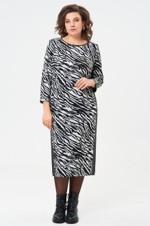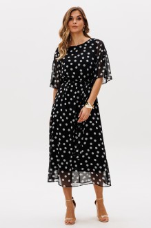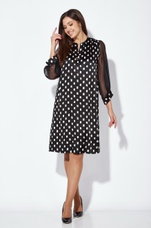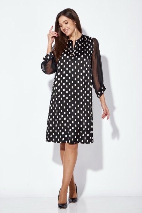 Платье женское, А силуэта, с втачным рукавом, длинной 3/4. Рукав расширенный к низу с разрезом по шву. Разрез зафиксирован на навесную петлю и отделочную пуговицу. Вырез горловины фигурной формы. Перед задекорирован вышивкой из паеток. По спинке средний шов и талевые вытачки. Застежка на потайную тесьму "молния" в среднем шве.