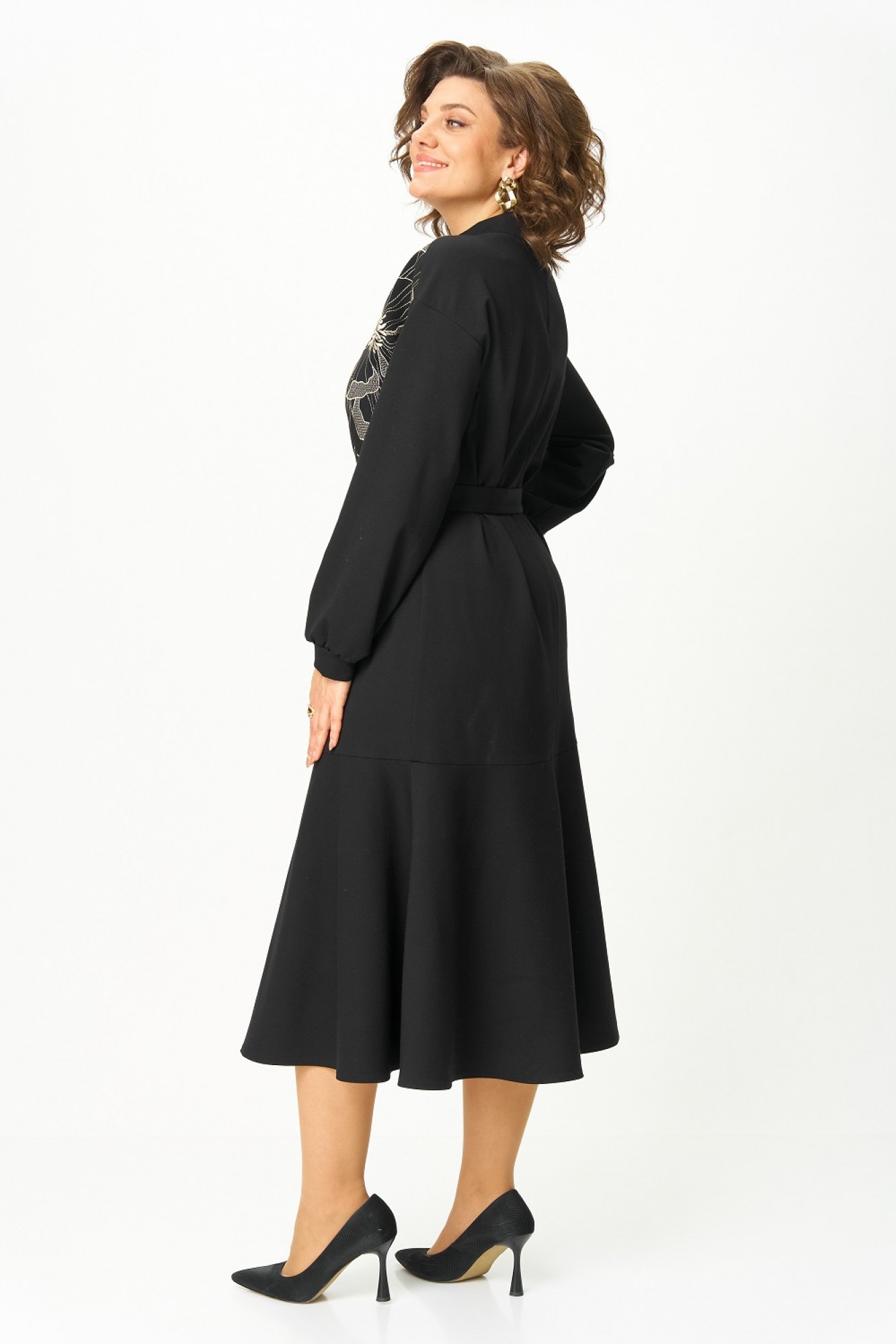 Платье из трикотажного полотна прямого силуэта со спущенной линией плеча, воланом по низу. Спинка со средним швом и застежкой на «молнию» в верхней части и по стойке. Рукав втачной одношовный на притачной манжете. Вырез горловины круглый. Воротник стойка. Есть съемный пояс из основной ткани с пряжкой.