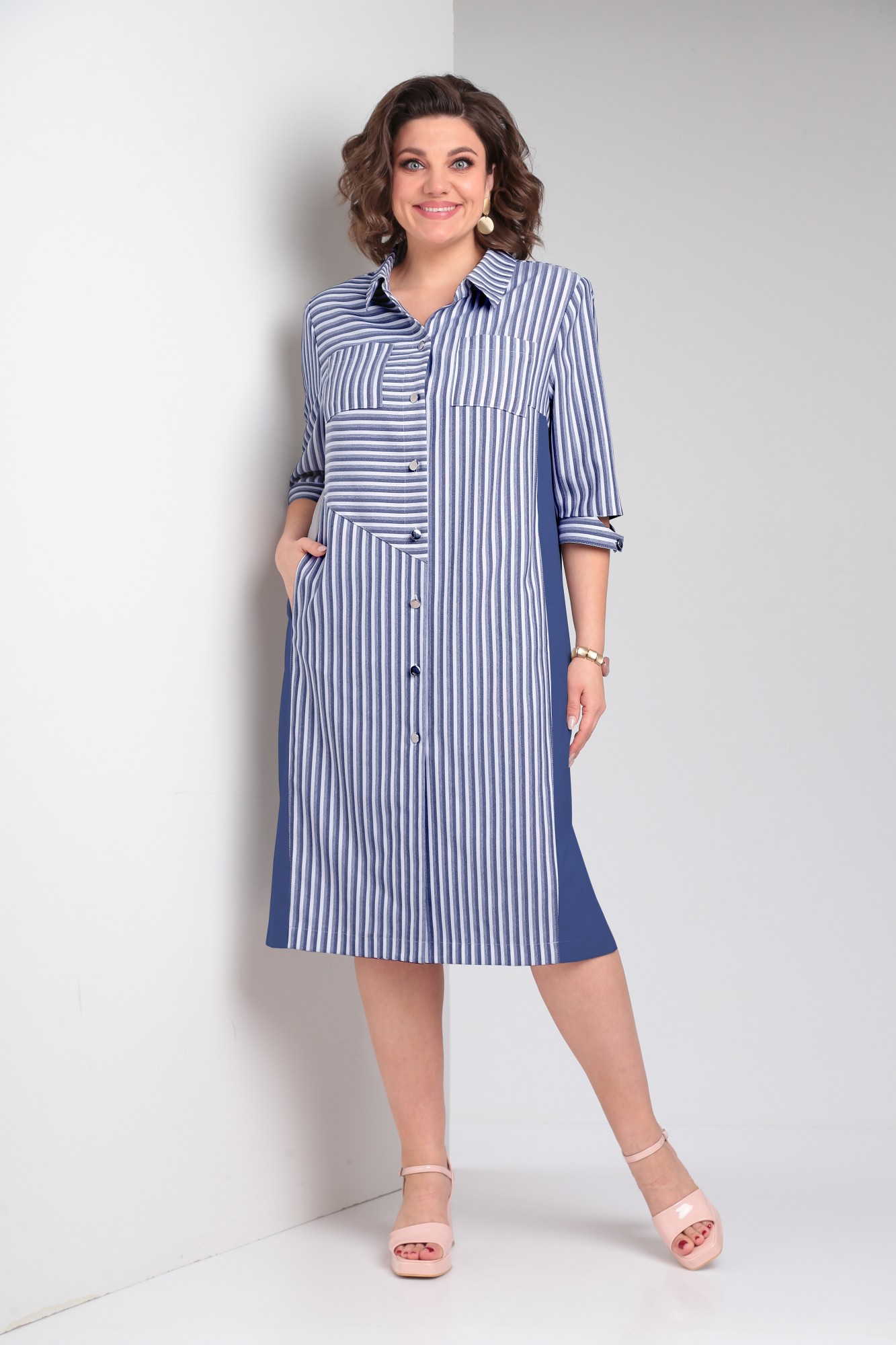 Стильное платье-рубашка прямого силуэта, выполненное из однотона и ткани в полоску. Свободный крой придает лёгкость и естественность модели.