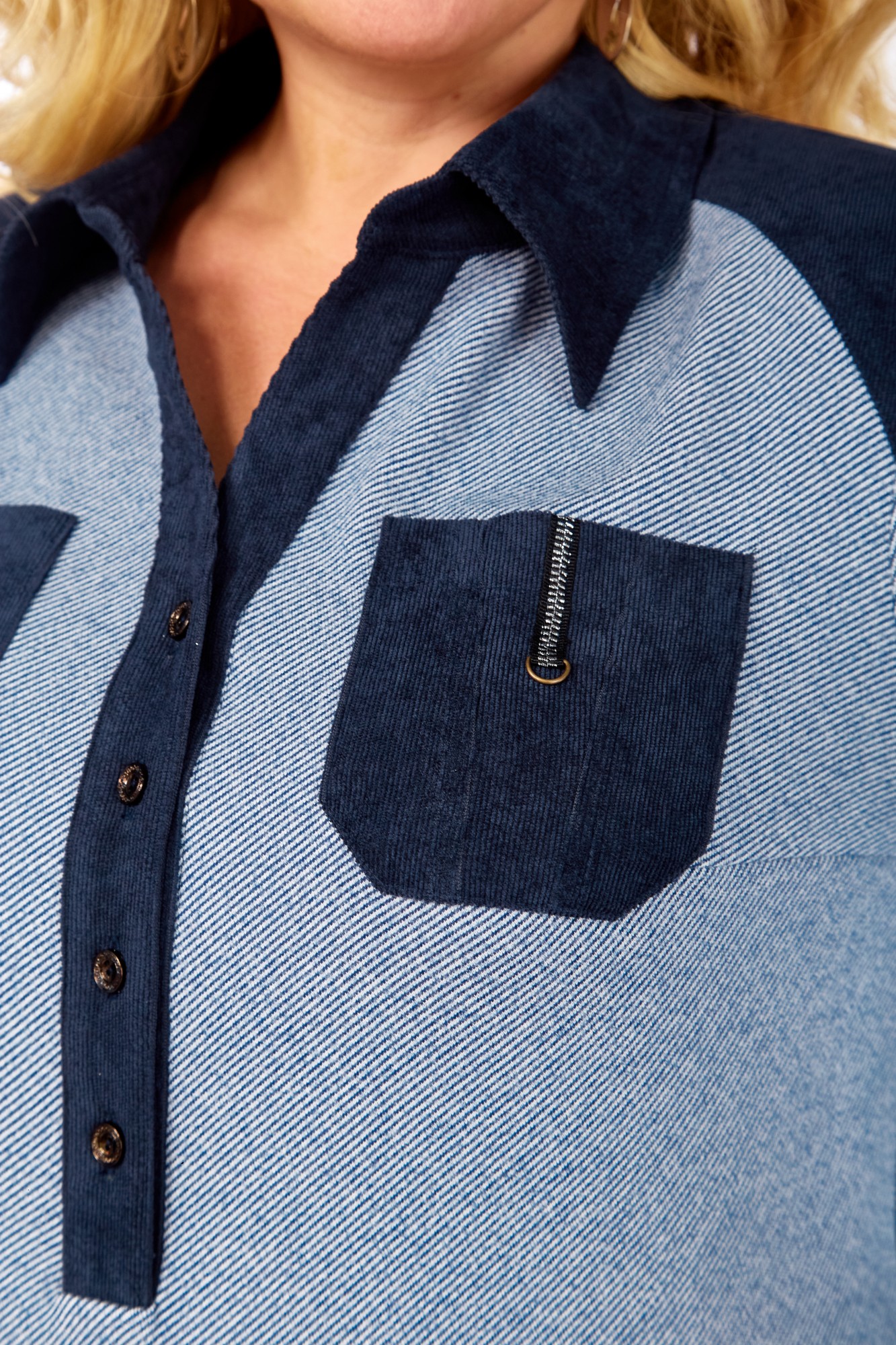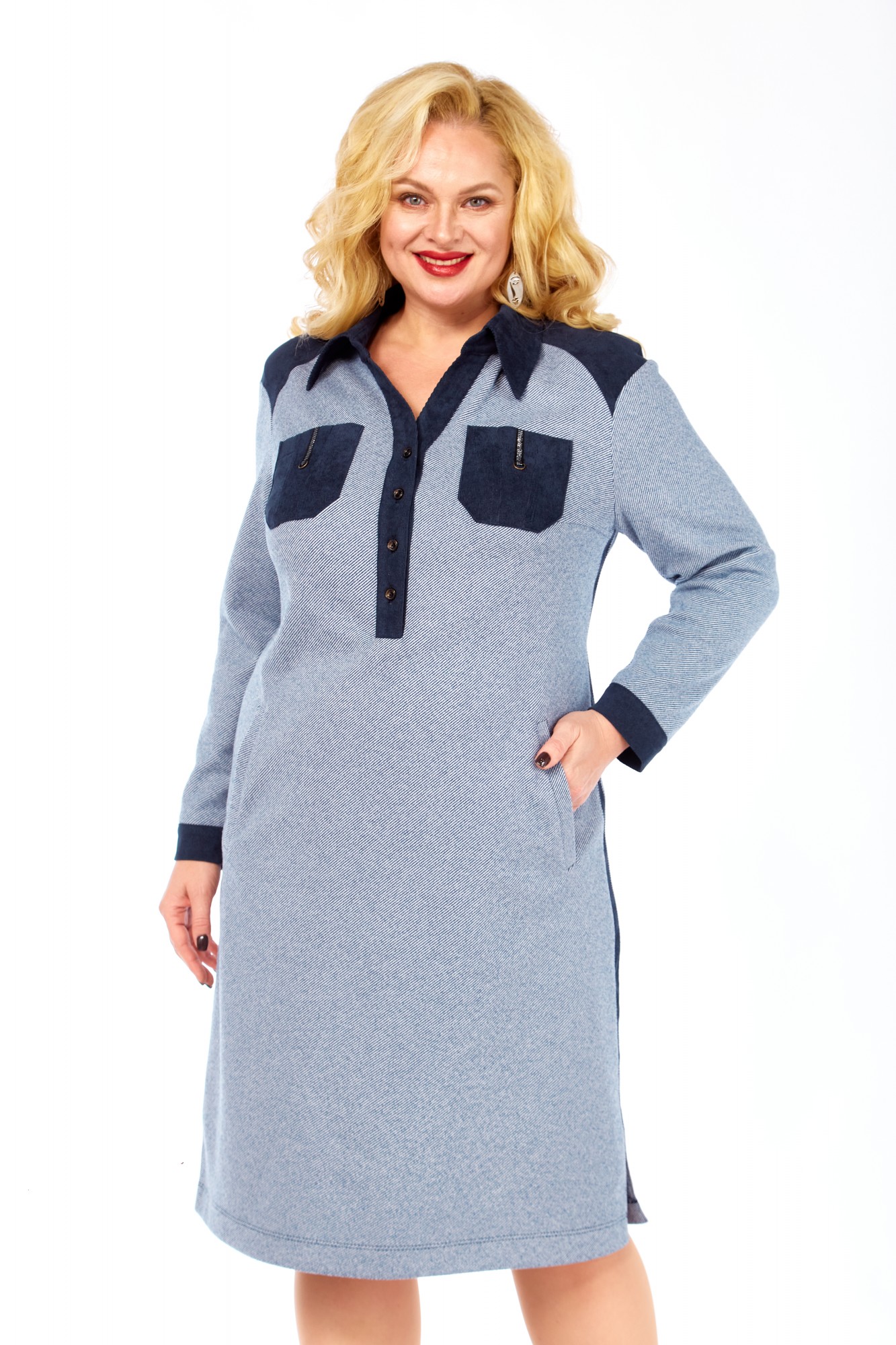 На переде обработаны наклонные кокетки, накладные карманы, декорированные отделочной тесьмой, карманы с листочками, застёжка-планка на 4 петли и пуговицы. Платье имеет спущенную линию плеча. Спинка с кокеткой, средним швом и вытачками. Вдоль боковых швов обработаны отделочные вставки, по низу разрезы. Рукав спущенный, длинный с отделкой по низу. Воротник стояче-отложной со стойкой.