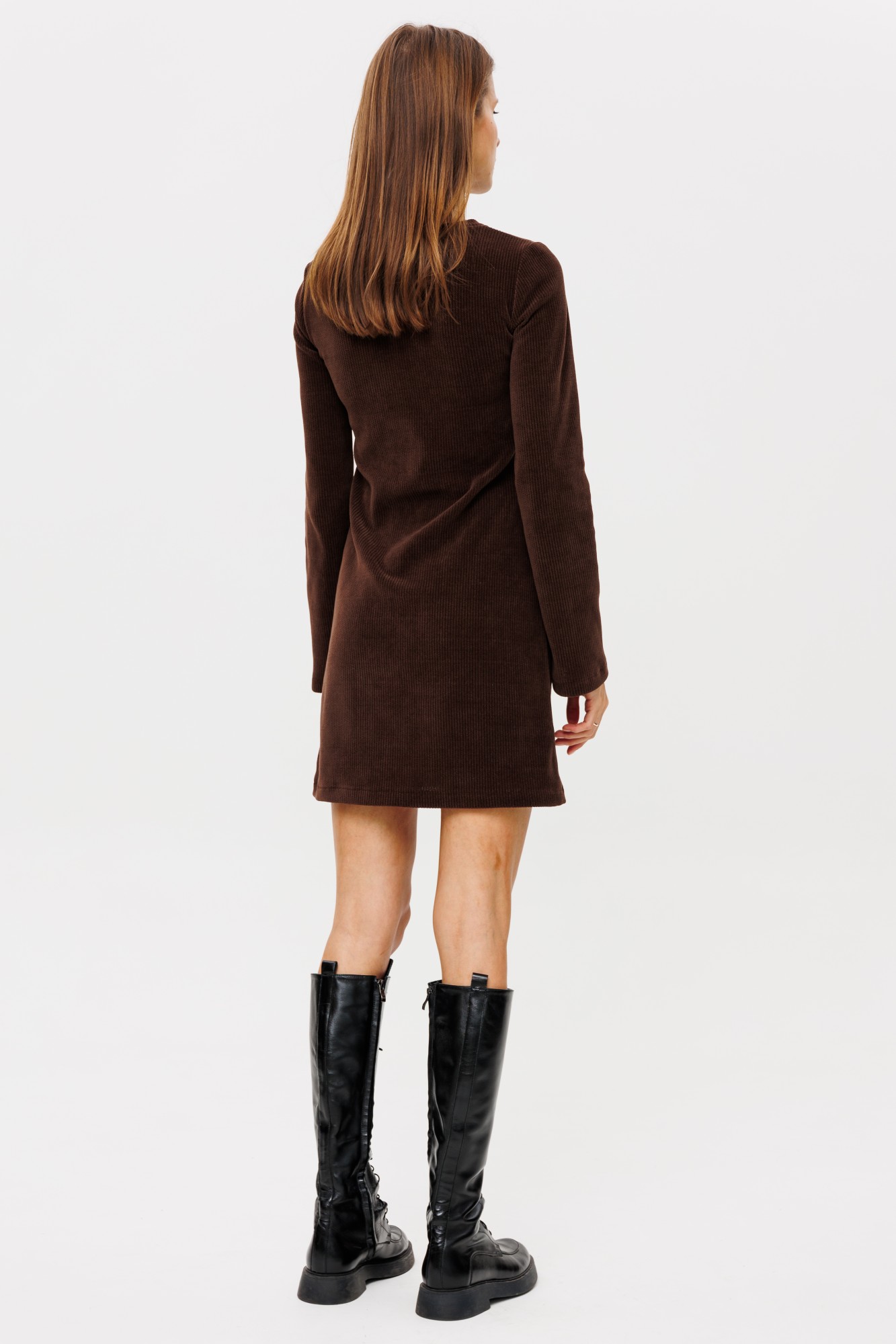 Платье полуприлегающего силуэта выполнено из мягкой трикотажной вельветовой ткани в шоколадном цвете. Рукав расклешенный, можно сочетать даже с брюками из нашей коллекции из экокожи, станет незаменимым в любой сезон. Отлично смотрится с кедами, обувью на высоком каблуке, высокими сапогами. Длина по спинке 85см, рукав 64 см в 42-м размере.