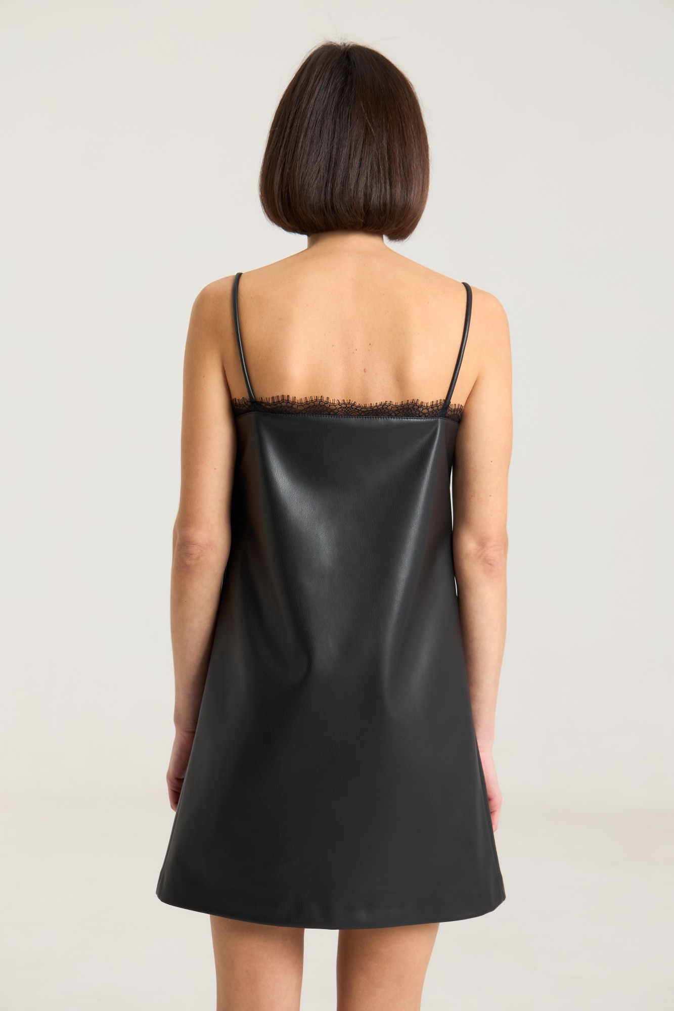 Платье полуприлегающего силуэта на бретелях выполнено из мягкой экокожи черного цвета, платье на подкладке, крой свободный, по груди выточки. По верху настроечное кружево. Платье можно сочетать как самостоятельный предмет гардероба, там и с рубашками, блузами, топами или футболками.