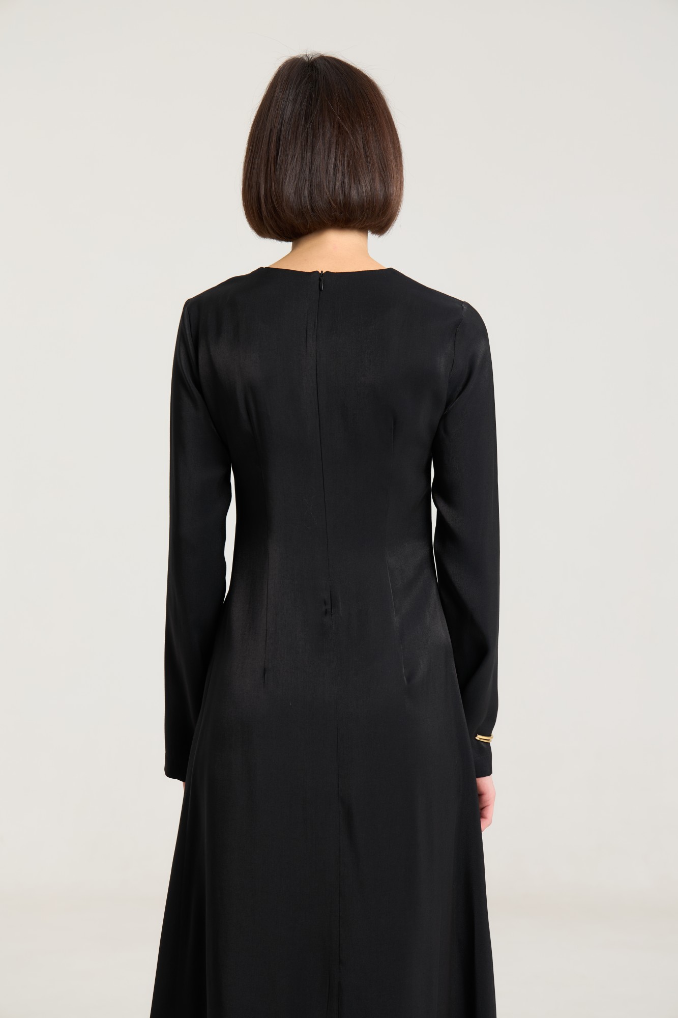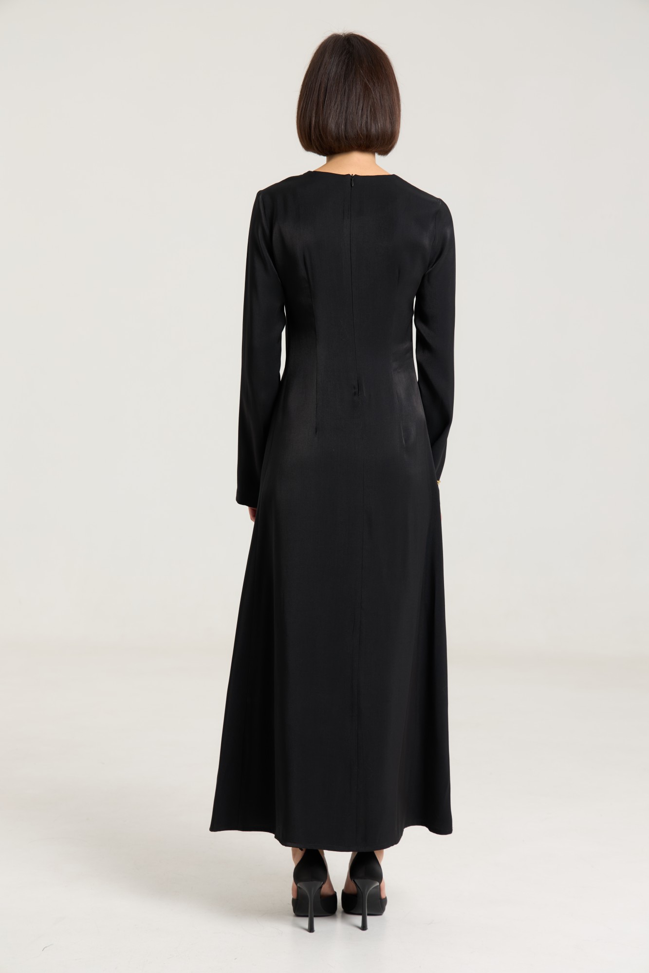 Платье в длине макси в черном цвете , полуприлегающего силуэта, расклешенное к низу, застежка в среднем шве на потайную молнию. Рукав втачной, прямой, по спинке таллиевые выточки, по переду нагрудные выточки. Выполнено из легкой ткани с блеском, очень красиво переливается и придает образу изысканность и лоск. Платье без подкладки.