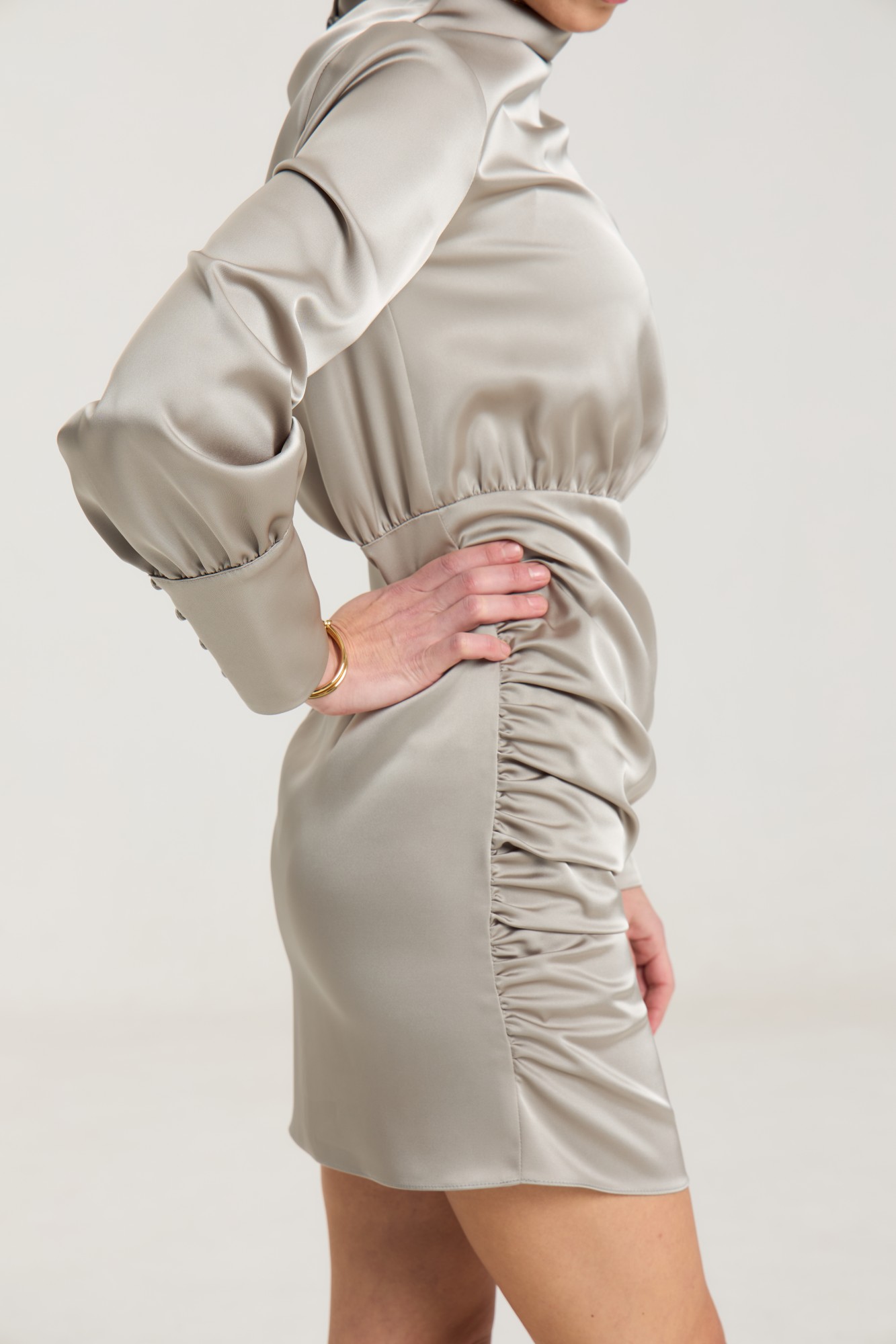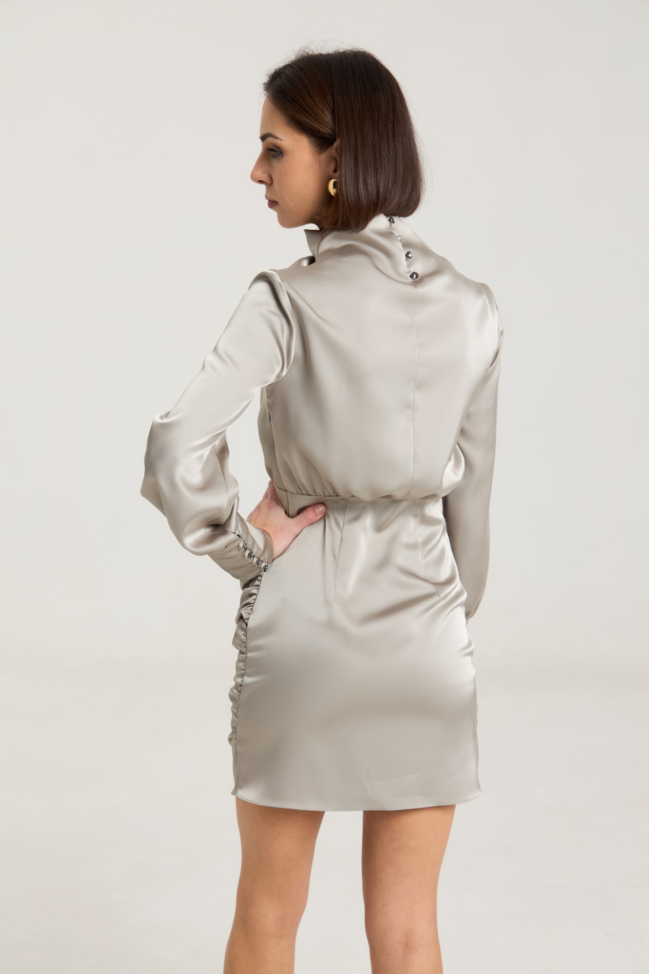 Платье с драпировкой, талия отрезная, прилегающего силуэта, рукав втачной, с высокой манжетой с застежкой на петли-пуговицы. Воротник цельнокроеный, стойка, в боковом шве застежка на молнию, на горловине застежка на петли-пуговицы. Платье без подкладки, выполнено из плотной атласной ткани красиво подчеркивает фигуру.