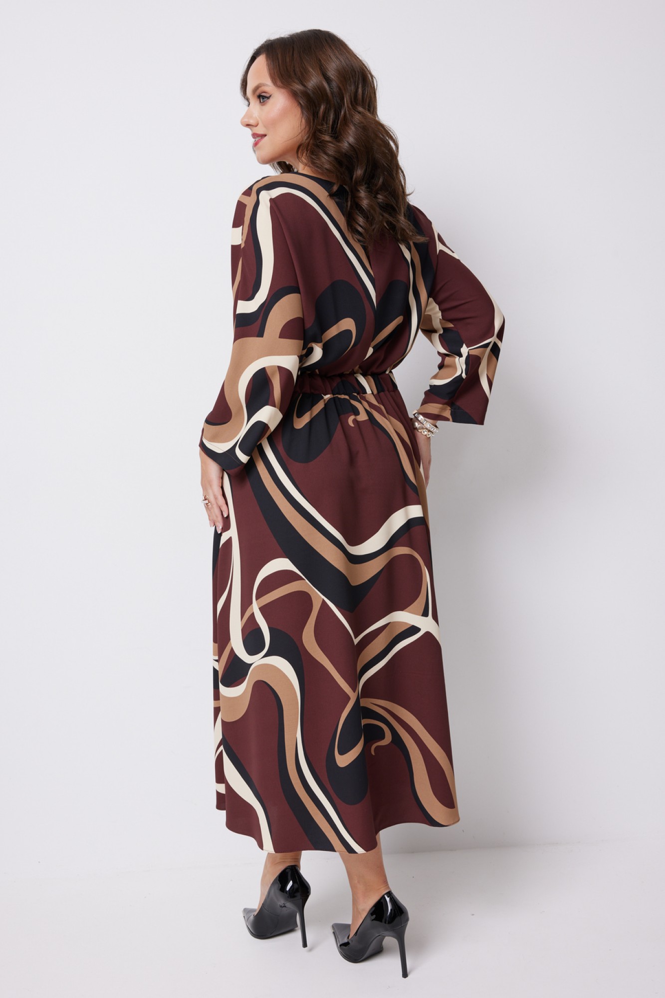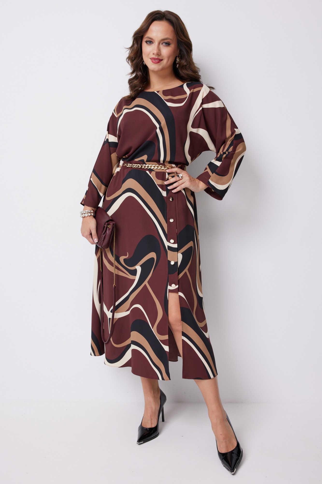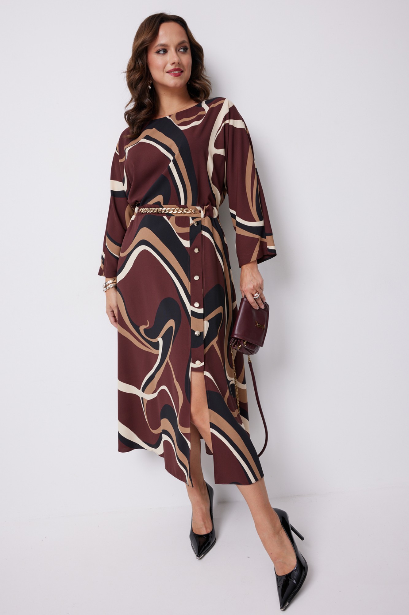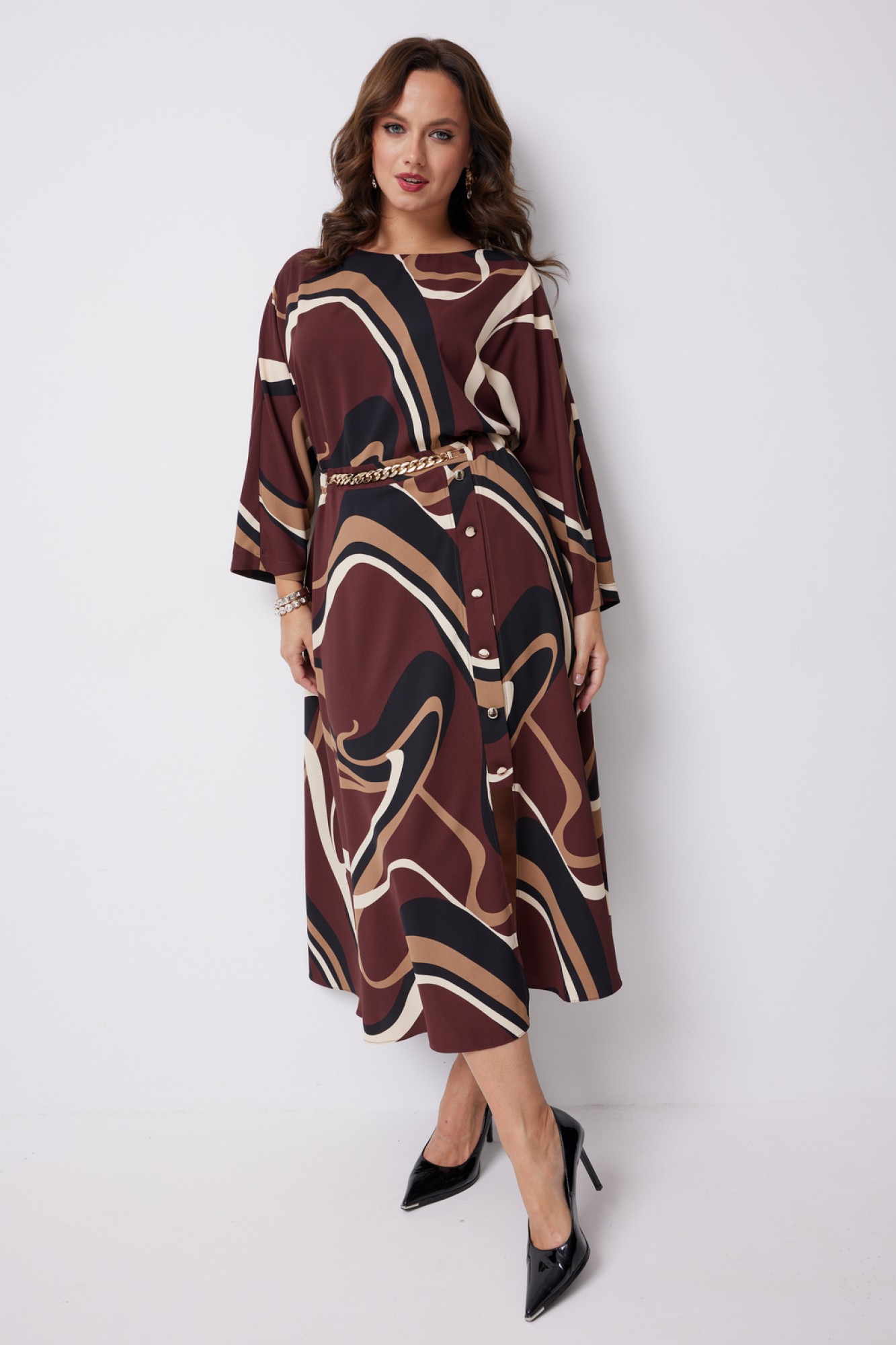 Стильное платье А-силуэта, выполненное из вискозы с оригинальным принтом. Платье отрезное по линии талии. Верхняя часть переда платья с круглой горловиной, спинка - со средним швом и капелькой, застегивающейся на навесную петлю и пуговицу. Рукав цельнокроенный, длиной 7/8. Нижняя часть платья покроя полусолнце. На одной из сторон юбки переда обработана отделочная планка с декоративными пуговицами, внизу - разрез. В боковых швах в области бедер обработаны карманы. В центральной части переда в области талии - притачной пояс со съемной декоративной цепью, которая изящно подчеркивает линию талии. По боковым швам и спинке пояса вставлена широкая резинка.