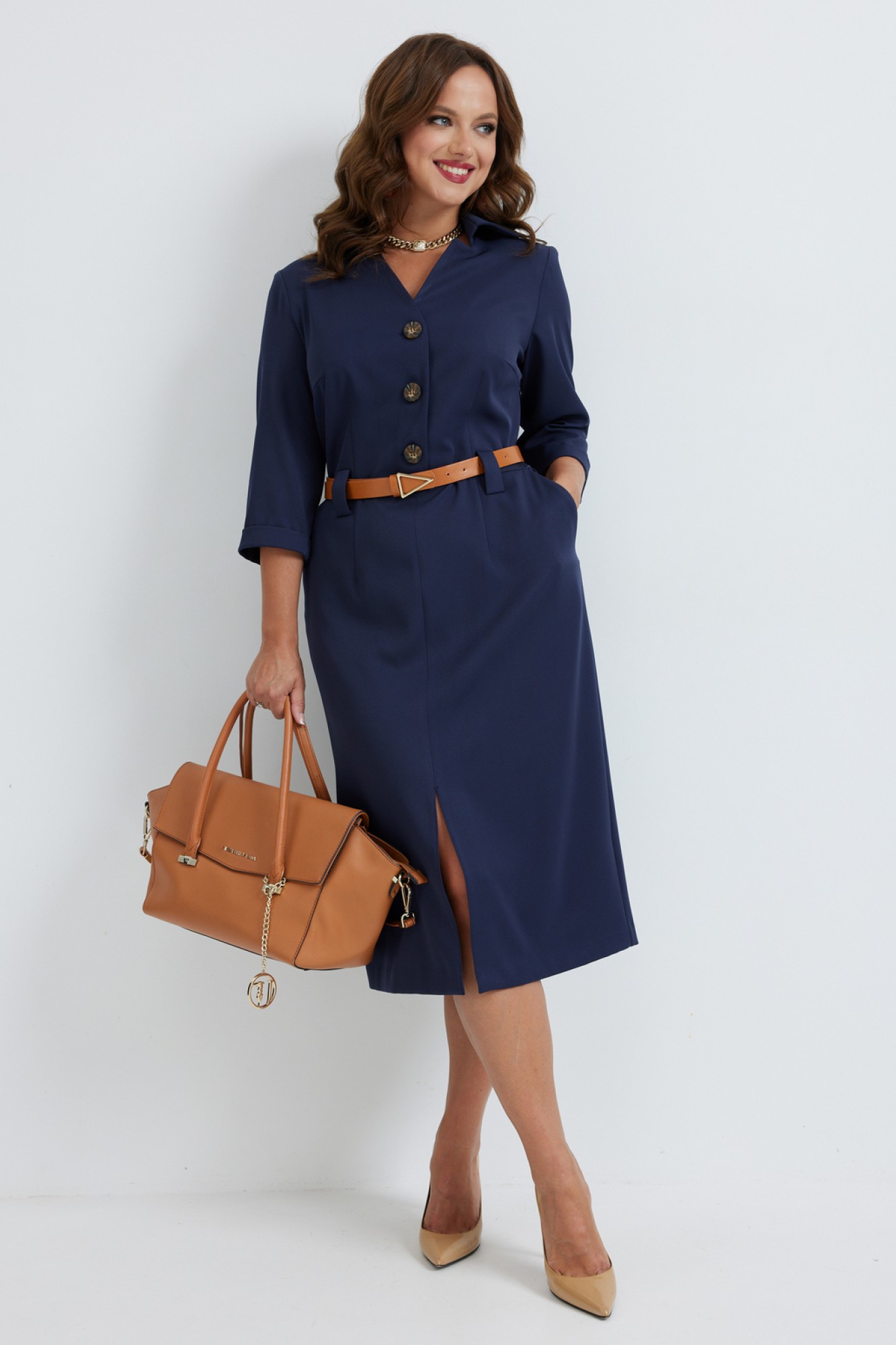 Платье полуприлегающего силуэта, выполненное из плательной поливискозы, длиной "миди". Платье отрезное по линии талии, с центральной застёжкой на петли и пуговицы. Верхняя часть переда платья с фигурной V-образной горловиной, оформленной воротником рубашечного типа. Верхняя часть платья с нагрудными и талиевыми выточками. Нижняя часть переда платья с талиевыми вытачками и со средним швом, внизу которого обработан разрез. Спинка цельнокроеная с талиевыми вытачками. В боковом шве обработана потайная молния в области талии, в области бедер обработаны карманы. Рукав втачной, с цельнокроеной манжетой, длиной 3/4. В комплект к платью входит контрастный ремень с декоративной пряжкой.