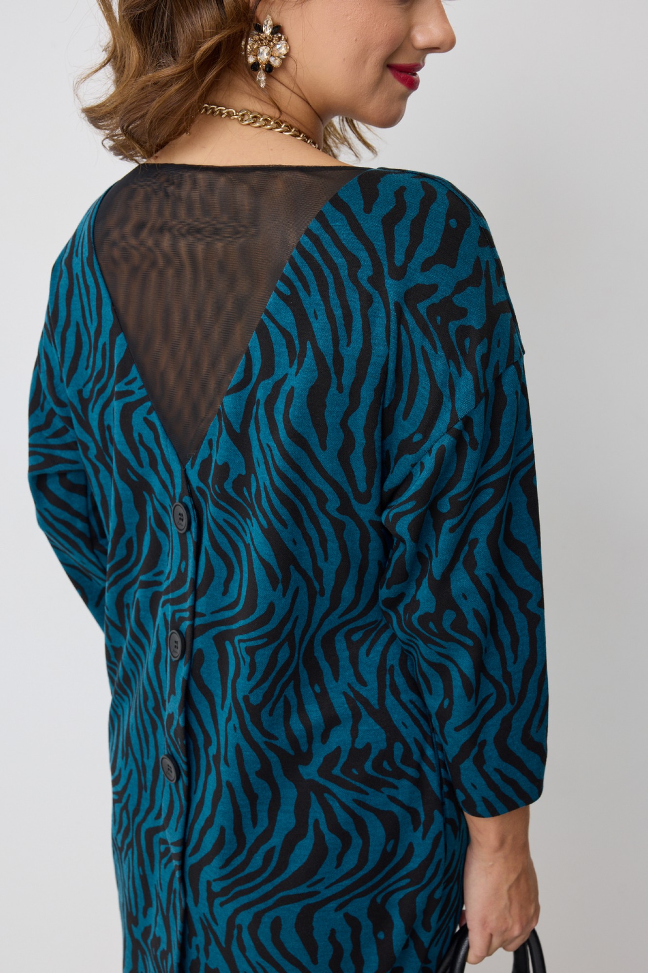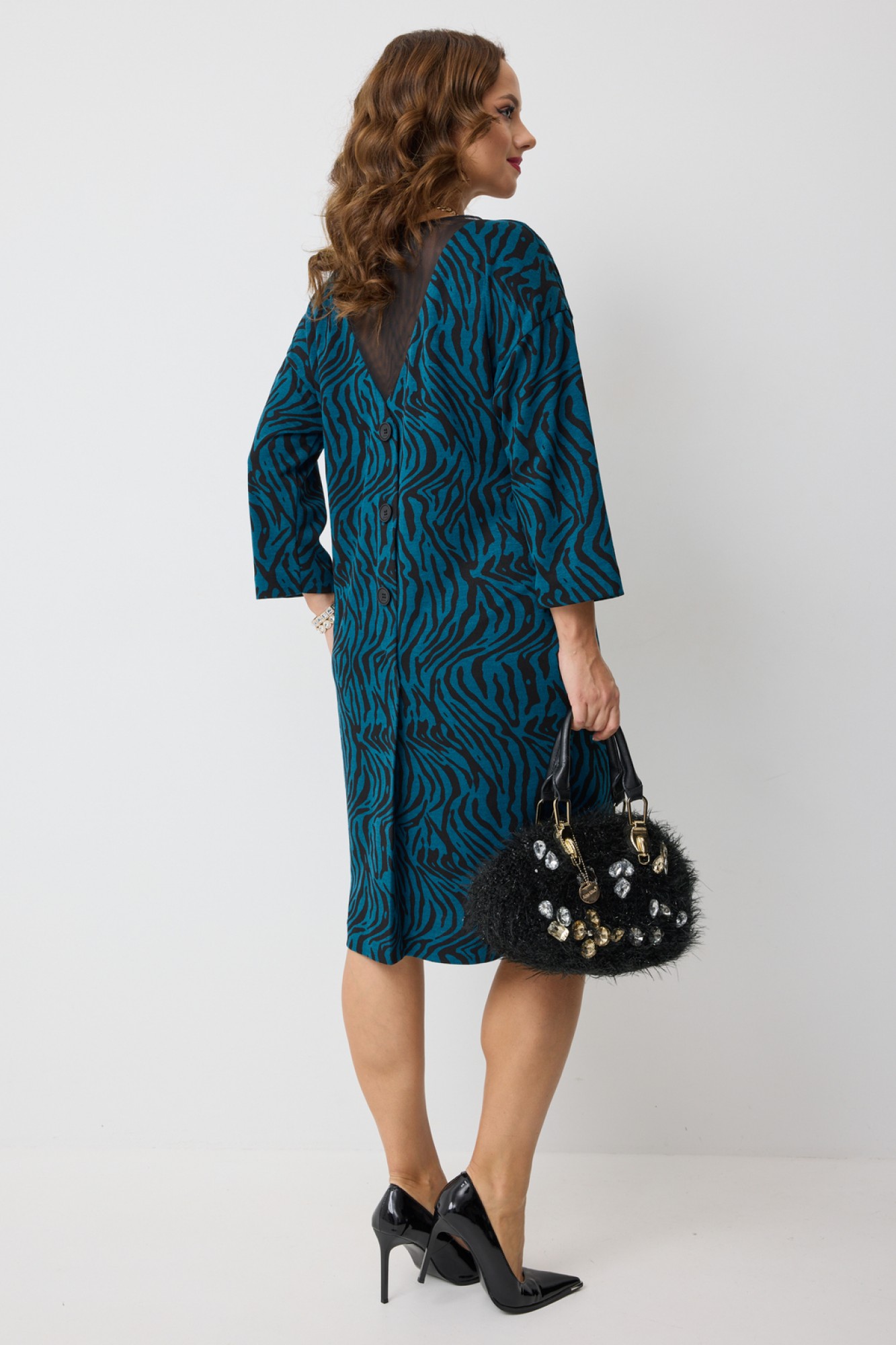 Платье полуприлегающего силуэта, длиной миди, со спущенной линией плеч, выполненное из поливискозного трикотажного полотна с анималистичным принтом. Перед с нагрудными вытачками и круглой формой горловины. Спинка с центральной складкой, имитирующей планку, с декоративными пуговицами. В верхней части спинки платья - декоративная вставка V-образной формы из двойной сетки. Рукав втачной одношовный длиной 3/4. Такое невероятно красивое и стильное праздничное платье прекрасно подойдет осенью и зимой для праздника, в ресторан, в офис, для вечеринки, для прогулки, для отдыха, для свадьбы, на каждый день для высоких и для невысоких девушек и женщин. В таком стильном наряде вы не останетесь незамеченной и будете в центре внимания!