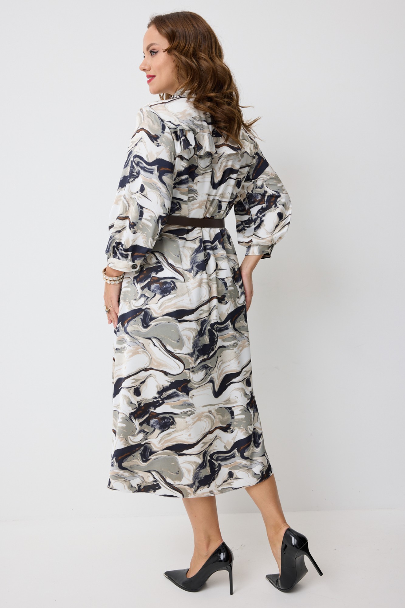Платье А-силуэта, на подкладке, длиной мидакси, выполненное из плательной вискозы с принтом ""волны"". Платье на трикотажной подкладке. Горловина платья оформлена воротником рубашечного типа. Перед платья с центральной застёжкой на петли и пуговицы, расположенной до линии талии. По переду обработаны нагрудные вытачки. В верхней части переда косые встречные кокетки с декоративными воланами. В боковых швах обработаны карманы. Рукав втачной одношовный, длиной 3/4, низ рукава на притачной манжете, которая застёгивается на петлю и пуговицу. По верхней части спинки кокетка с воланом, нижняя часть - цельнокроеная.