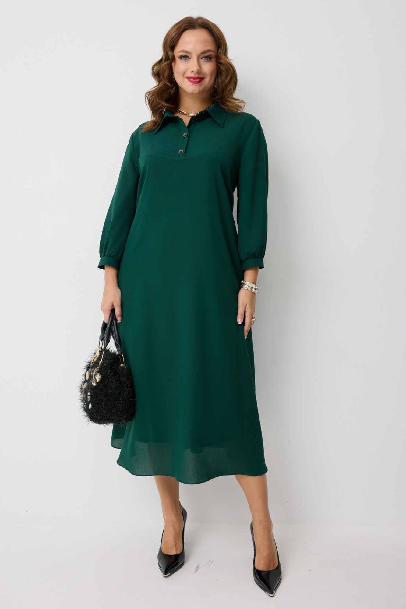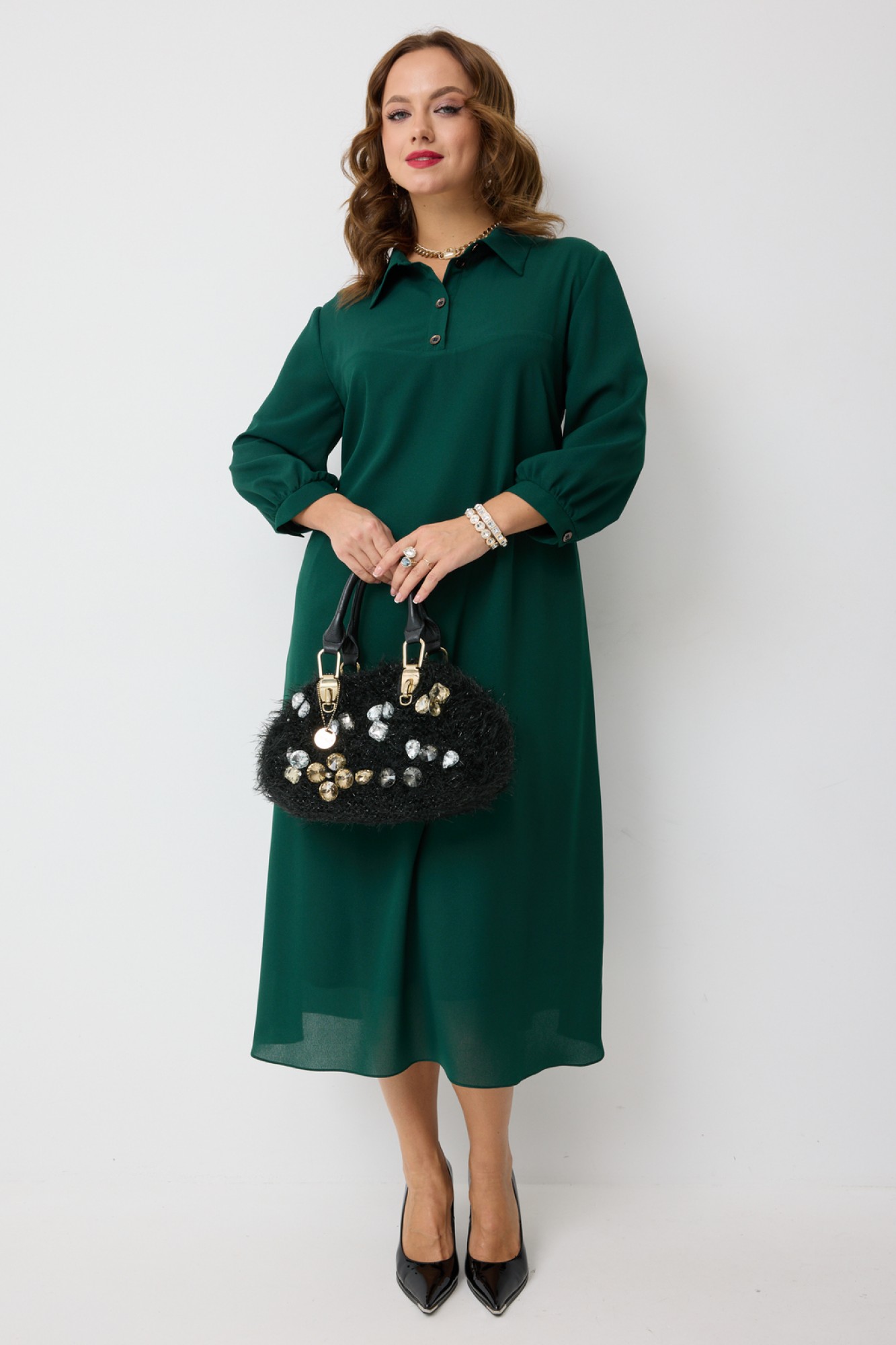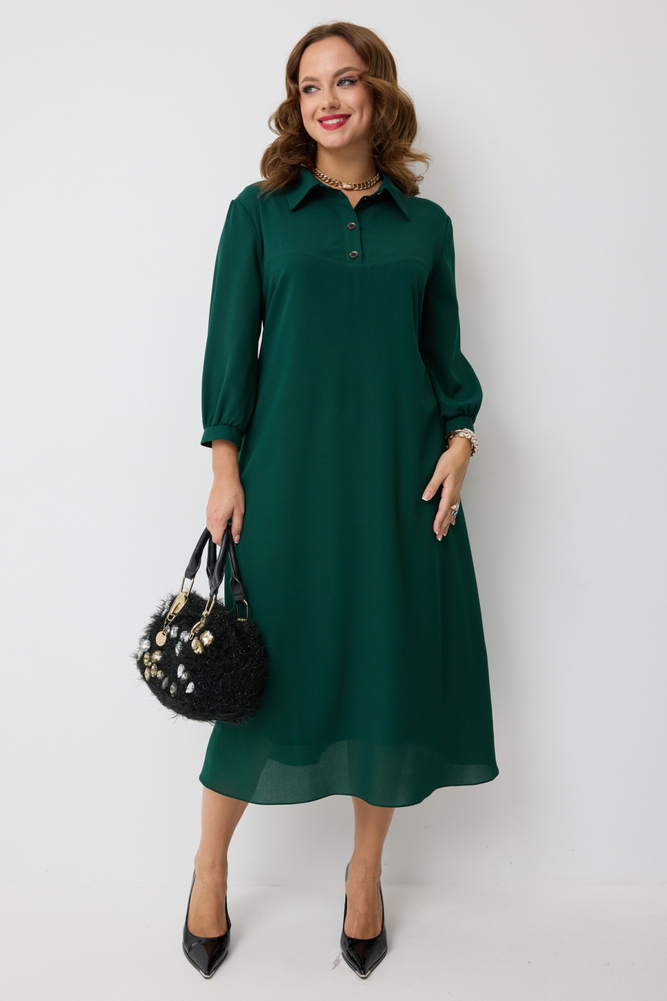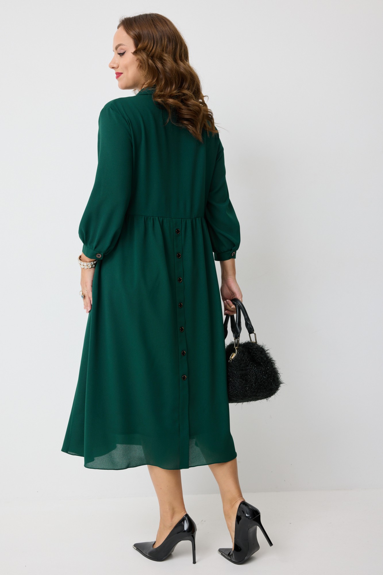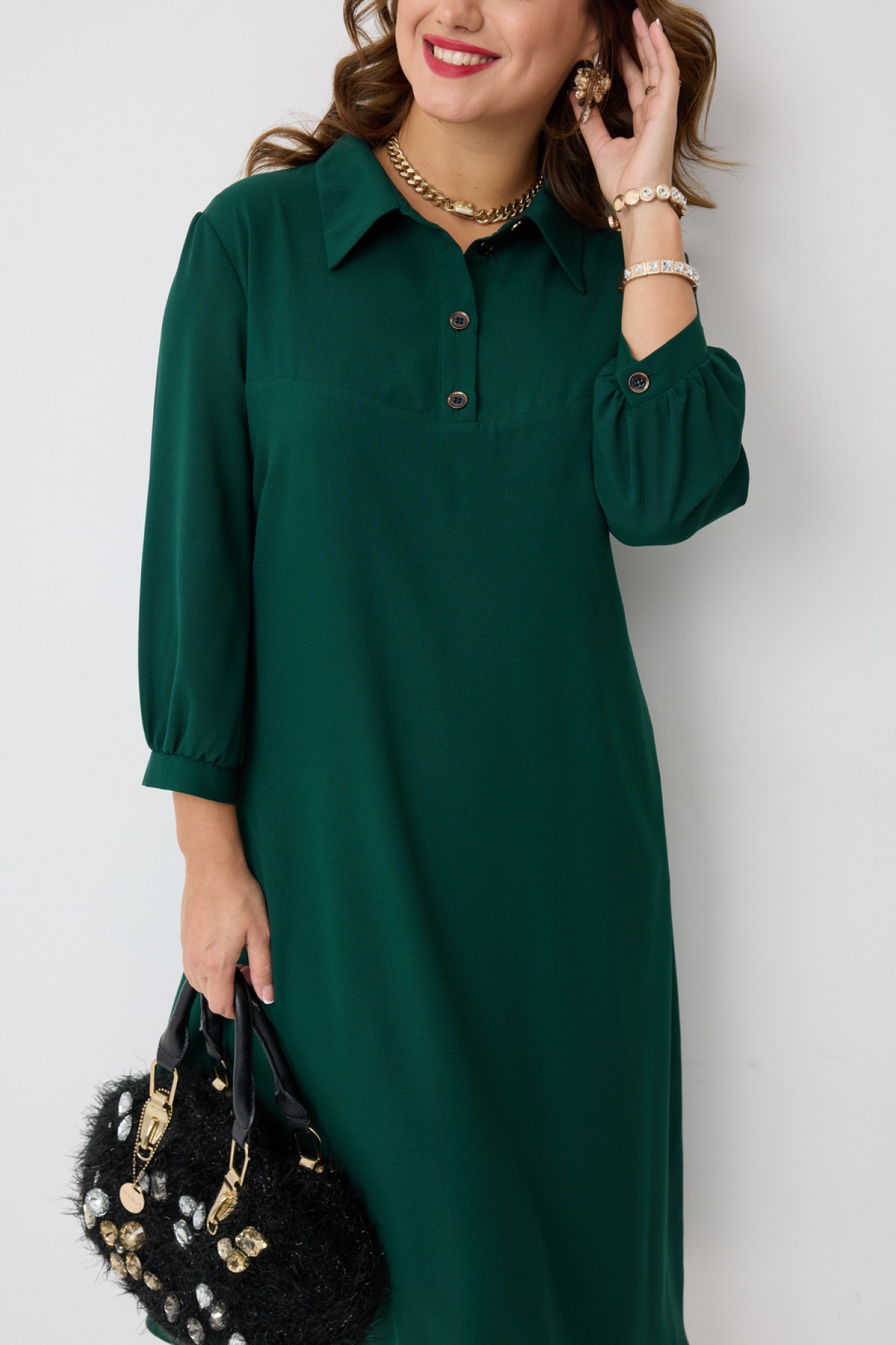 Платье А-силуэта, длиной мидакси, выполненное из креп-шифона на трикотажной подкладке. Перед состоит из фигурной кокетки и нижней части. В центральной части кокетки обработана планка с застёжкой на петли и пуговицы. Перед с нагрудными вытачками. Спинка платья состоит из верхней и нижней части. Нижняя часть - на сборке, по центру обработана планка-""обманка"", с декоративными пуговицами. Горловина платья оформлена воротником рубашечного типа. Рукав втачной одношовный, по низу на сборке и притачной манжете, которая застёгивается на петлю и пуговицу. В области бедер, в боковых швах обработаны карманы.