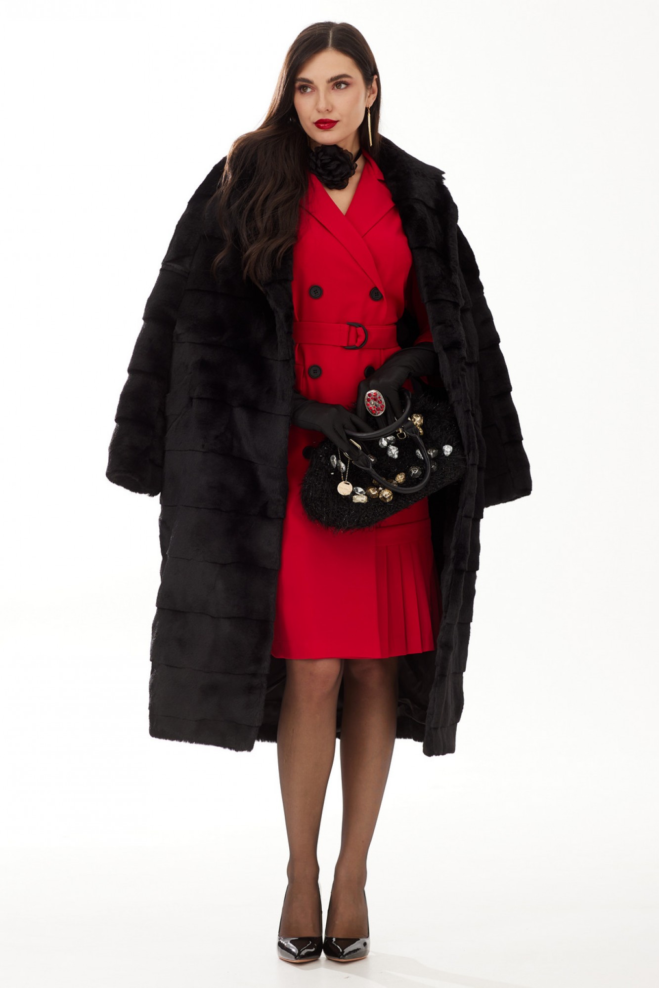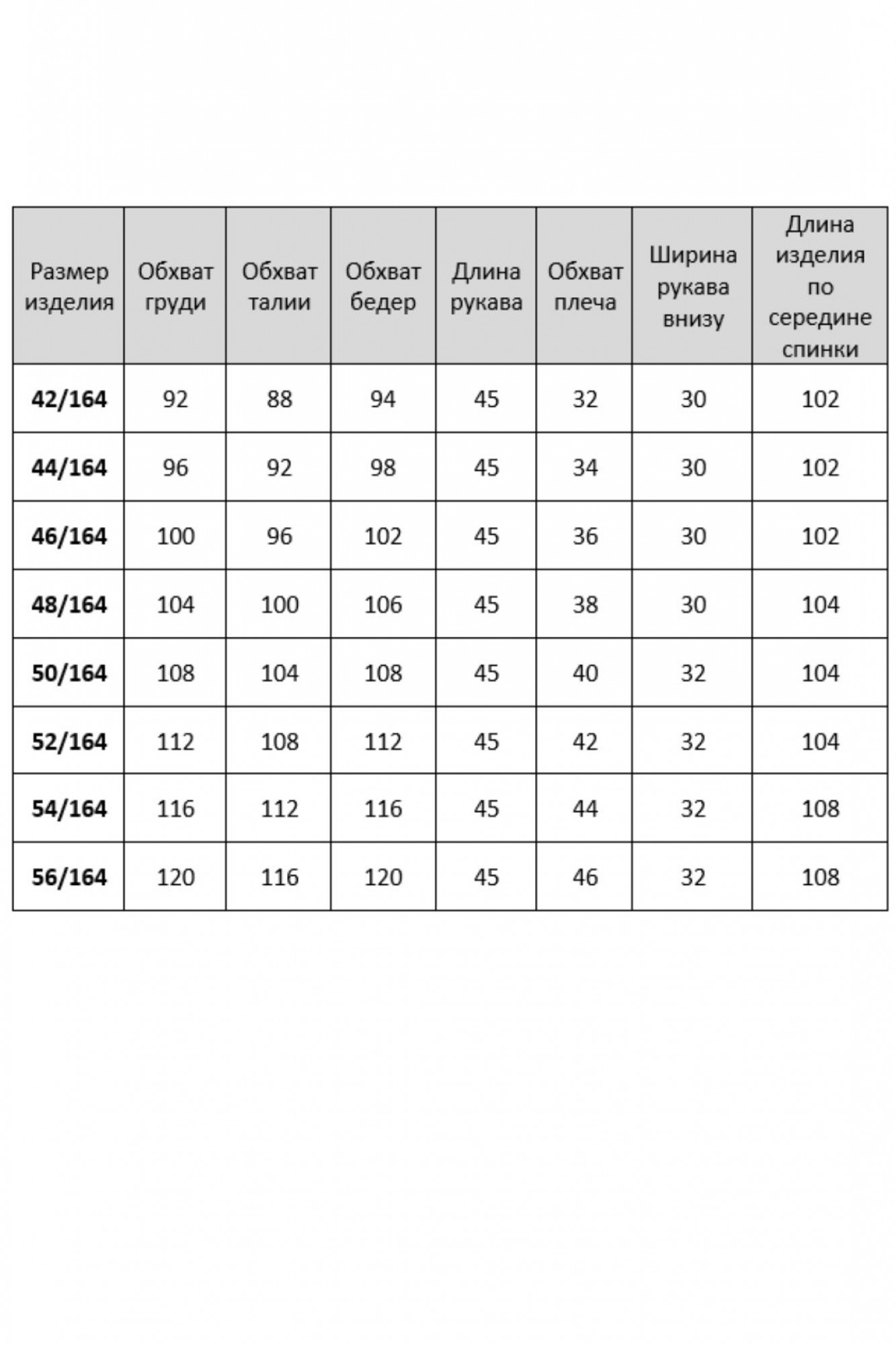 Платье женское полуприлегающего силуэта с двухбортной застёжкой на петли и пуговицы. По переду расположены нагрудные вытачки. На левой части переда - горизонтальный подрез с планкой. Нижняя часть оформлена заутюженными складками, направленными к боковому шву. По правой части переда, в области бедер, расположен горизонтальный прорезной карман с листочкой и клапаном. Спинка цельная с вертикальными талиевыми вытачками. Рукав двухшовный, длиной 3/4, с манжетой по низу рукава. Горловина платья оформлена воротником жакетного типа. В комплект к платью идёт пояс из основной ткани с декоративной пряжкой.