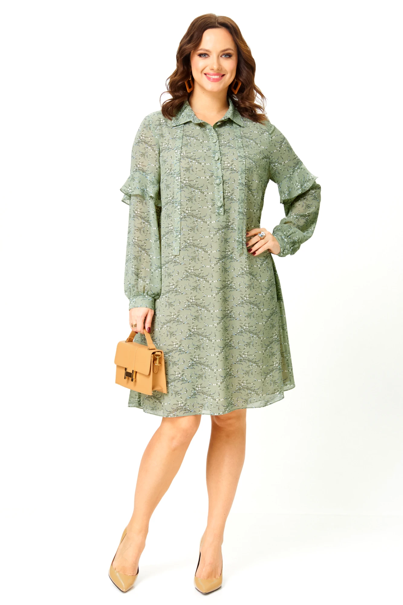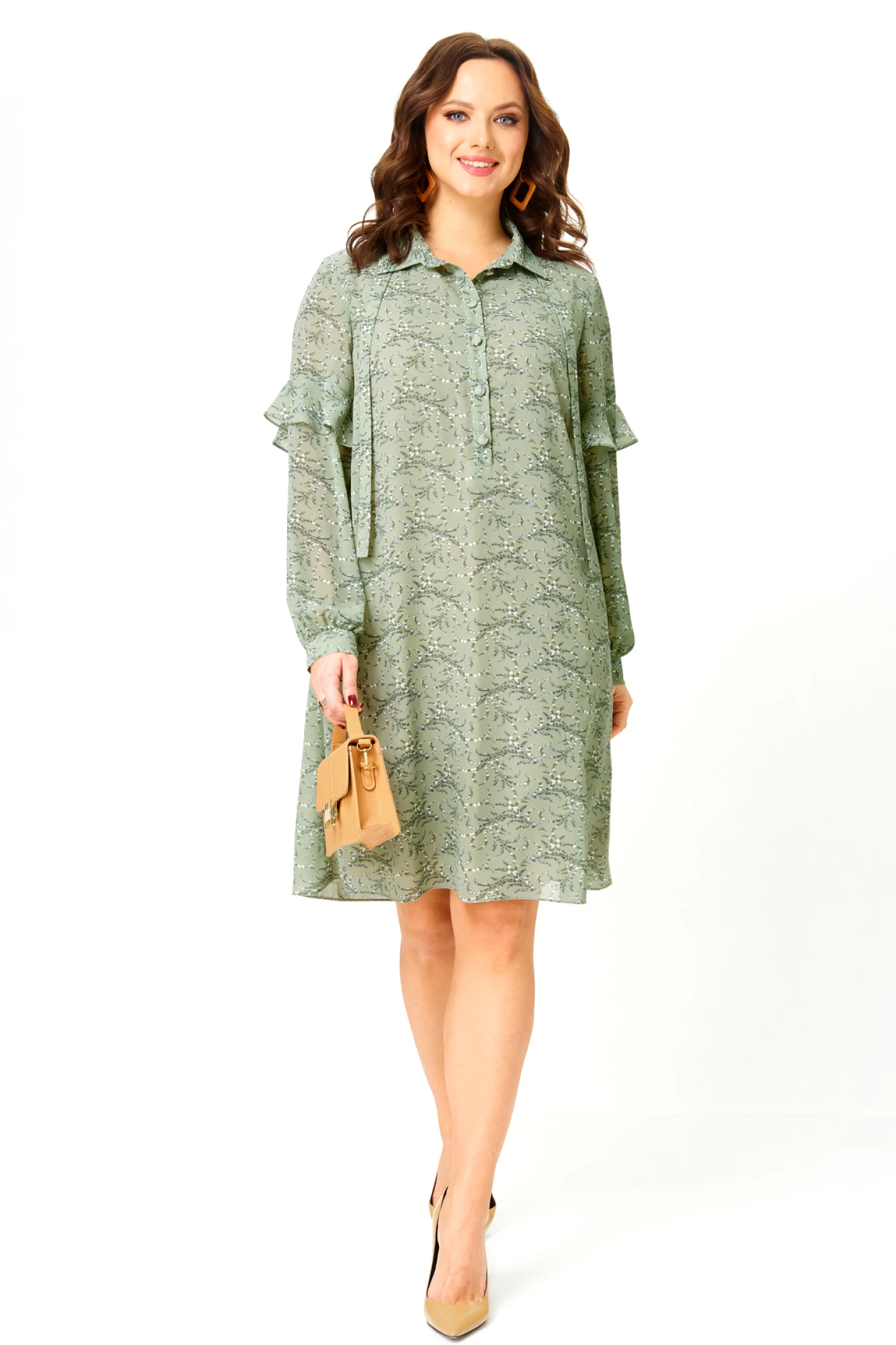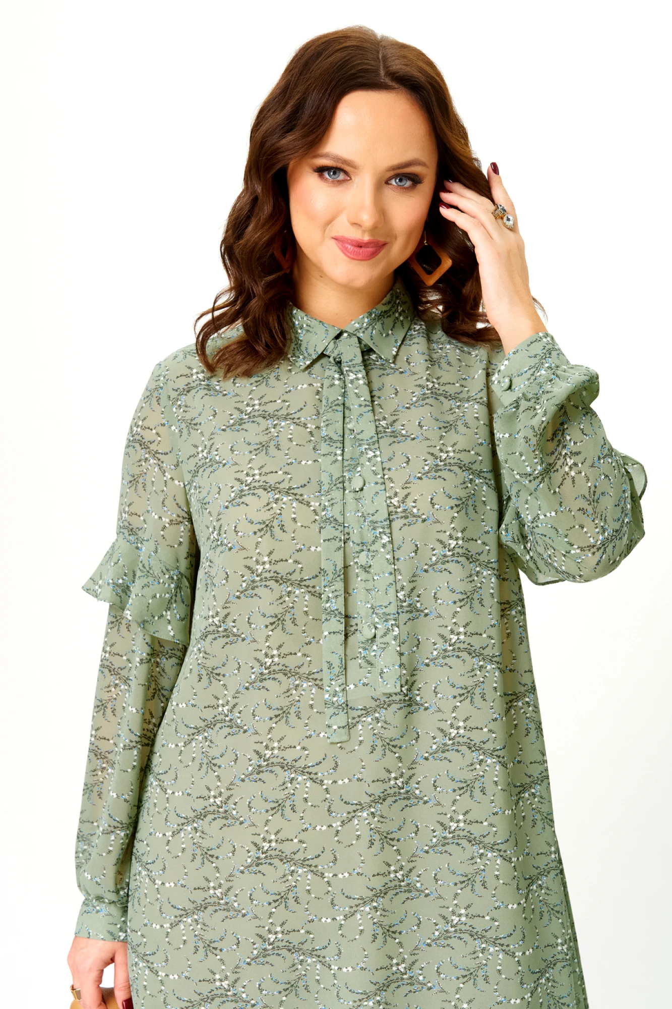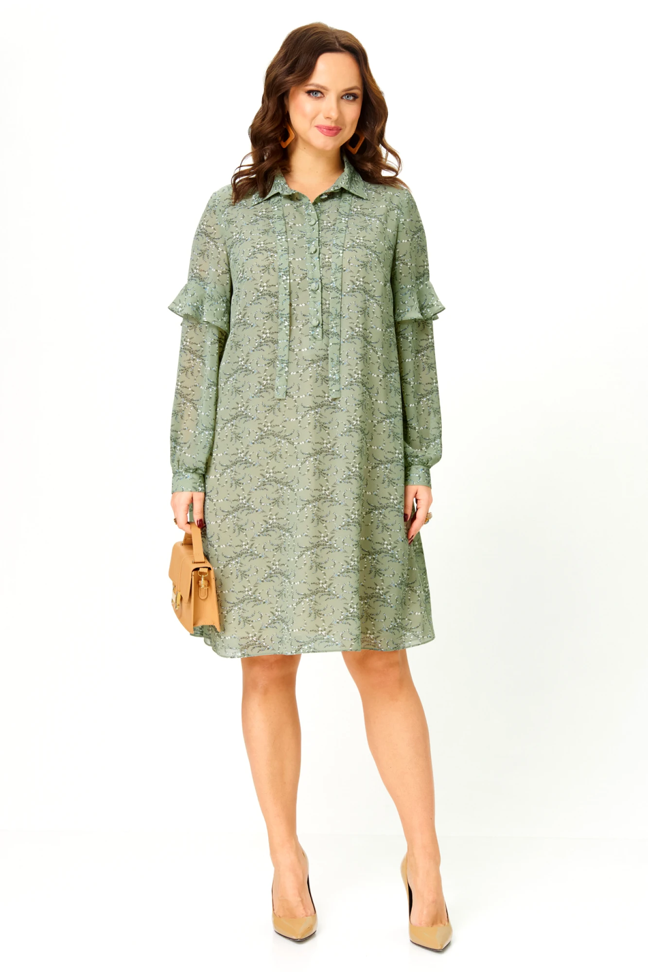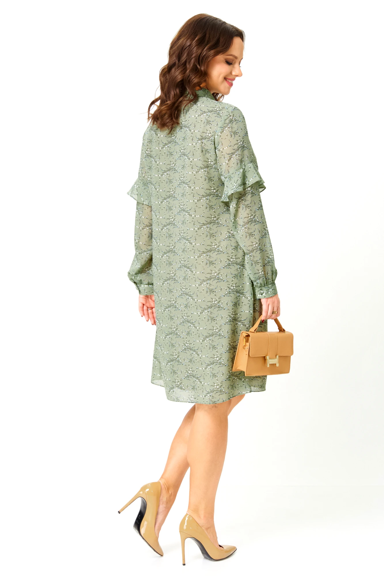 Платье прямого силуэта, длиной ""миди"", выполнено из итальянского шифона. Перед и спинка платья цельнокроеные. Перед с нагрудными выточками и центральной застёжкой до линии талии, на петли и пуговицы, на притачной планке. Горловина обработана воротником рубашечного типа. Под воротником закреплена завязка, которая может использоваться в качестве декоративного небольшого банта. Спинка лифа цельнокроеная. Рукав втачной, длинный, с приточной манжетой по низу рукава, которая застёгивается на петлю и пуговицу. Чуть выше линии локтя, по рукаву, обработан декоративный волан. В боковых швах платья обработаны карманы.