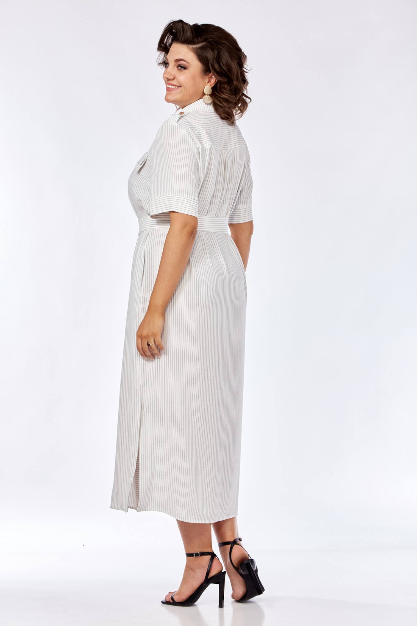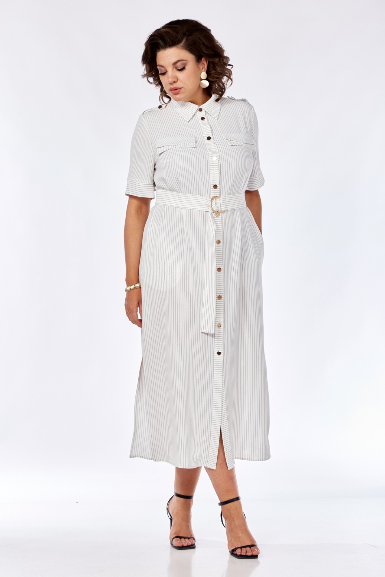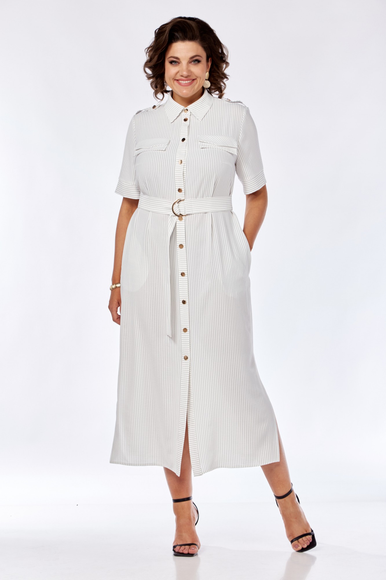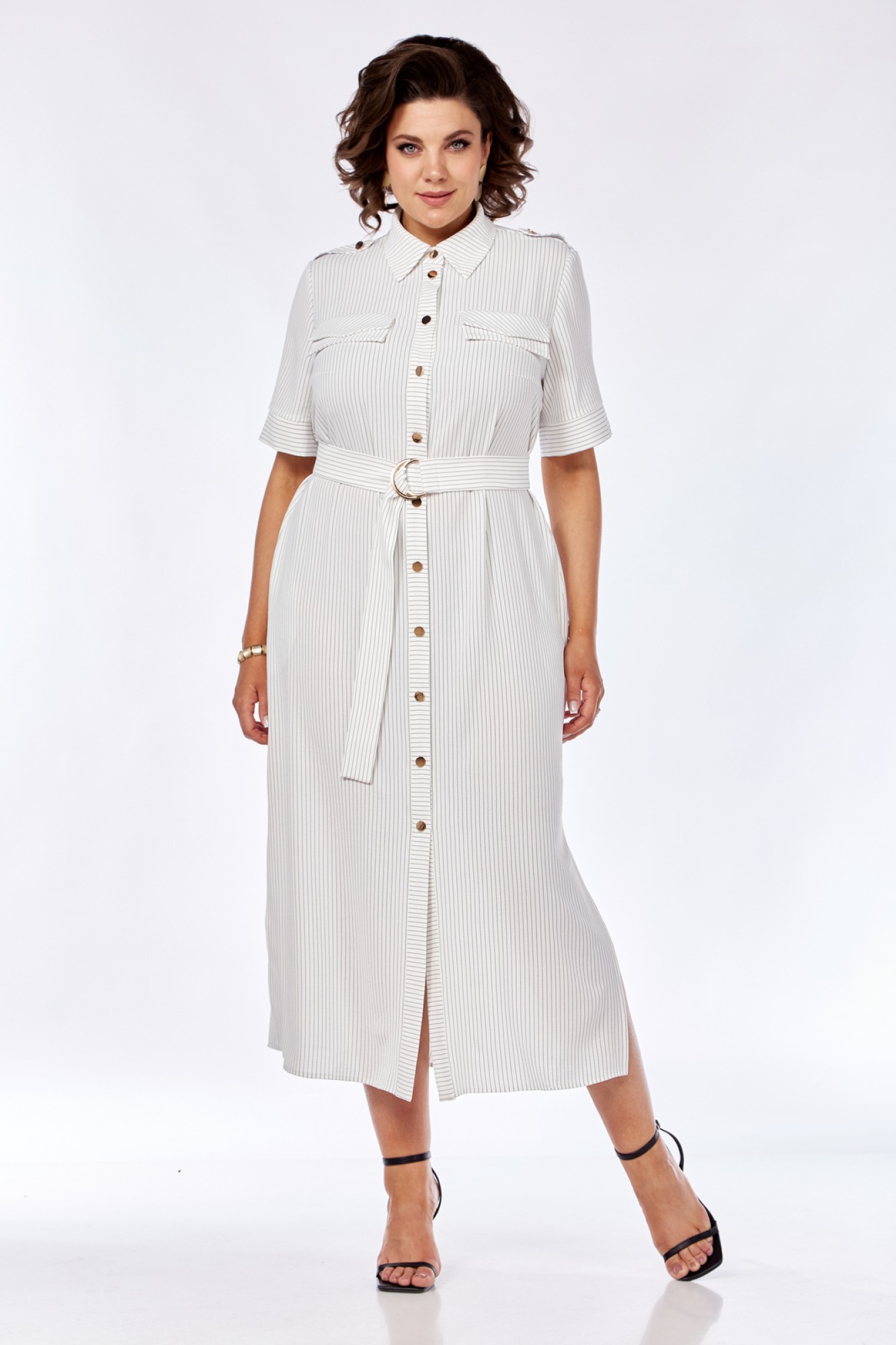 Платье женское прямого силуэта с естественной линией плеча. В боковых швах обработаны карманы и разрезы. По переду имеется отрезная планка и накладные клапаны сложного покроя. Центральная бортовая застежка на петли пуговицы. Спинка с отрезной кокеткой и легкой встречной складкой по центру. Воротник блузочный на отрезной стойке. Рукав короткий, втачной одношовный с манжетами. На плечах выполнены паты с пуговицами. Имеется навесной отделочный пояс.