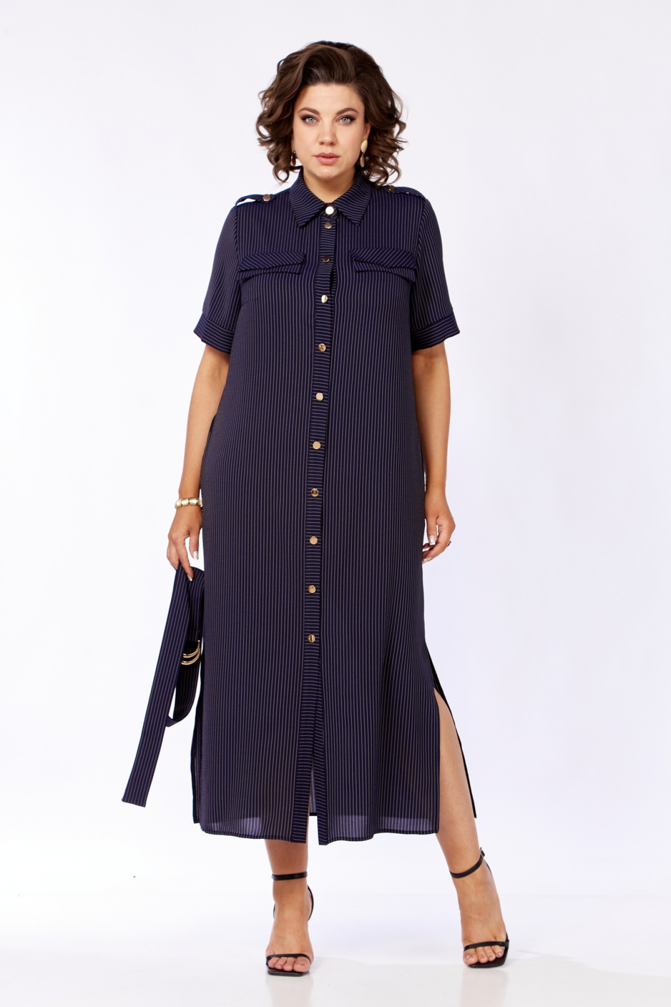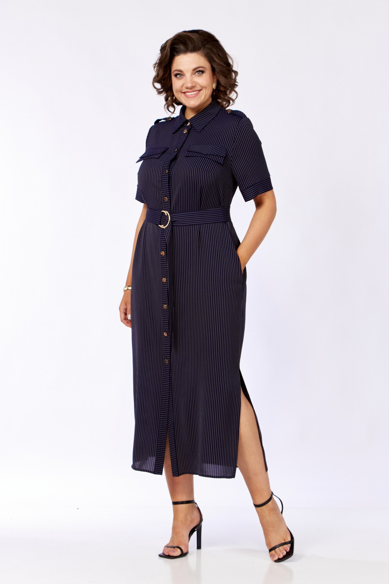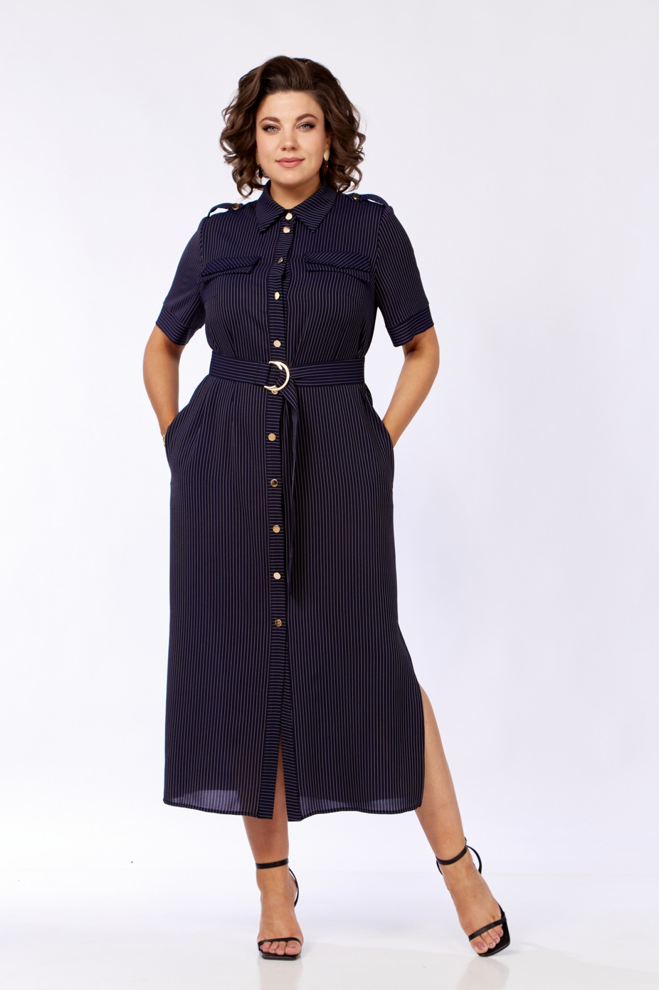 Платье женское прямого силуэта с естественной линией плеча. В боковых швах обработаны карманы и разрезы. По переду имеется отрезная планка и накладные клапаны сложного покроя. Центральная бортовая застежка на петли пуговицы. Спинка с отрезной кокеткой и легкой встречной складкой по центру. Воротник блузочный на отрезной стойке. Рукав короткий, втачной одношовный с манжетами. На плечах выполнены паты с пуговицами. Имеется навесной отделочный пояс.
