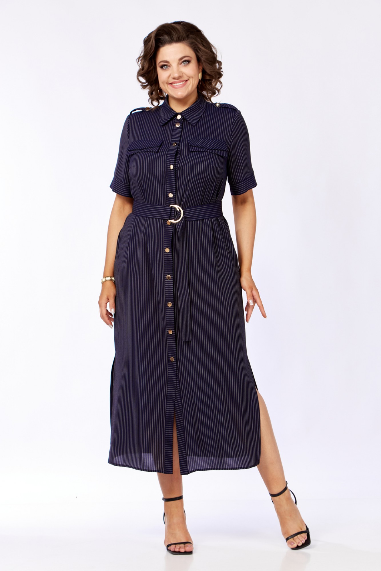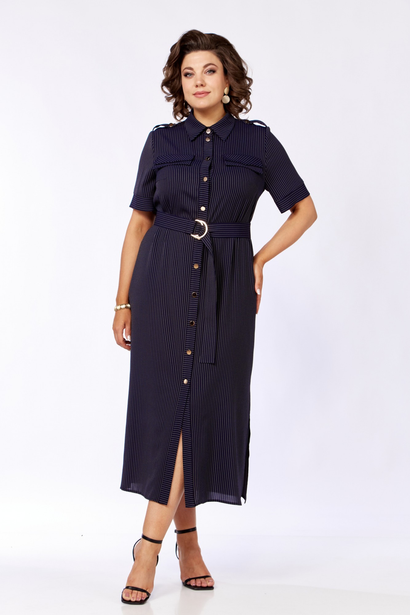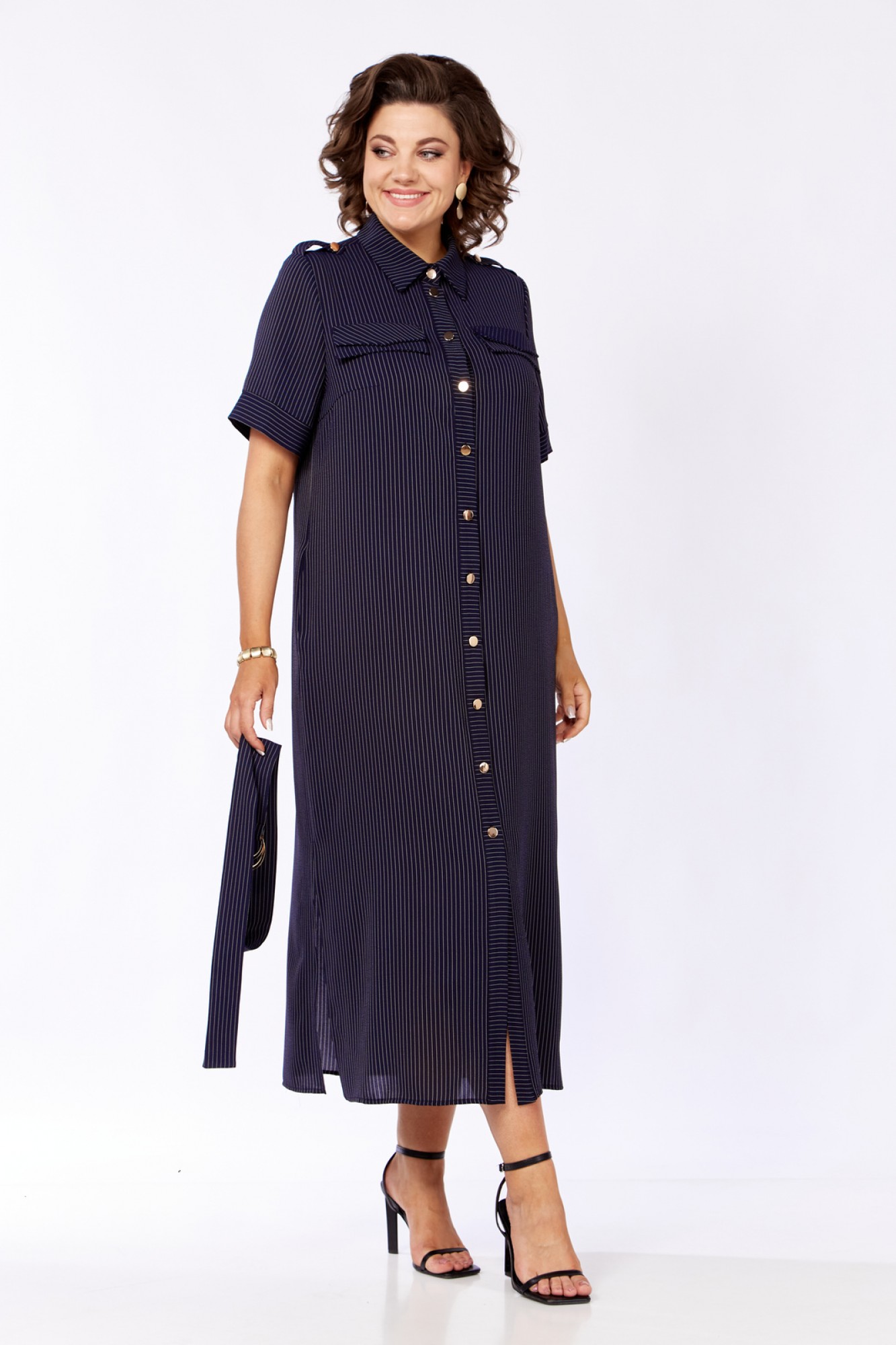 Платье женское прямого силуэта с естественной линией плеча. В боковых швах обработаны карманы и разрезы. По переду имеется отрезная планка и накладные клапаны сложного покроя. Центральная бортовая застежка на петли пуговицы. Спинка с отрезной кокеткой и легкой встречной складкой по центру. Воротник блузочный на отрезной стойке. Рукав короткий, втачной одношовный с манжетами. На плечах выполнены паты с пуговицами. Имеется навесной отделочный пояс.