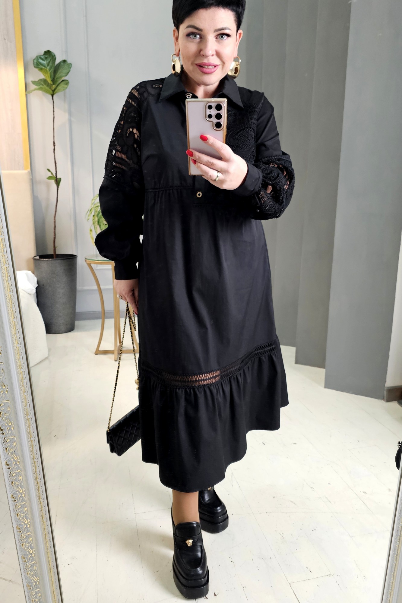 Платье А-силуэта с ассиметричным подрезом по переду и действующей планкой на петли пуговицы и воротником рубашечного типа. Деталь полочки с элементом наложения из отделочной ткани. По низу платья притачной волан со вставкой из кружева в подрезе. Спинка с элементом наложения из отделочной ткани и подрезом выше уровня талии. Рукав втачной, длинный со сборкой на манжету с застёжкой на пуговицу. Рукав ассиметричный со вставками из отделочной ткани «на просвет». В качестве дополнительной отделки в подрезах платья идёт декоративная тесьма.