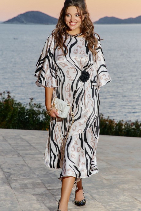 Шикарное платье с принтом в модном анималистическом стиле - для приверженцев ярких и стильных образов. Ткань из высококачественной вискозы атласного переплетения - мягкая, приятная к телу, имеет матовый благородный блеск. Следуя оригинальному крою, нежная вискоза создает красивые мягкие встречные складки по талии, а от бедер элегантно струится вниз, скрывая несовершенства фигуры, создает гармоничный образ. Графичный зебровый принт скрадывает объем и визуально вытягивает силуэт. По талии платье декорировано съемной брошью в форме цветка. Это изысканное платье преобразит любую женщину, подчеркнет природную красоту и изящество! Платье макси с втачными коническими рукавами длиной чуть ниже локтя. Прилегание по талии достигается мягкой бантовой складкой по переду. От бедер платье расширяется книзу. Горловина круглая.