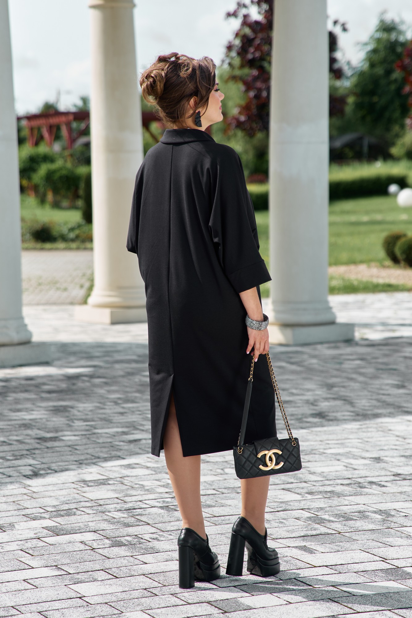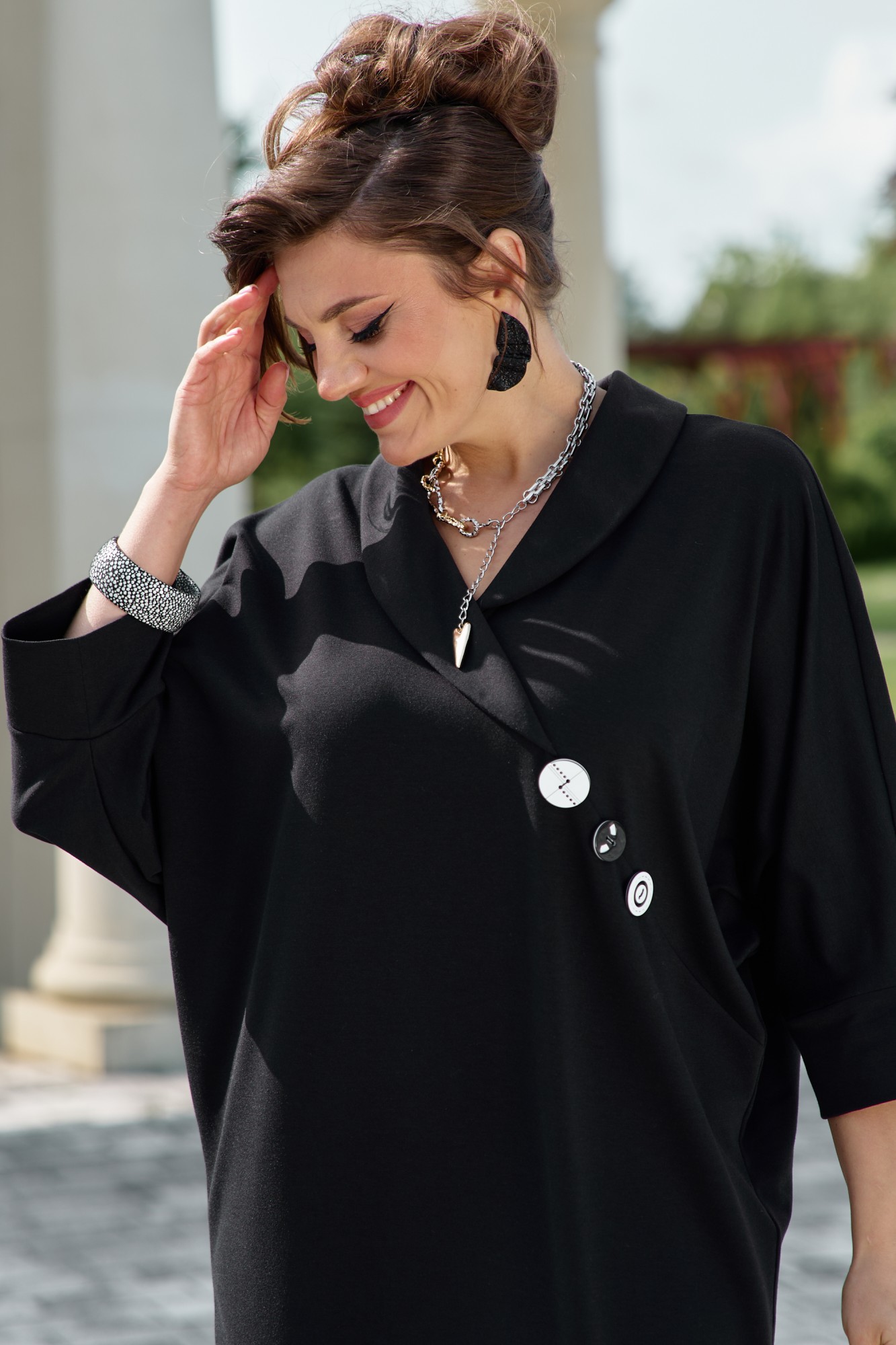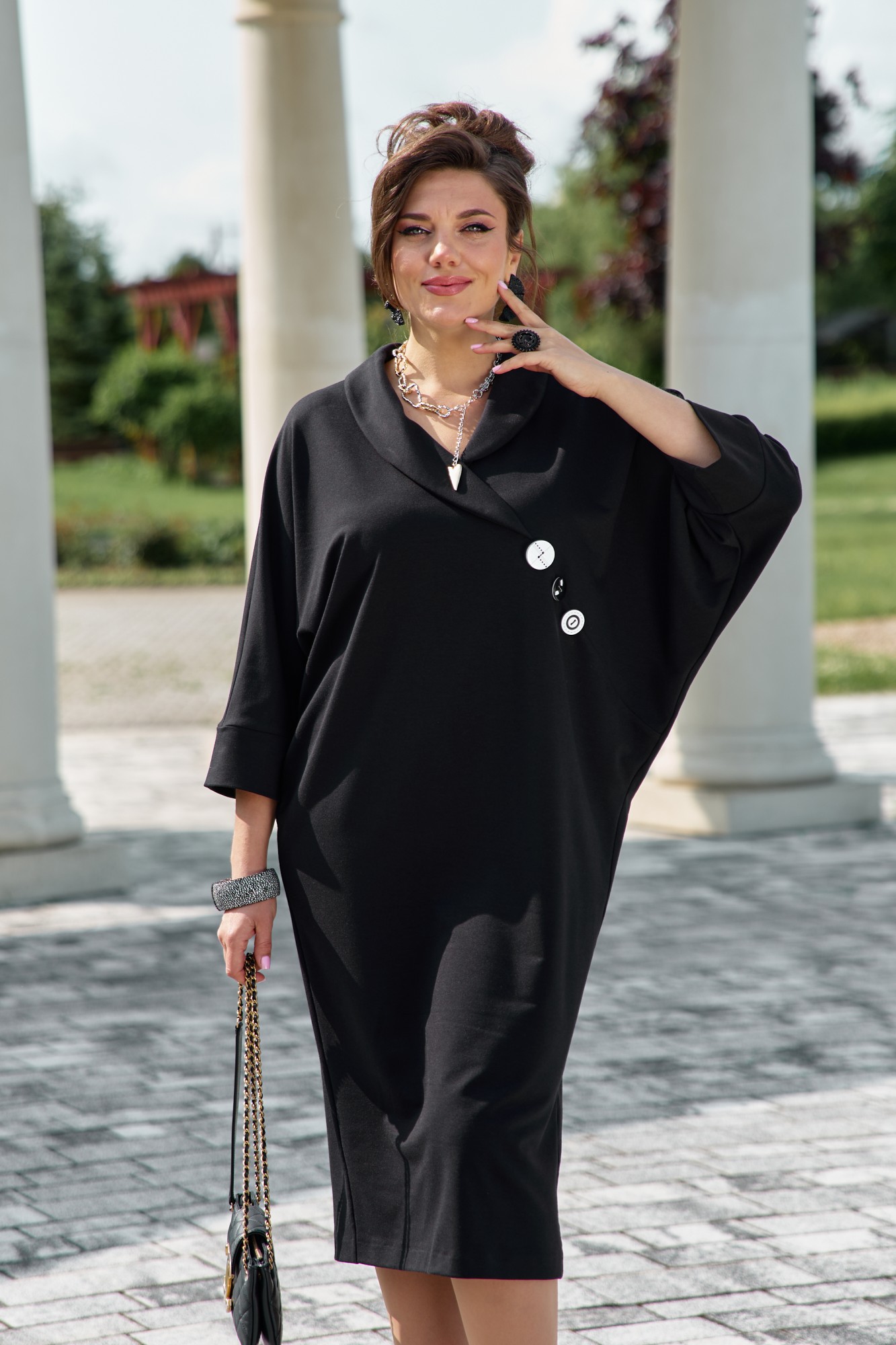 Интересный крой платья и пластические свойства трикотажного полотна помогут скрыть недостатки фигуры и создать идеальный образ. Платье свободного силуэта, заужается к низу. Горловина в платье открытая, с ассиметричным отложным воротником переходящим в подрез по переду платья. Спинка со средним швом. Рукав в платье по форме «летучая мышь» с притачной манжетой по низу. В качестве главного акцента платья, который приковывает взгляды, являются пришивные декоративные пуговицы контрастного цвета и разных размеров.