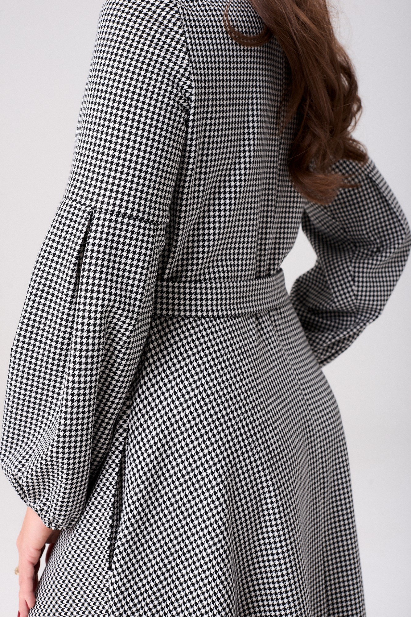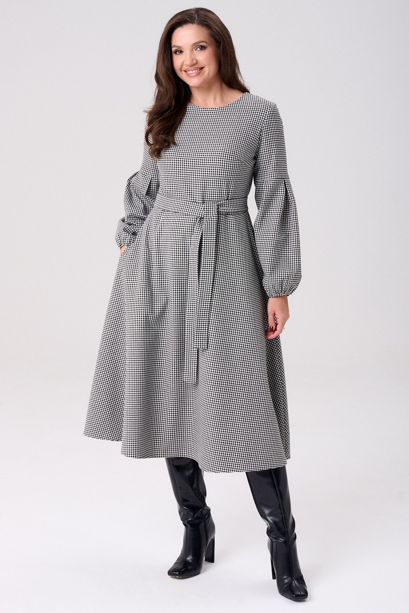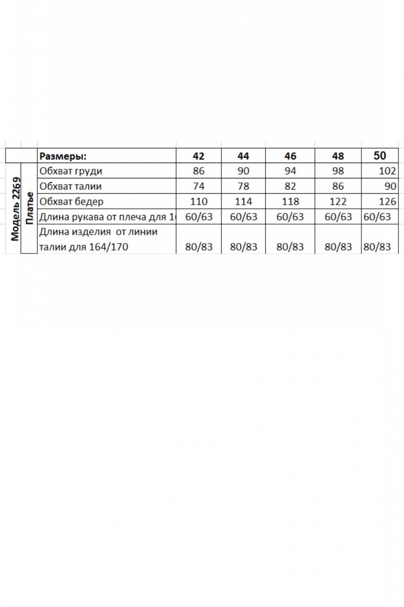 Платье отрезное по линии талии, с расклешенным низом. В боковых швах платья расположены карманы. Горловина округлая. По спинке потайная молния. Рукав втачной с декоративной нижней частью. Низ рукава собран на эластичную тесьму. Пояс из основной ткани в комплекте.