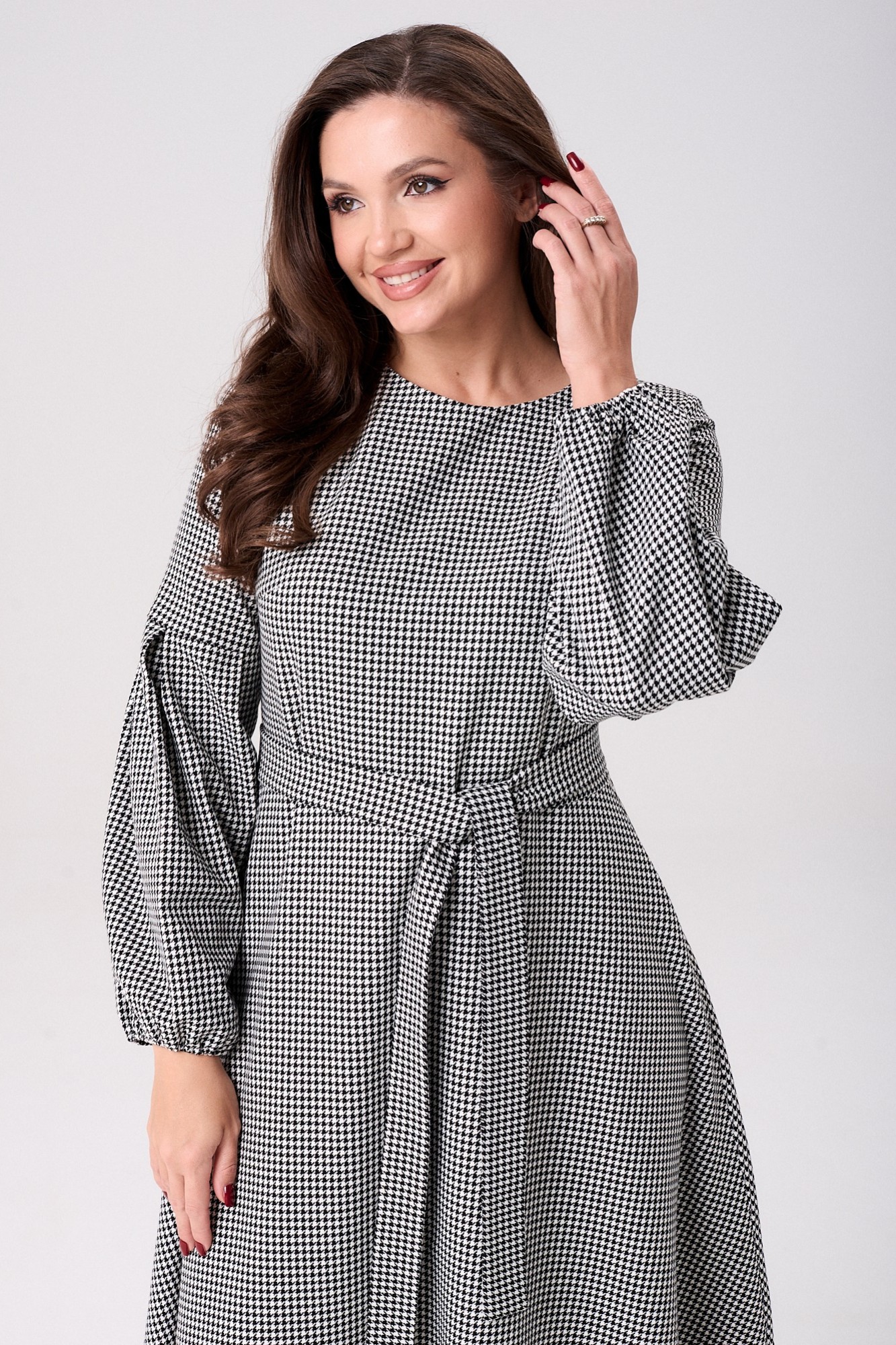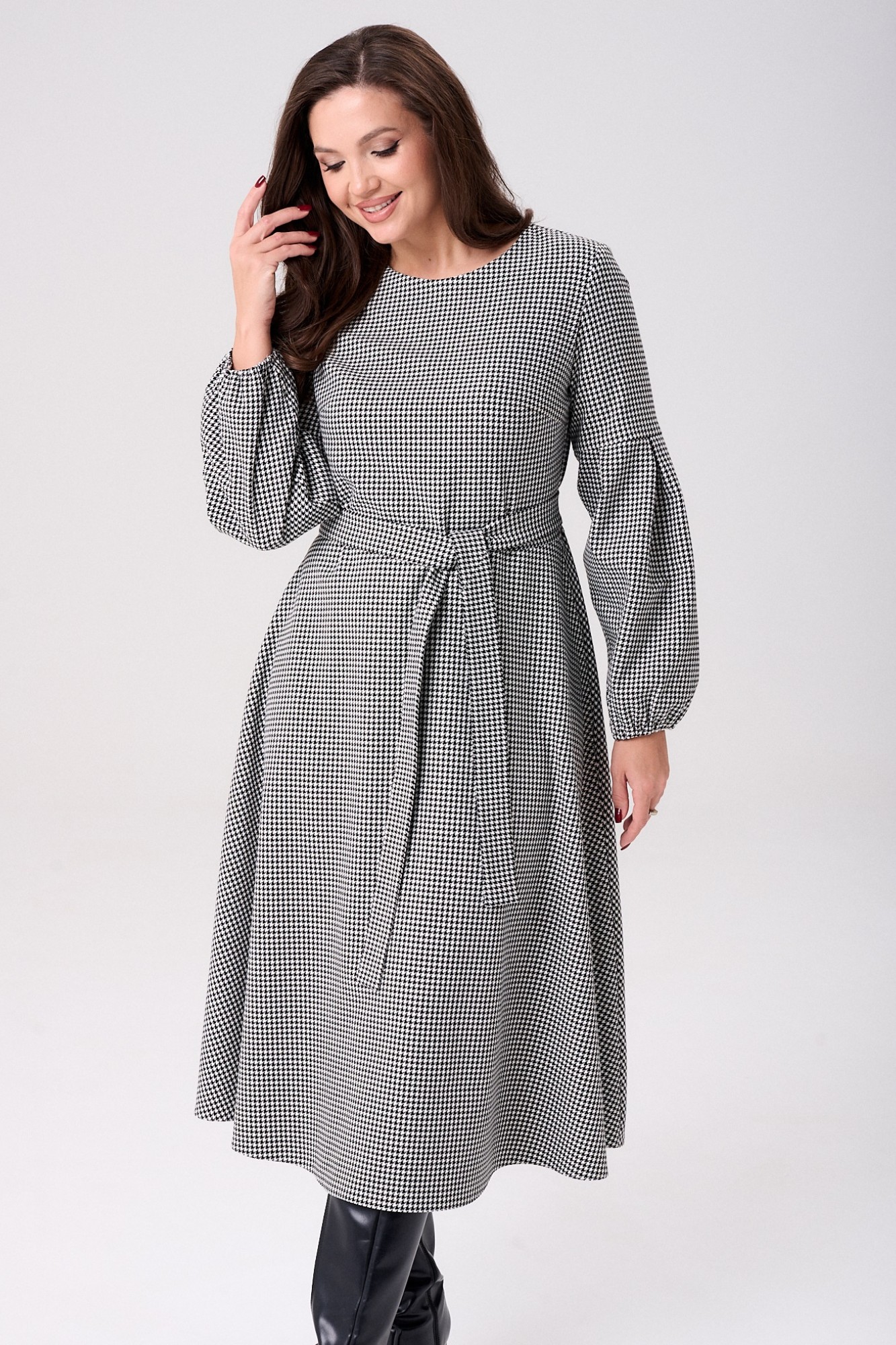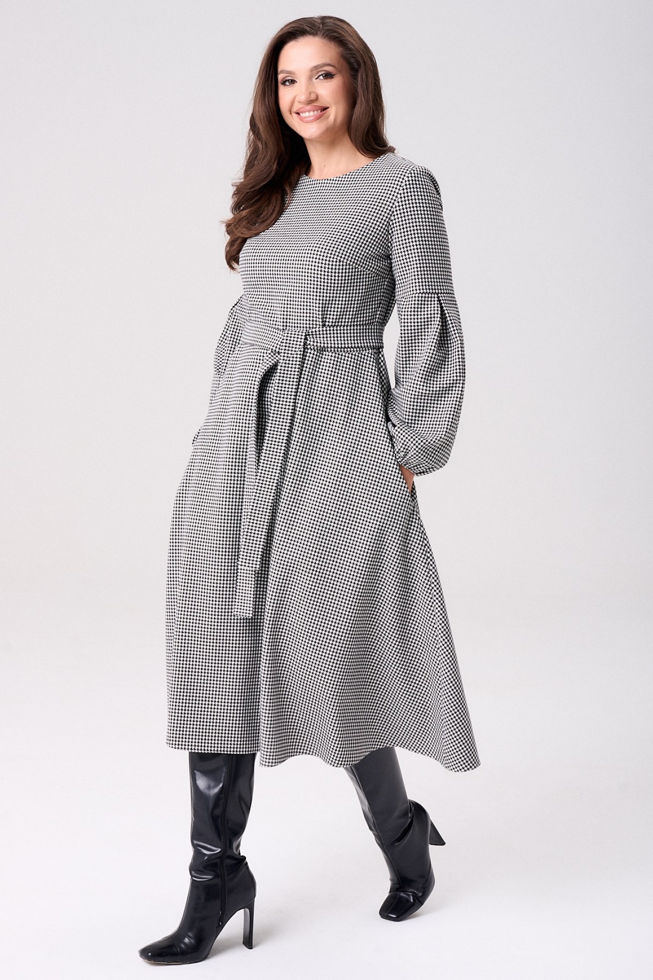 Платье отрезное по линии талии, с расклешенным низом. В боковых швах платья расположены карманы. Горловина округлая. По спинке потайная молния. Рукав втачной с декоративной нижней частью. Низ рукава собран на эластичную тесьму. Пояс из основной ткани в комплекте.