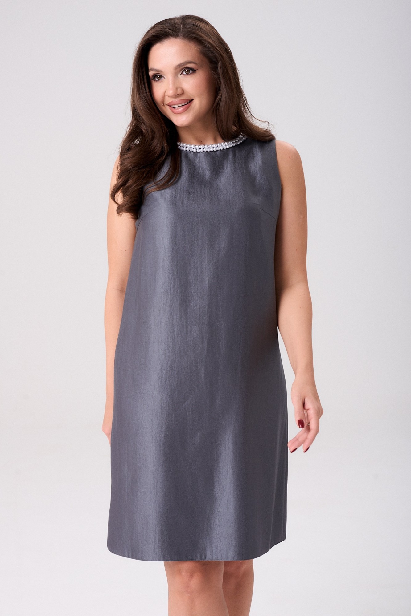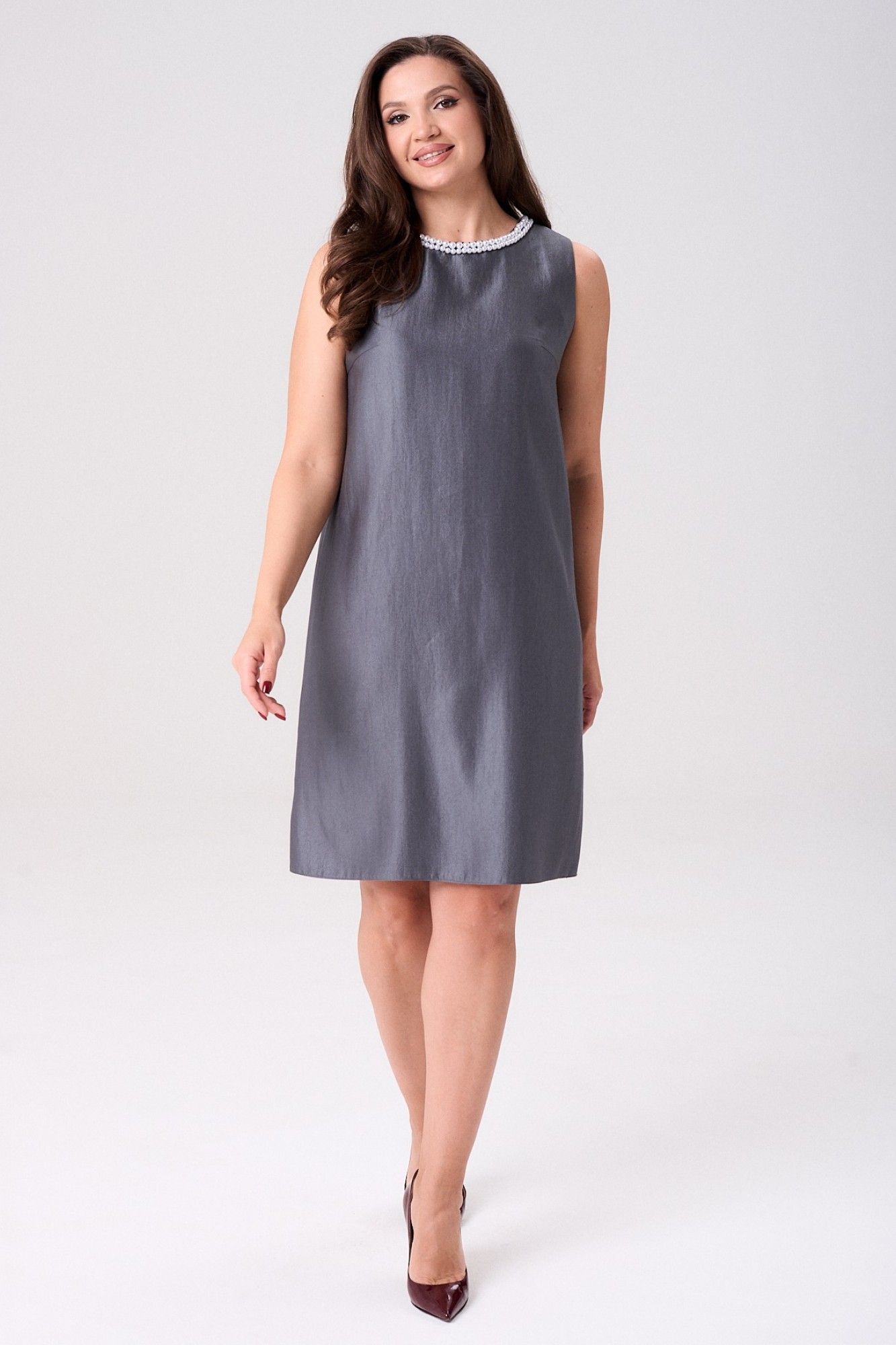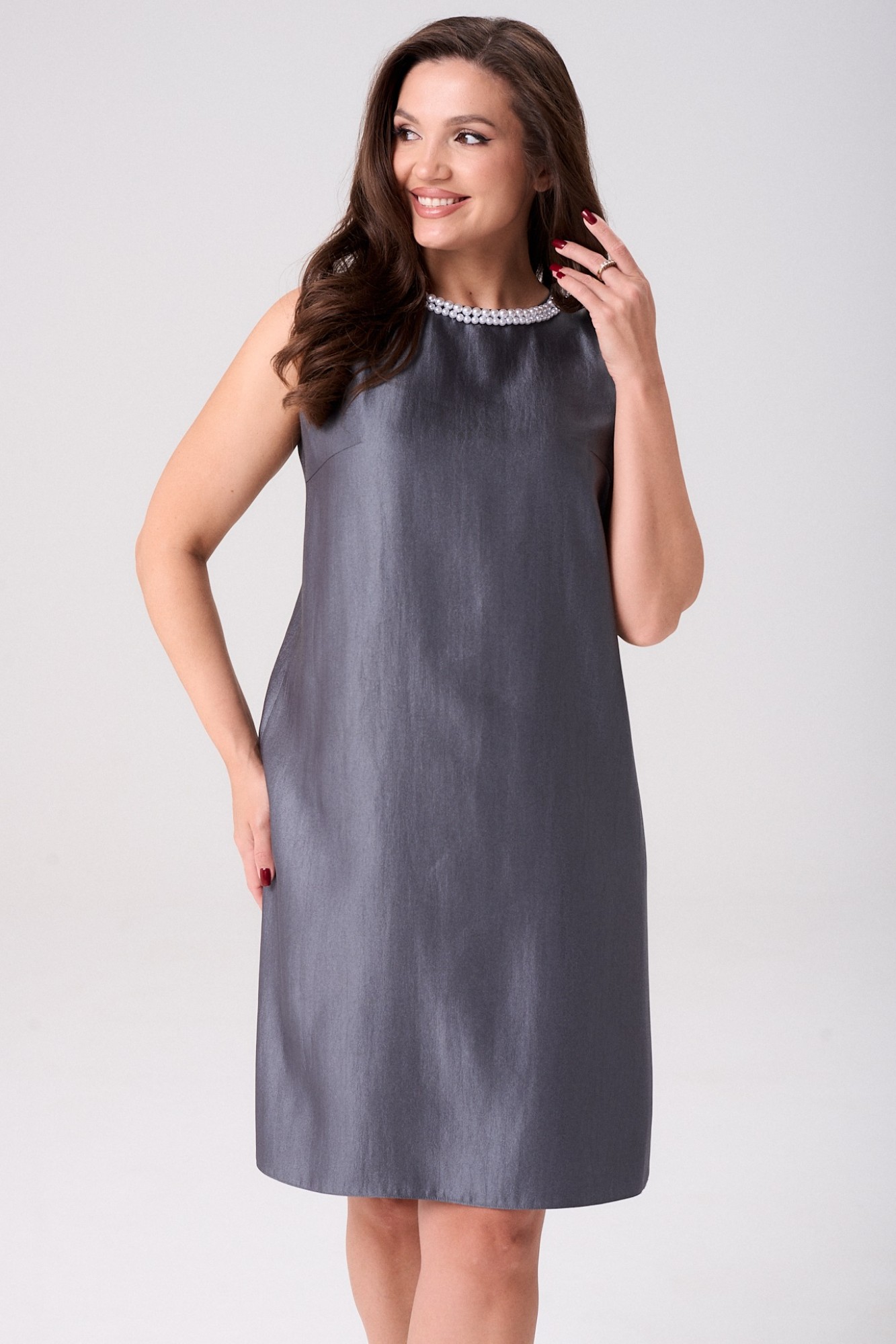 Платье А-силуэта с вытачками на полочке, и потайной молнией сзади, выполнено из костюмно-плательной ткани, приятной на ощупь, с легким блеском. Горловина округлая, отделана бусинами под жемчуг.