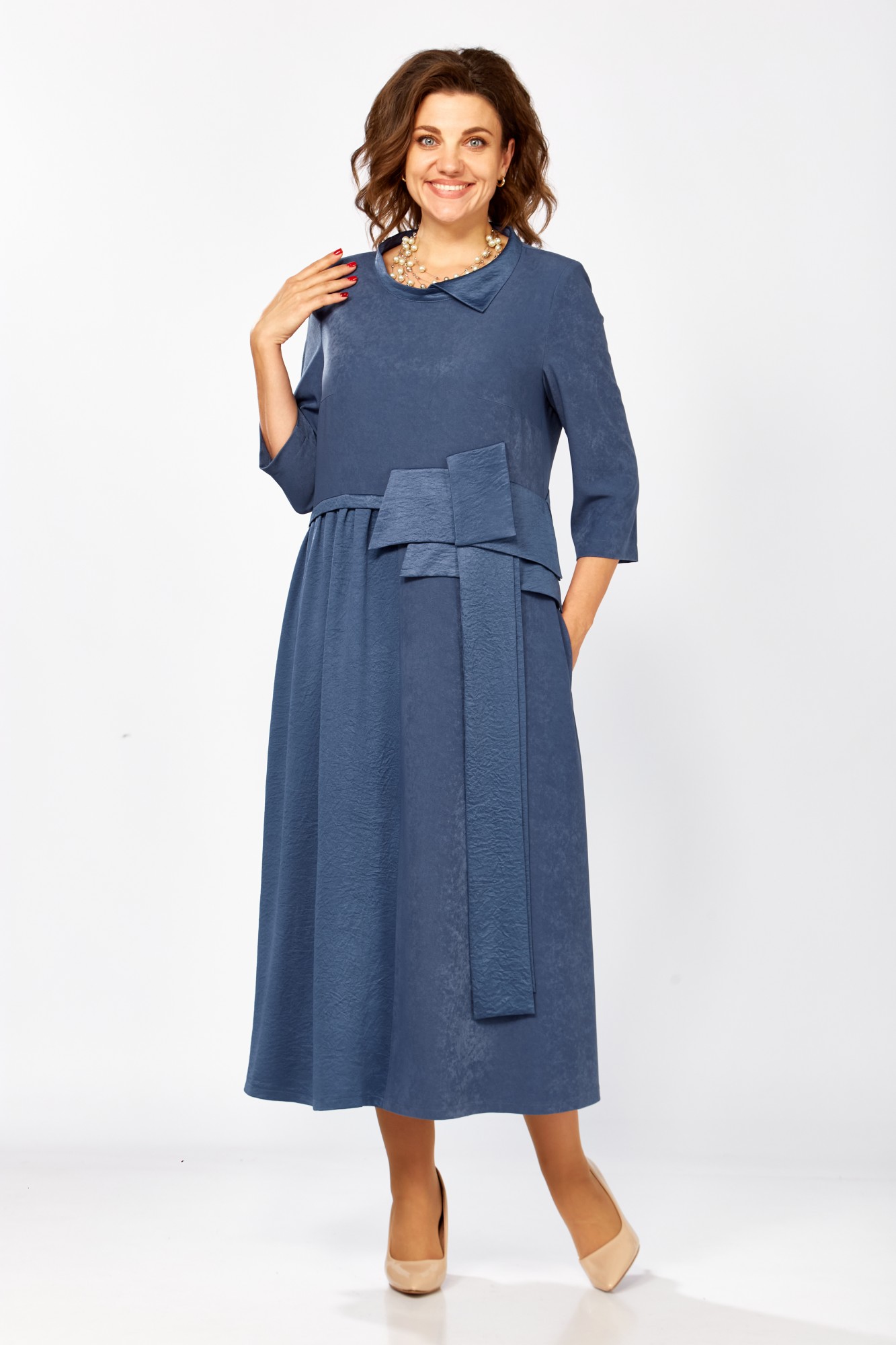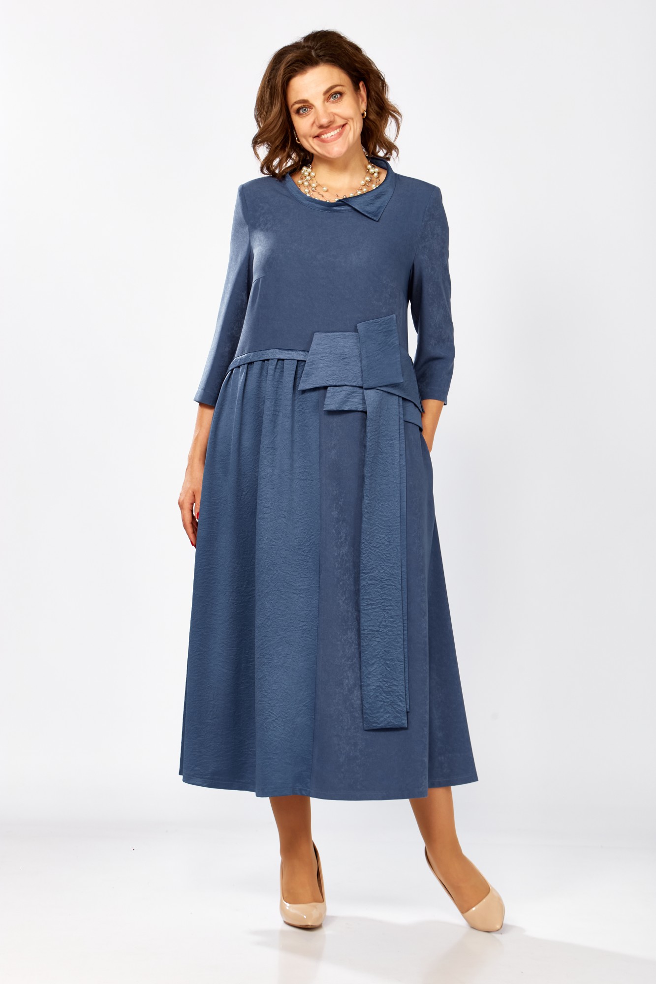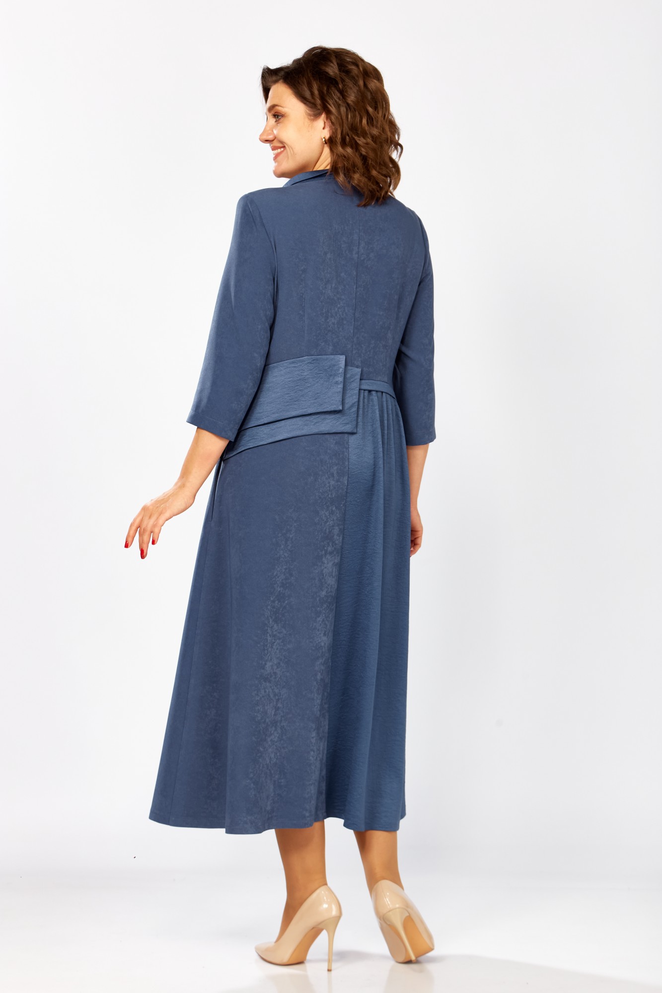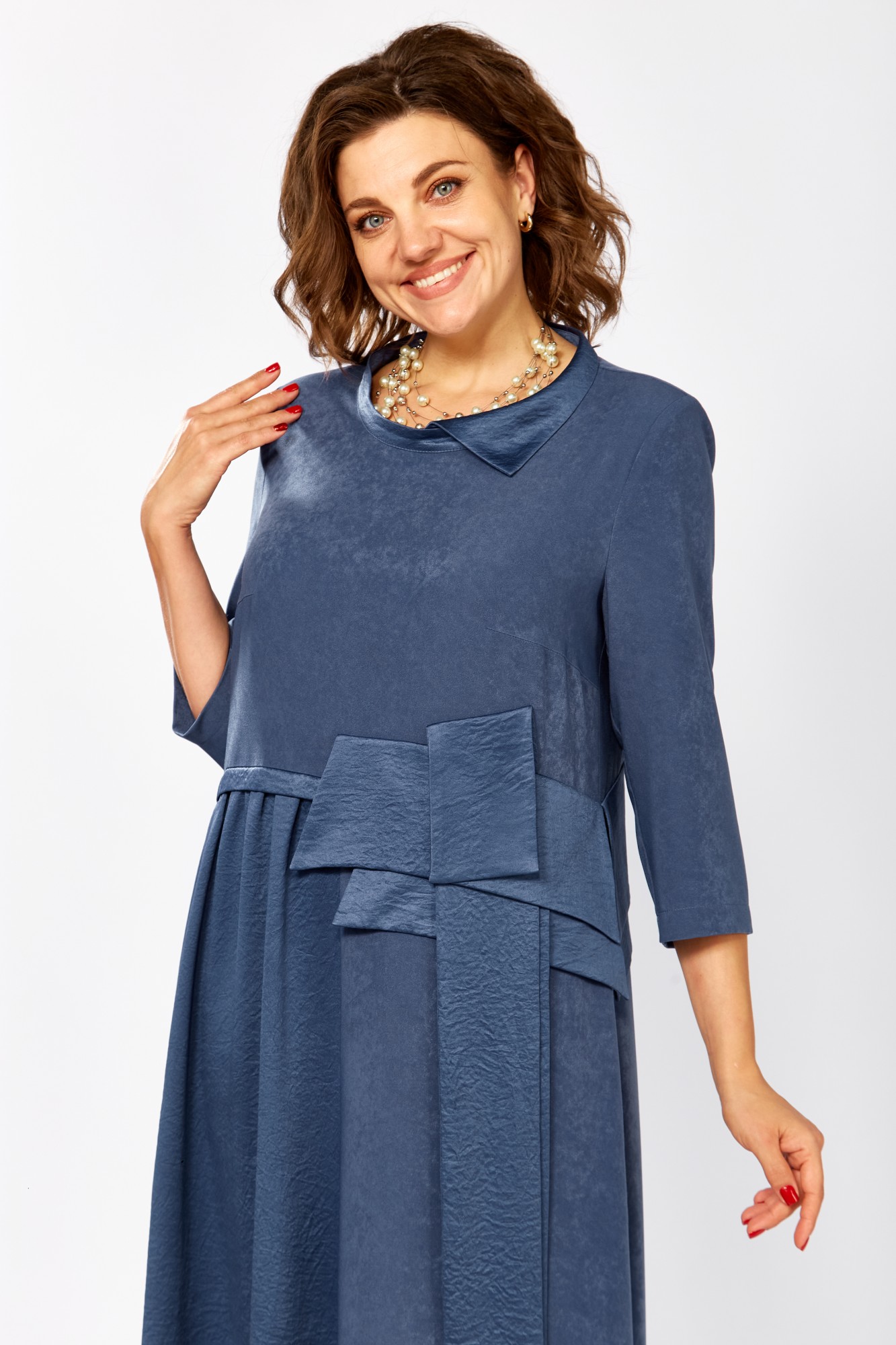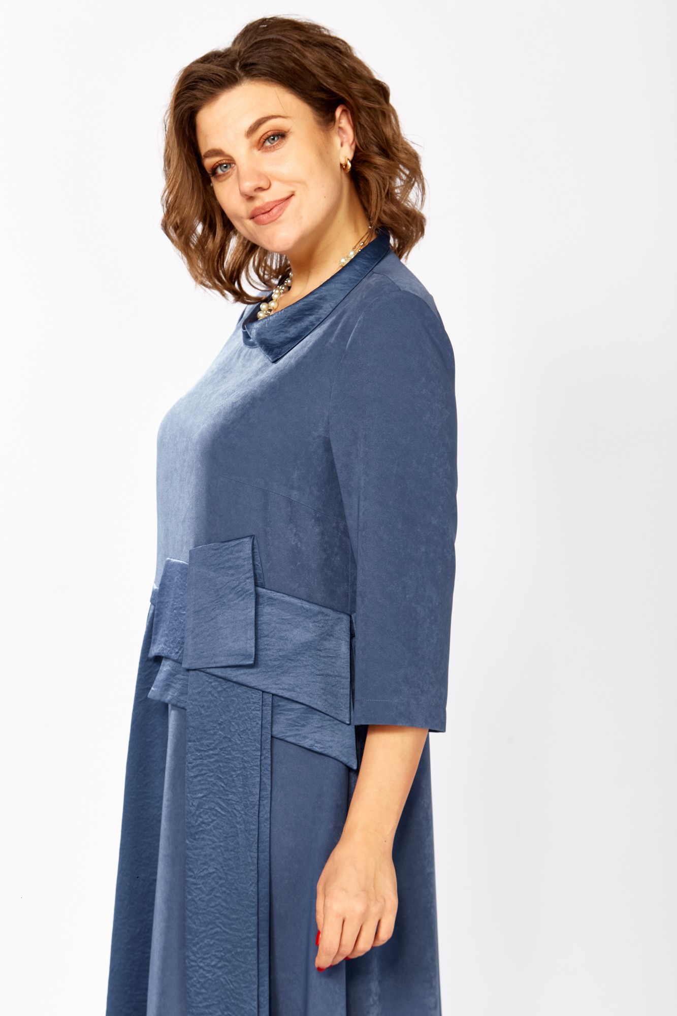 Нарядное платье изготовлено из двух видов ткани-бархатистой и блестящей текстурированной в красивом сиренево-голубом оттенке. Полуприлегащий силуэт с отрезной, слегка завышенной, талией. Нижняя часть платья А-силуэта с одной стороны по линии талии со сборкой. Рукав 3/4, втачной. Вырез горловины округлой формы со стойкой и фантазийным воротником. Особенностью этой модели, которая предает образу торжественность, являются геометрические детали настроченные на пояс спереди и сзади по спинке и символизирующие нарядный королевский бант. Платье идеально подойдет на любое торжество-юбилей, свадьбу и многие другие мероприятия.