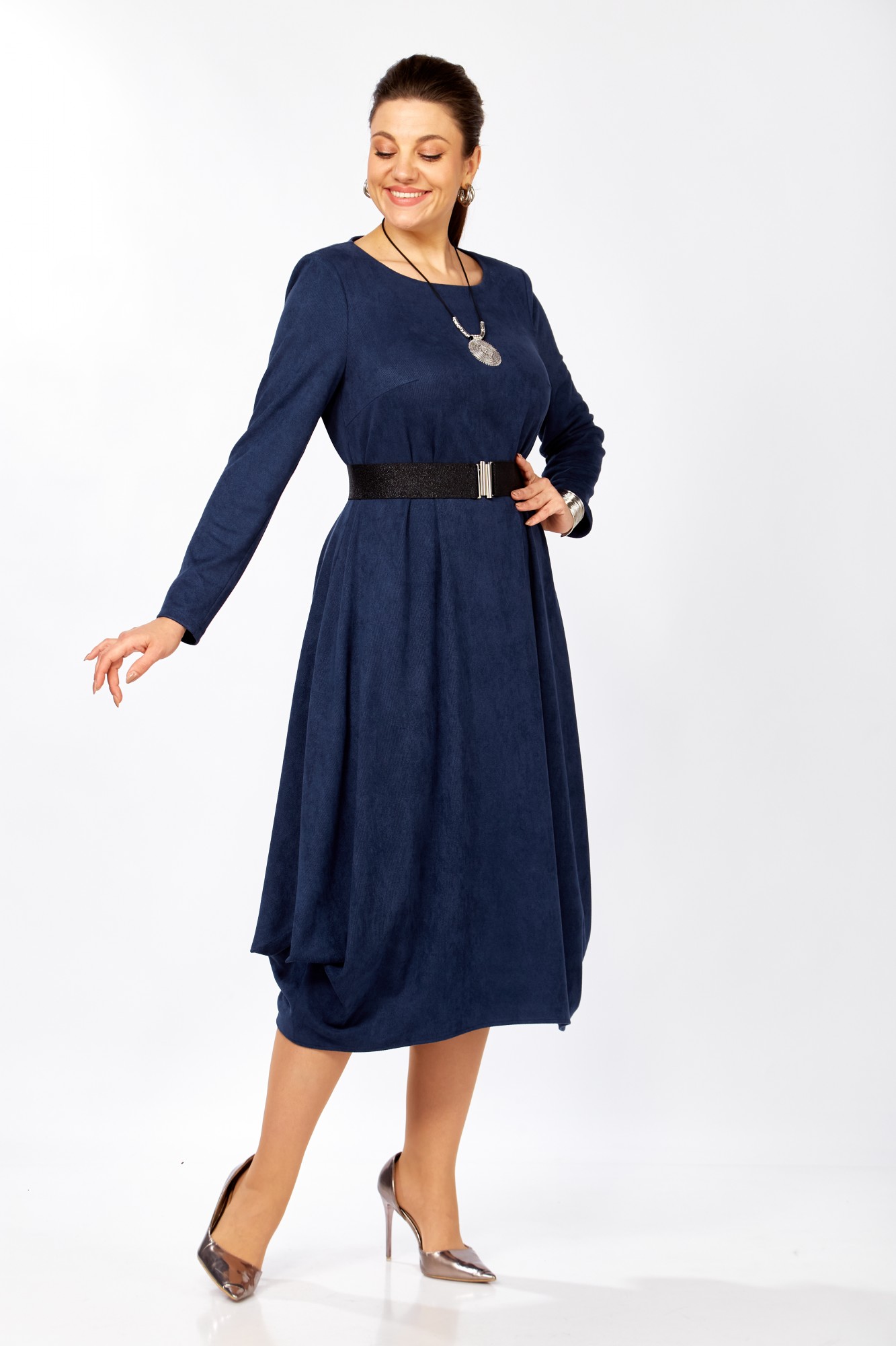Базовое элегантное платье расширенного силуэта в стиле «бохо» с ассиметричным подолом. Модель выполнена из тонкой трикотажной ткани синего оттенка, свободно струящейся по фигуре, создавая утонченный силуэт. Длинные рукава и длина миди делают его идеальным для повседневной носки. Вырез горловины округлой формы у боковых швов со складками. Платье дополнено поясом, что позволяет регулировать ширину по линии талии.