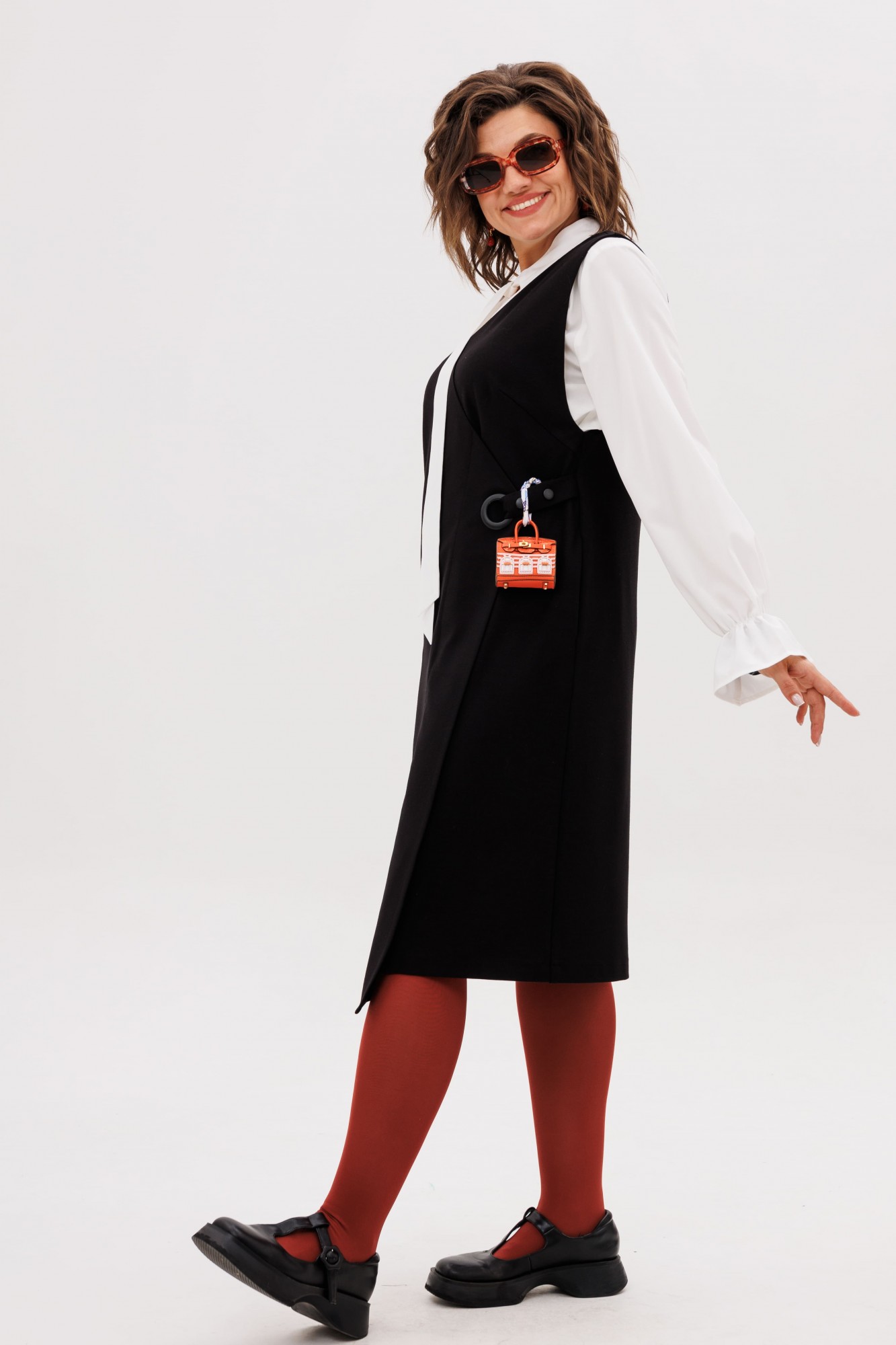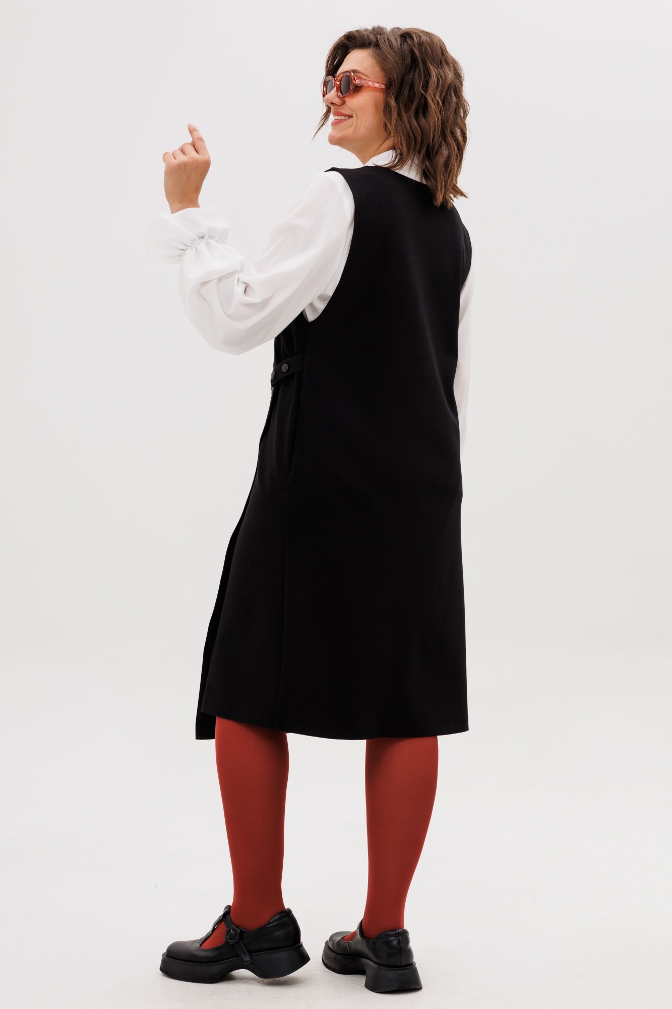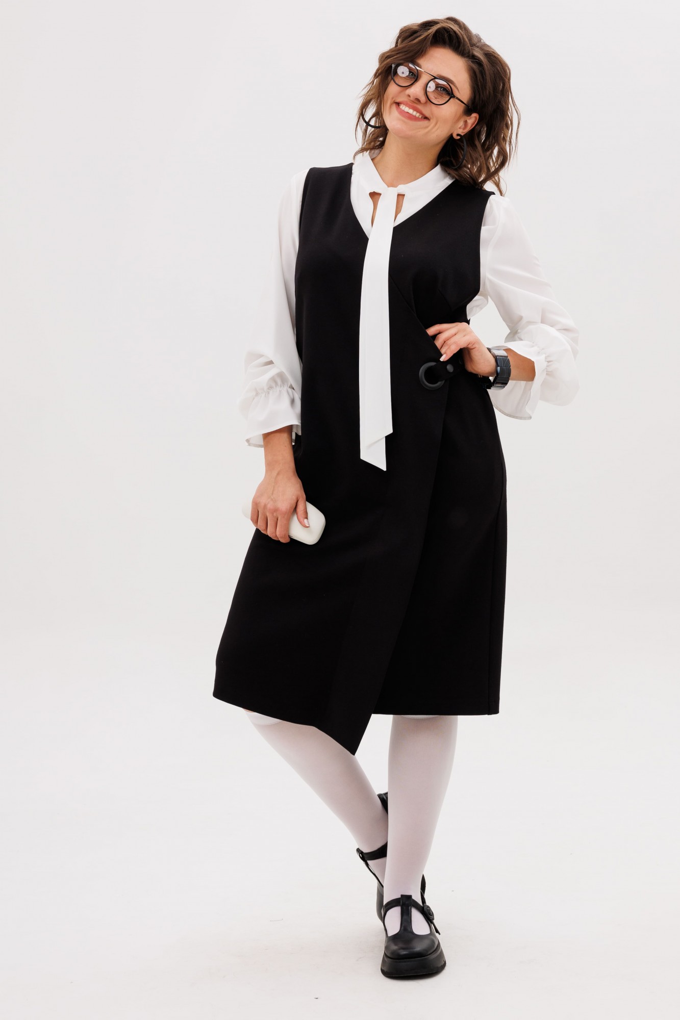 Этот сарафан, выдержанный в строгом прямом силуэте, становится идеальной основой для современного гардероба. Его лаконичную геометрию мягко нарушает игра асимметрии — динамичный, неровный край низа плавно скользит по фигуре, создавая ощущение движения и художественной небрежности. Глубокий V-образный вырез горловины не только зрительно вытягивает шею, но и привносит ноту женственности и открытости, служа идеальным фоном для любимой блузки или тонкого джемпера.