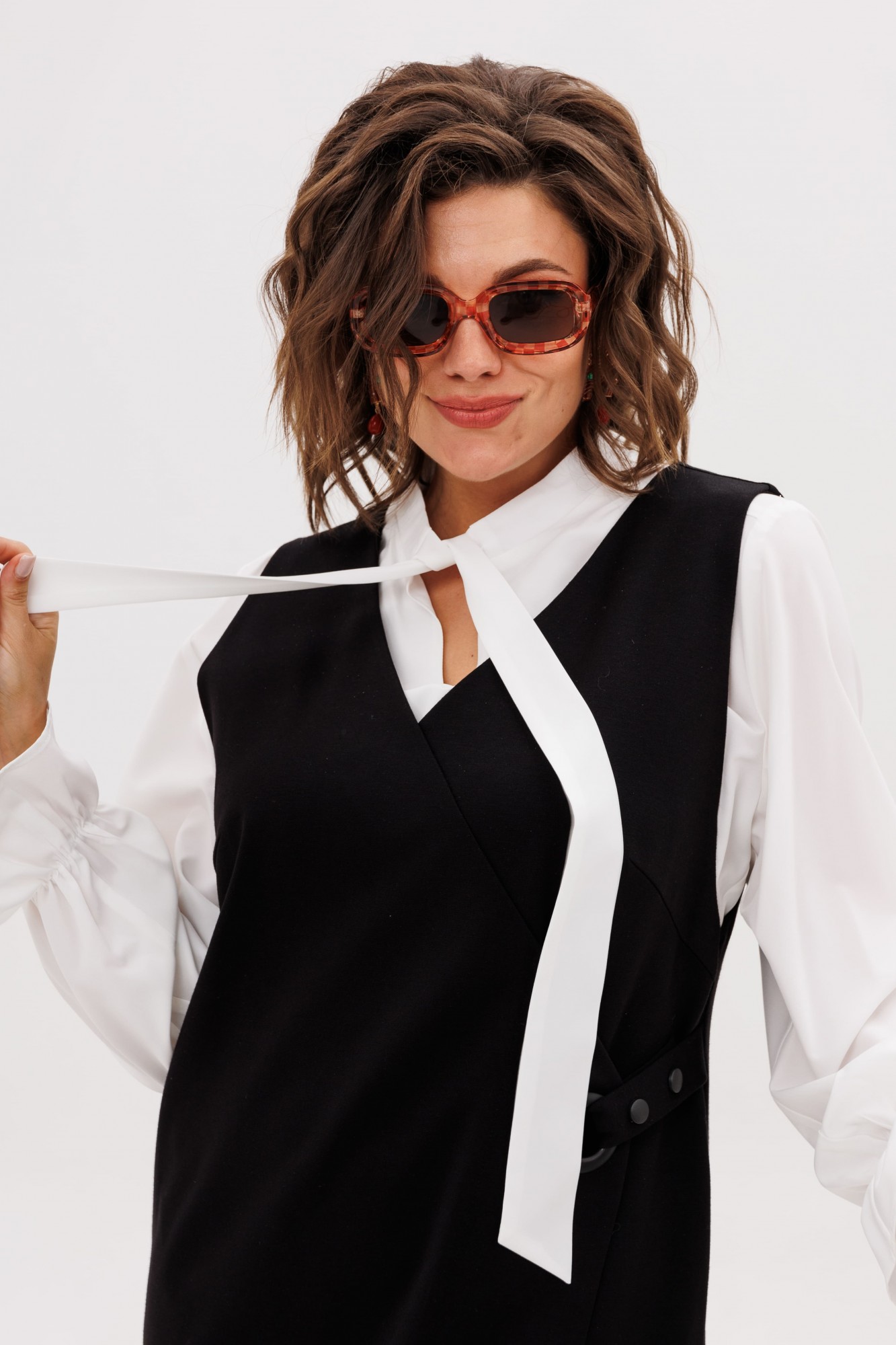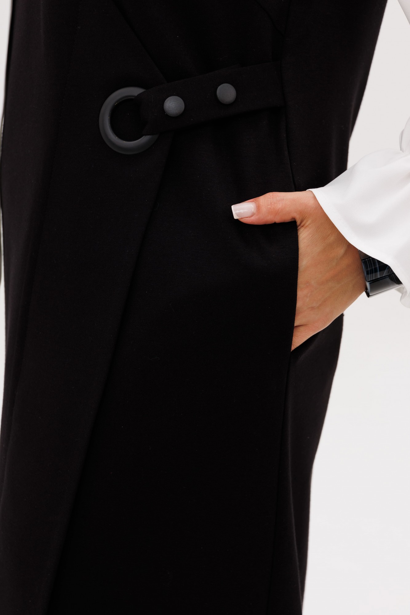 Центральным элементом дизайна является изящный запах, который формирует мягкие, пластичные складки и добавляет модели объем и свободу. Эта легкость подчеркнута выразительной деталью — металлический люверс в сочетании с хлястиком на кнопках создает иллюзию застежки, выступая в роли стильного конструктивного и декоративного акцента. Практичность здесь рождается из продуманности: в боковых швах бесшовно интегрированы два кармана, куда можно убрать руки или положить необходимые мелочи.