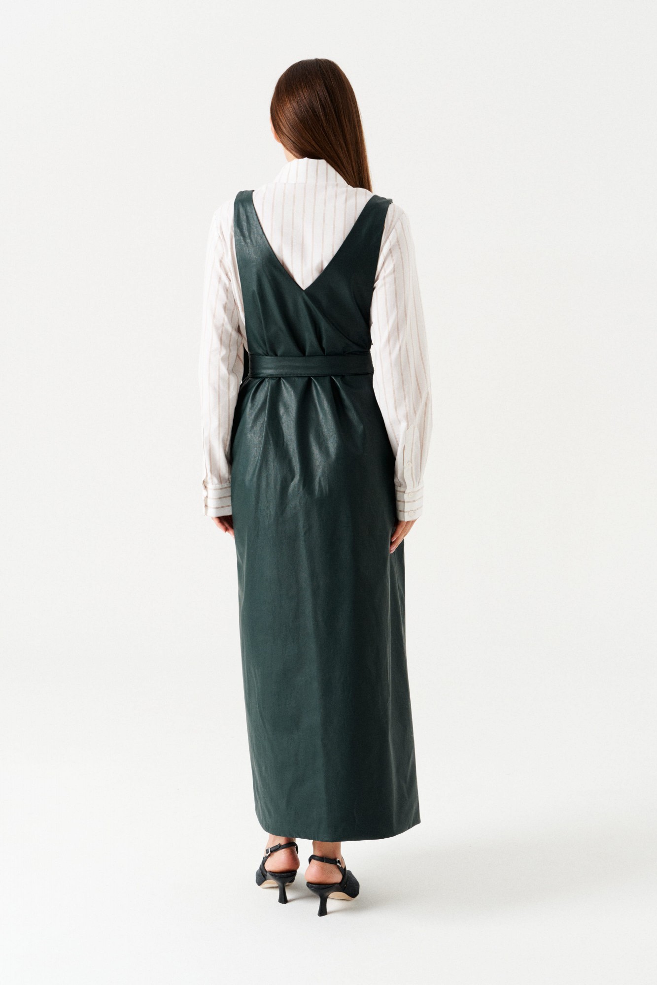 Сарафан женский приталенный, с запахом, на широких бретелях, на подкладке. Приталенность достигается за счет съемного пояса. Вырез горловины переда и спинки имеет V-образную форму. Перед со смещенной застежкой на 2 пришивные кнопки. В боковых швах расположены карманы.