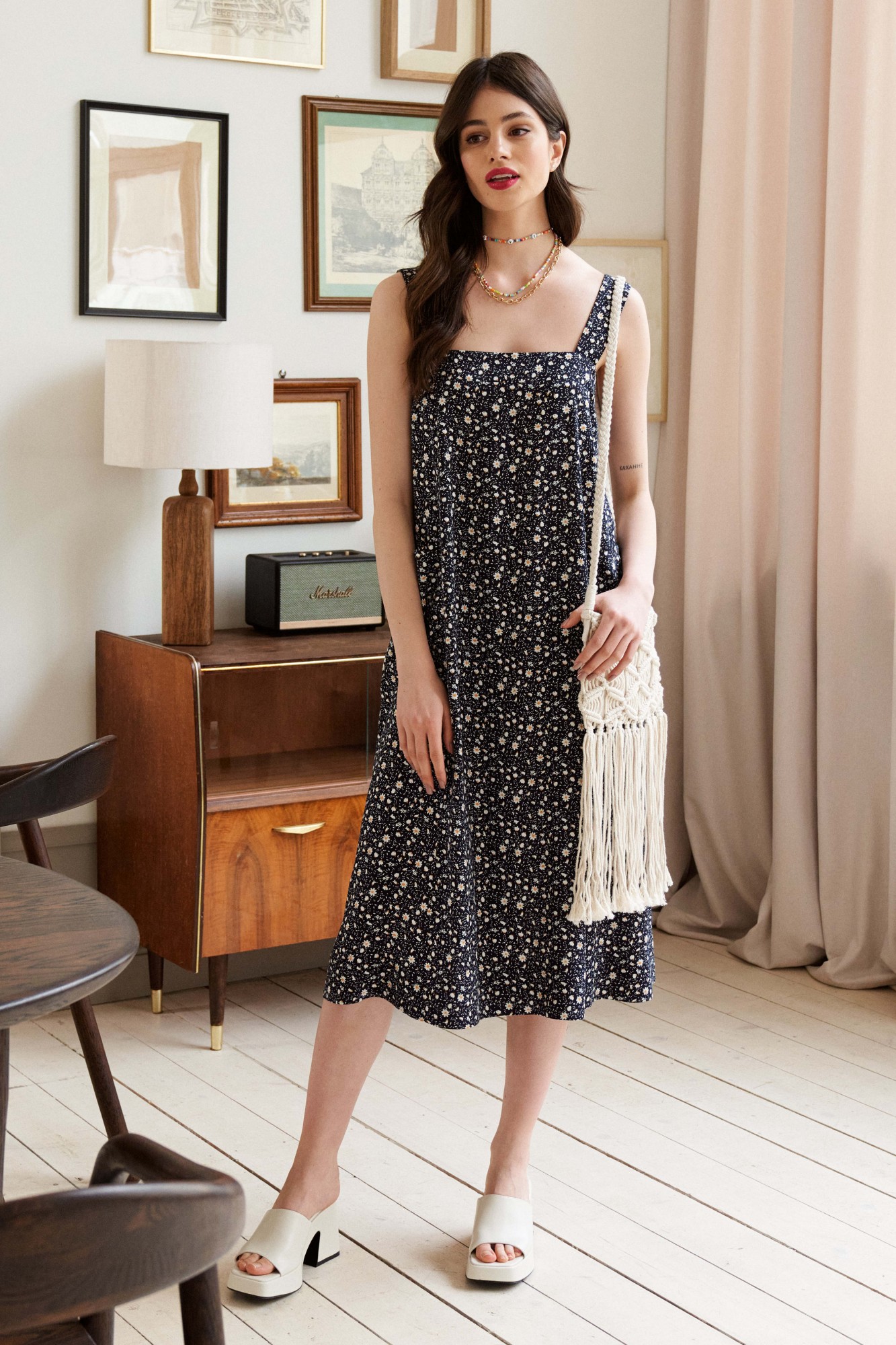 Сарафан женский, А-образного силуэта, длиной миди. Сарафан на широких бретелях, фиксируется декоративным бантом на спине и сборкой на резинку. По переду выполнены накладные карманы.