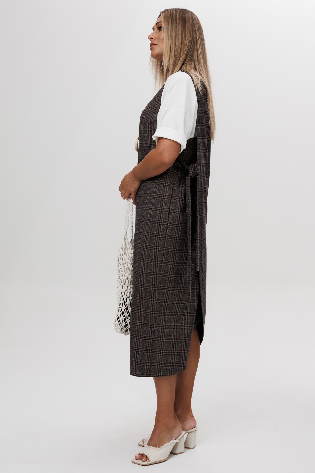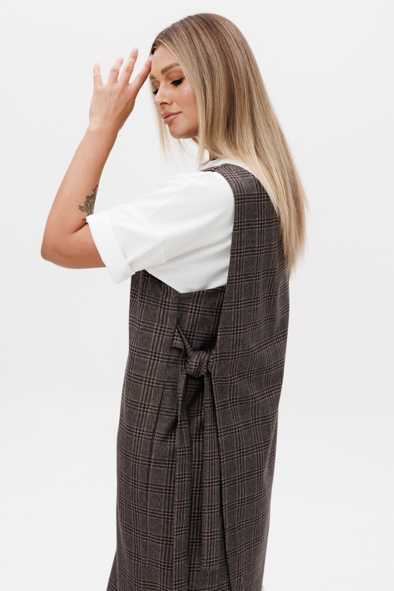 Сарафан прямого силуэта с V-образным вырезом и с запахом на спине. В боковых швах есть карманы. По переду шлица на кнопках.