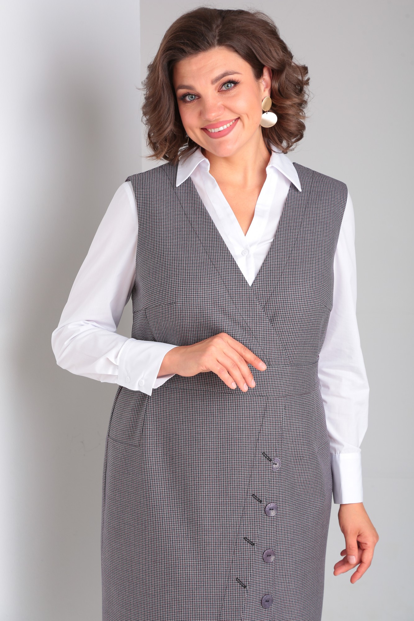 Сарафан полуприлегающего силуэта с имитацией запаха на переду. Спинка со средним швом, застежкой на потайную молнию и шлицей. Перед с нагрудными и талиевыми вытачками, с частично втачным в центральной части функциональным поясом Вырез горловины v-образный.