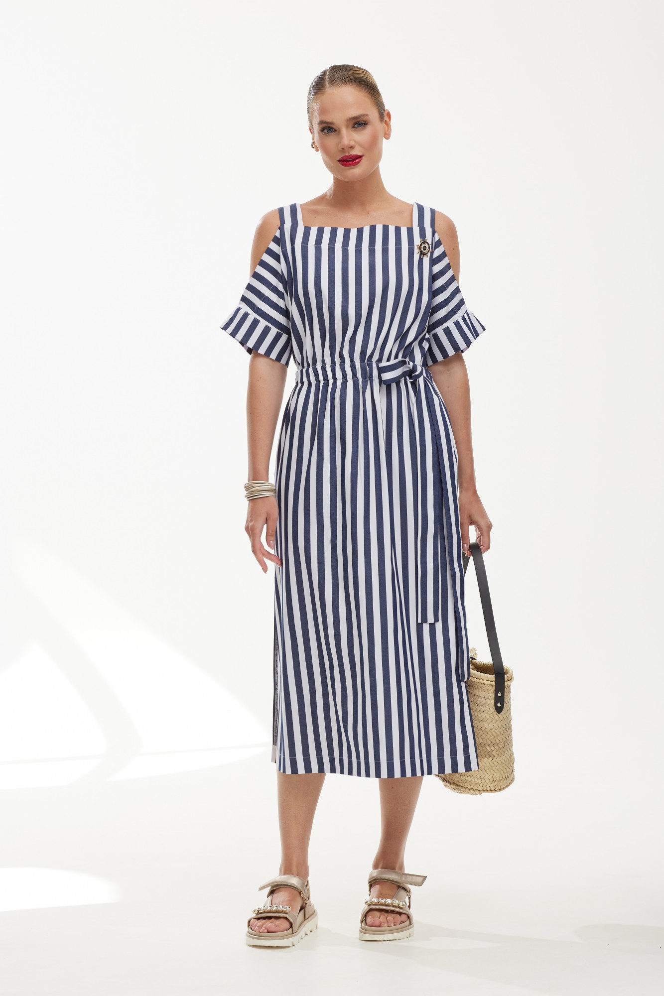 Элегантный летний сарафан с синей полоской визуально вытянет фигуру, сделает Ваш образ привлекательным и загадочным. Удачное сочетание цветов, продуманный крой превратит эту модель в излюбленный наряд любой модницы. В сарафане можно ходить на пляж, на прогулку, в офис, на шоппинг. Он отлично сочетается с любыми видами обуви.