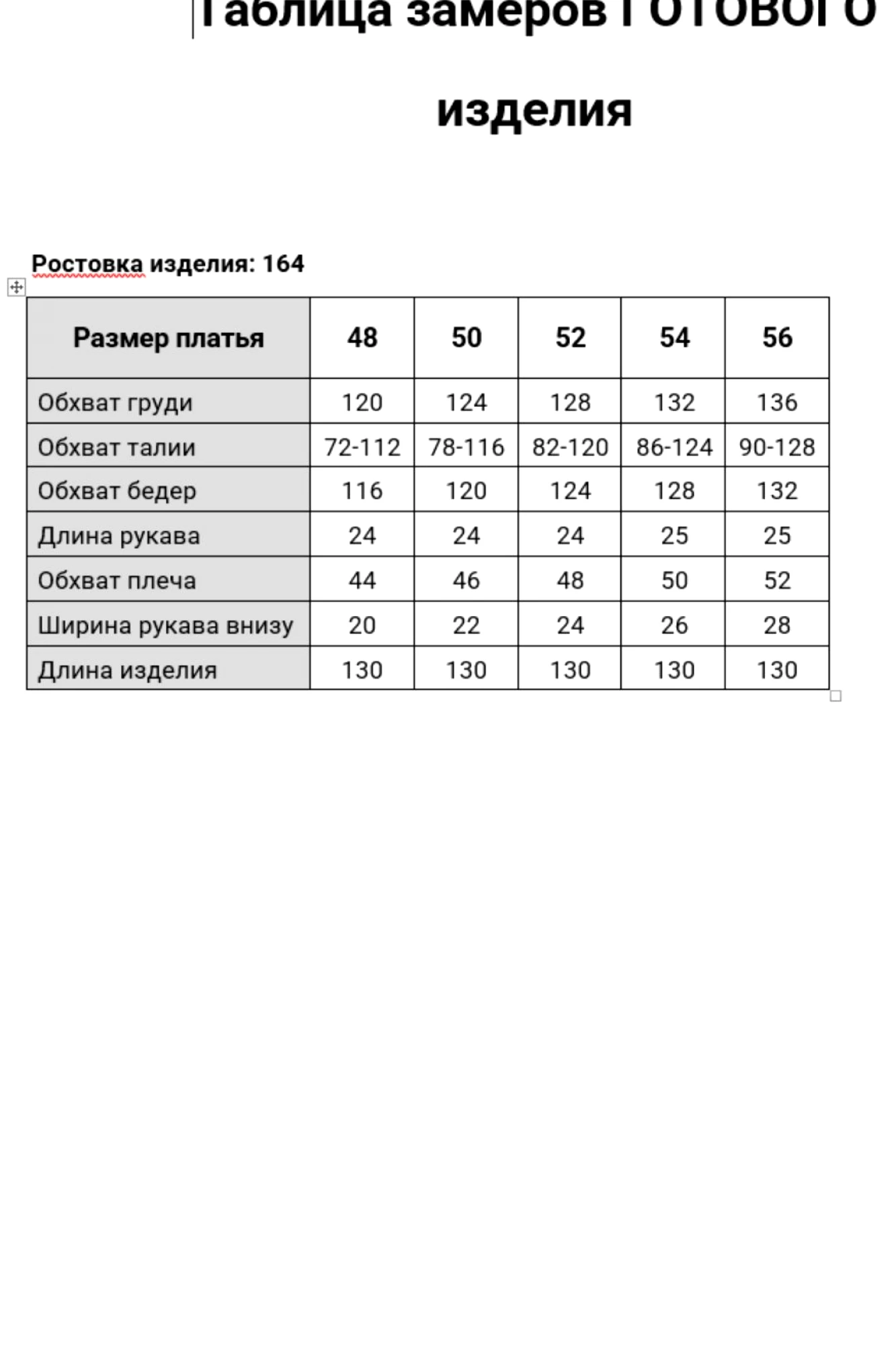 Таблица размеров