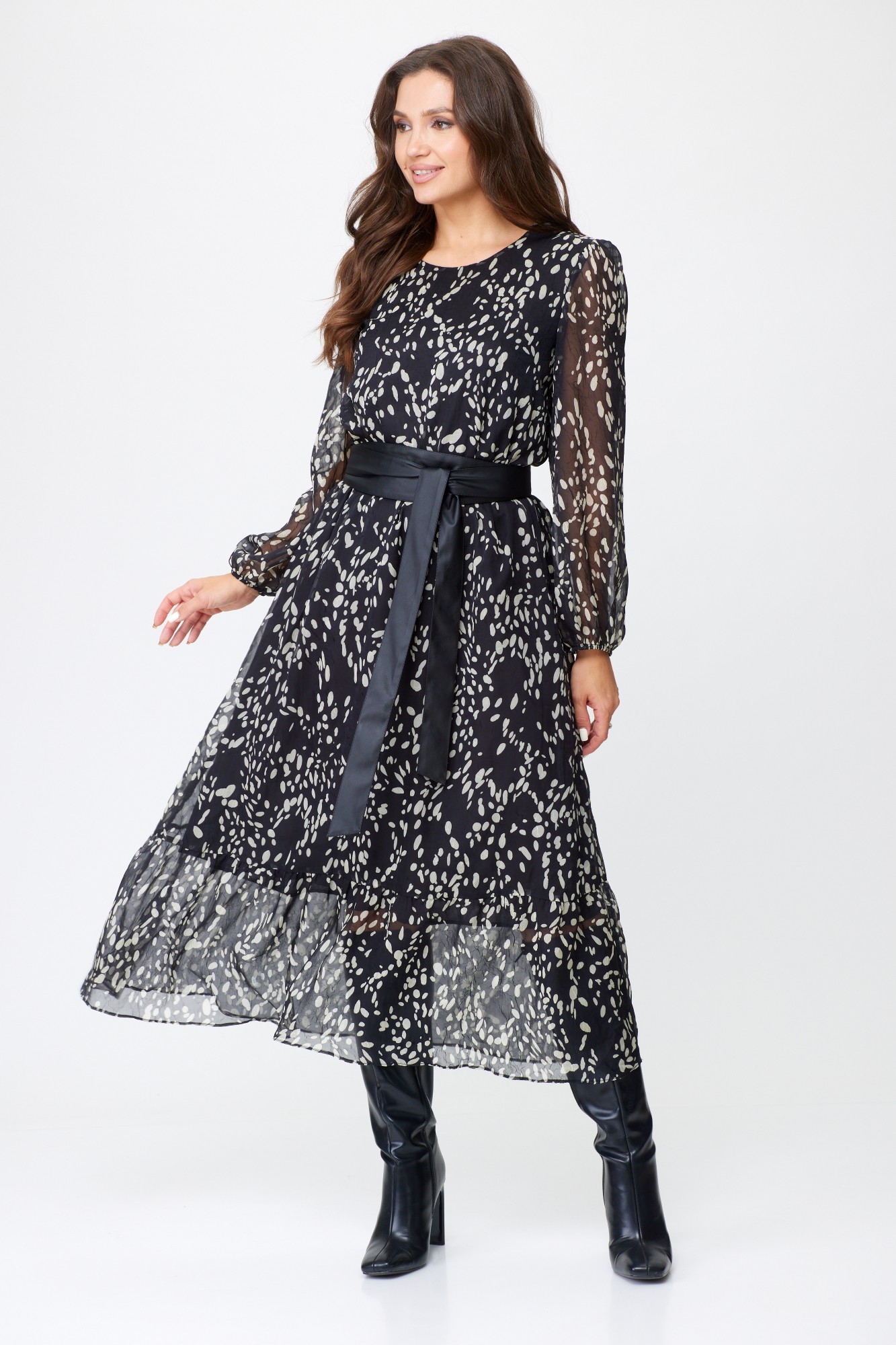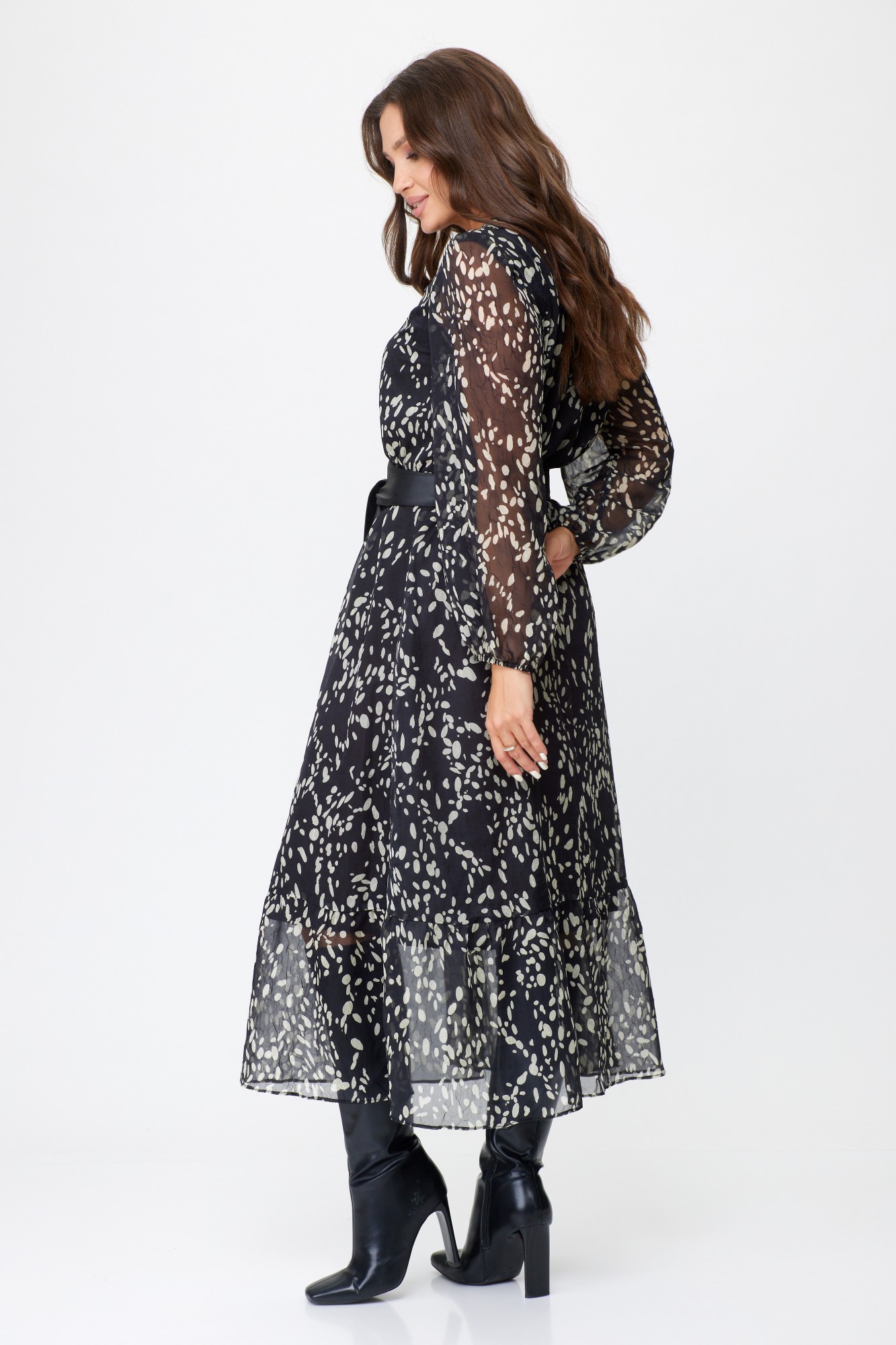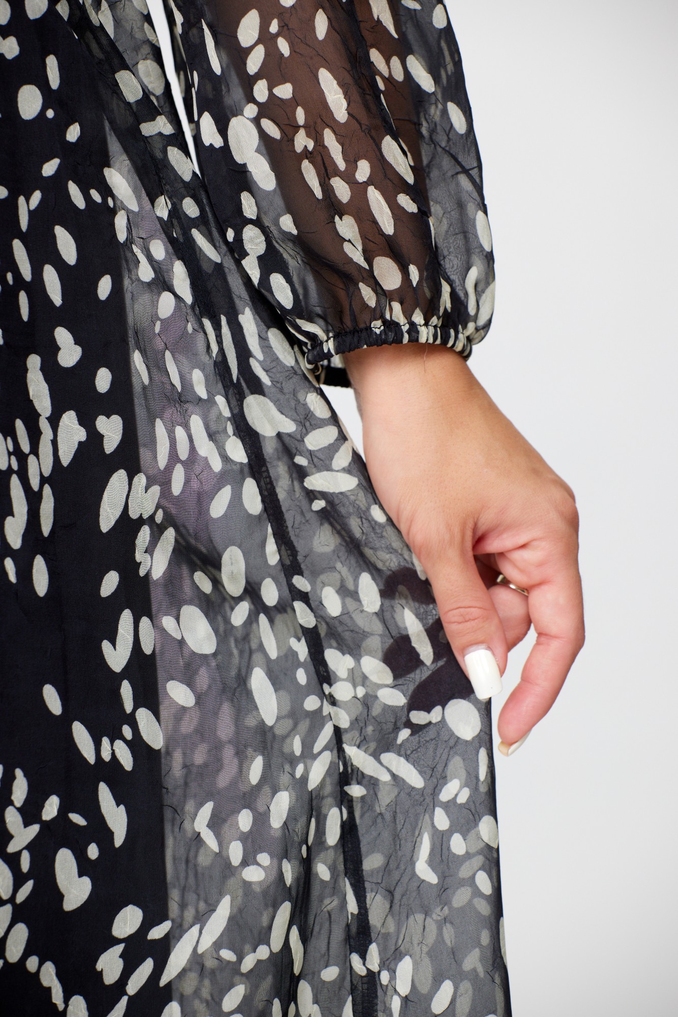 Сочетание тканей сделало это платье легким, воздушным, дышащим. Вырез горловины округлый с обработкой. Рукав втачной, с закрытым швом, прозрачный. Низ рукава на резинке с закрытым срезом.
