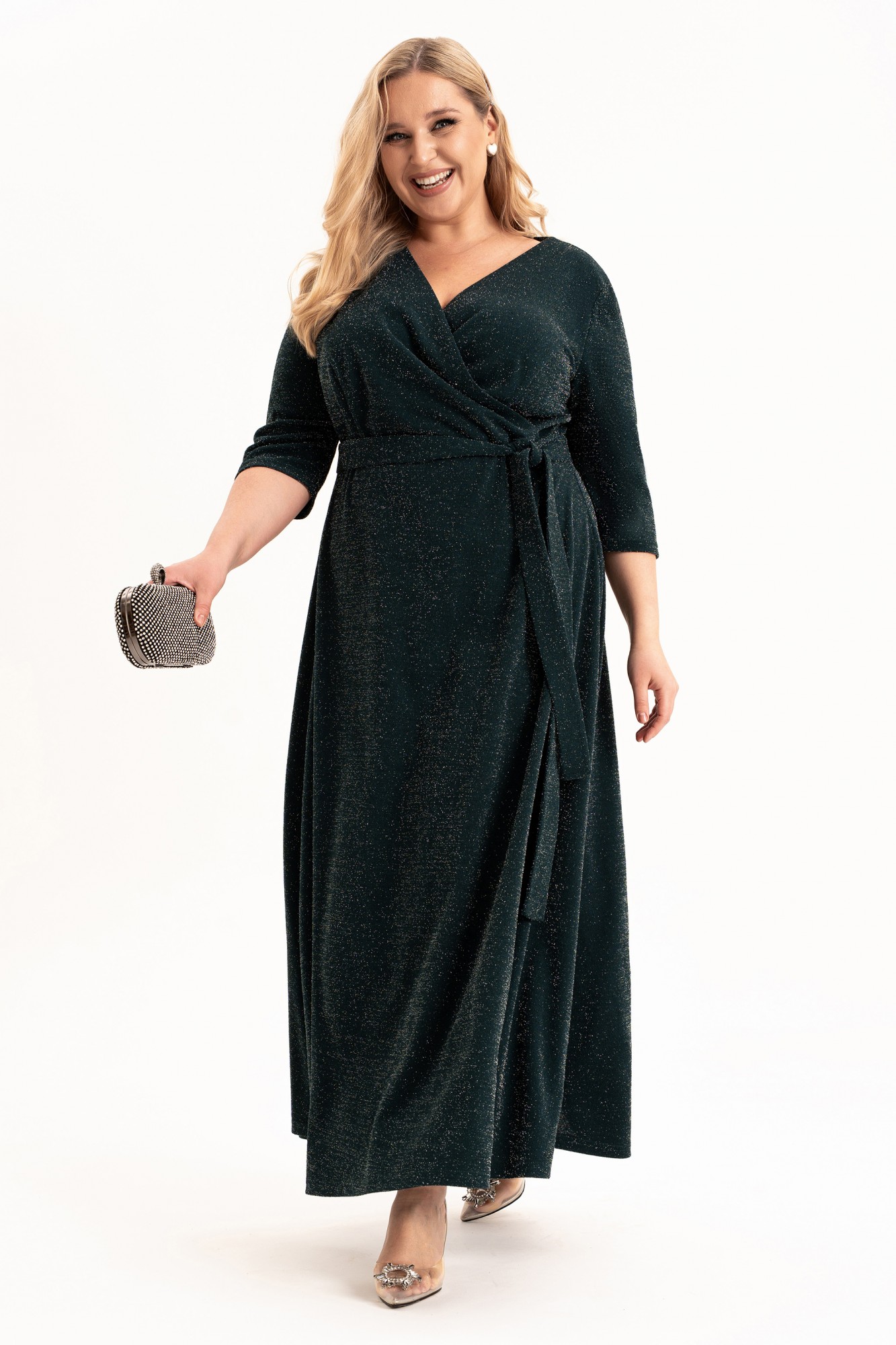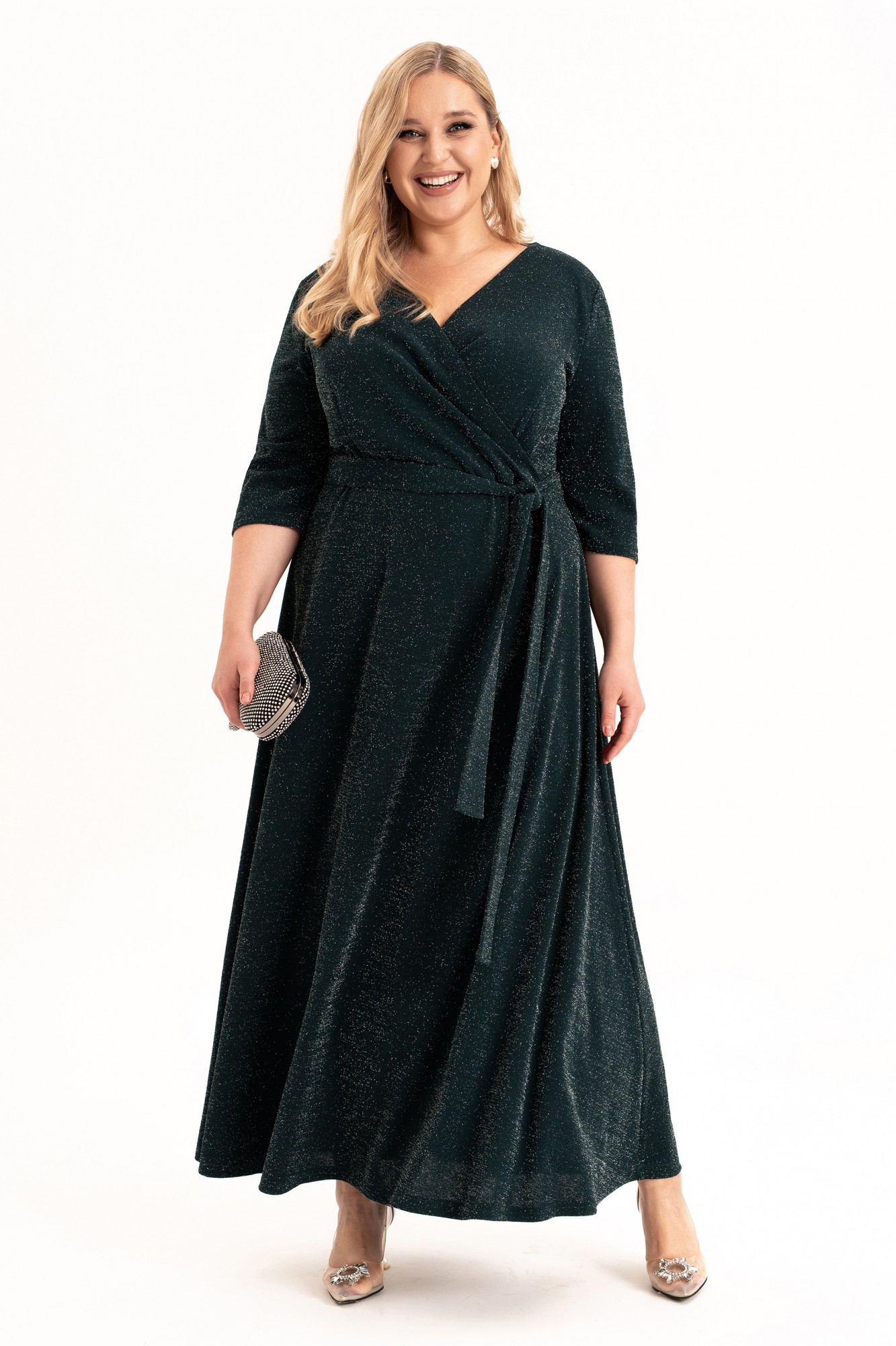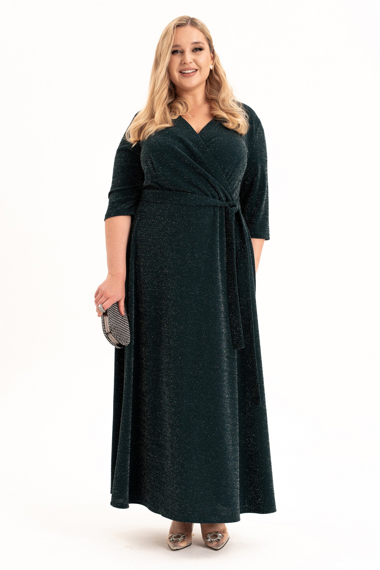 Нарядное платье на запах - это элегантный выбор для любой женщины, подростка или девушки, идеальное сочетание стиля и комфорта. Длинное вечернее платье сочного изумрудного цвета из стрейчевого трикотажного полотна с люрексом. Ткань мягкая, очень приятная к телу. Верхняя часть платья переда и спинки отрезные по линии талии. Лиф переда с эффектным запахом и рельефным бочком. Нижняя часть платья расширена к низу. Рукав втачной, длиной ¾. Платье со съёмным поясом. Съемный пояс и закрытые плечи выгодно подчеркивают женственность фигуры, а рукава длиной три четверти и пикантный V-образный вырез добавляют неповторимости вашему образу. Выполненное из премиальной ткани с блеском, платье представлено в различных размерах. Это универсальное платье подойдет для любого случая: будь то деловая встреча, вечерняя прогулка или особенный праздник. Тренд сезона 2025-2026года. Его можно носить в любое время года, от весны до зимы. Внимание к деталям и трендовый дизайн делают его идеальным выбором для множества мероприятий, включая свадебные фотосессии, ресторанные посиделки или корпоративные вечера. Платье нарядно, кокетливо и подходит как высоким, так и невысоким девушкам. Независимо от вашего стиля или сезона, наше платье будет идеальным выбором.