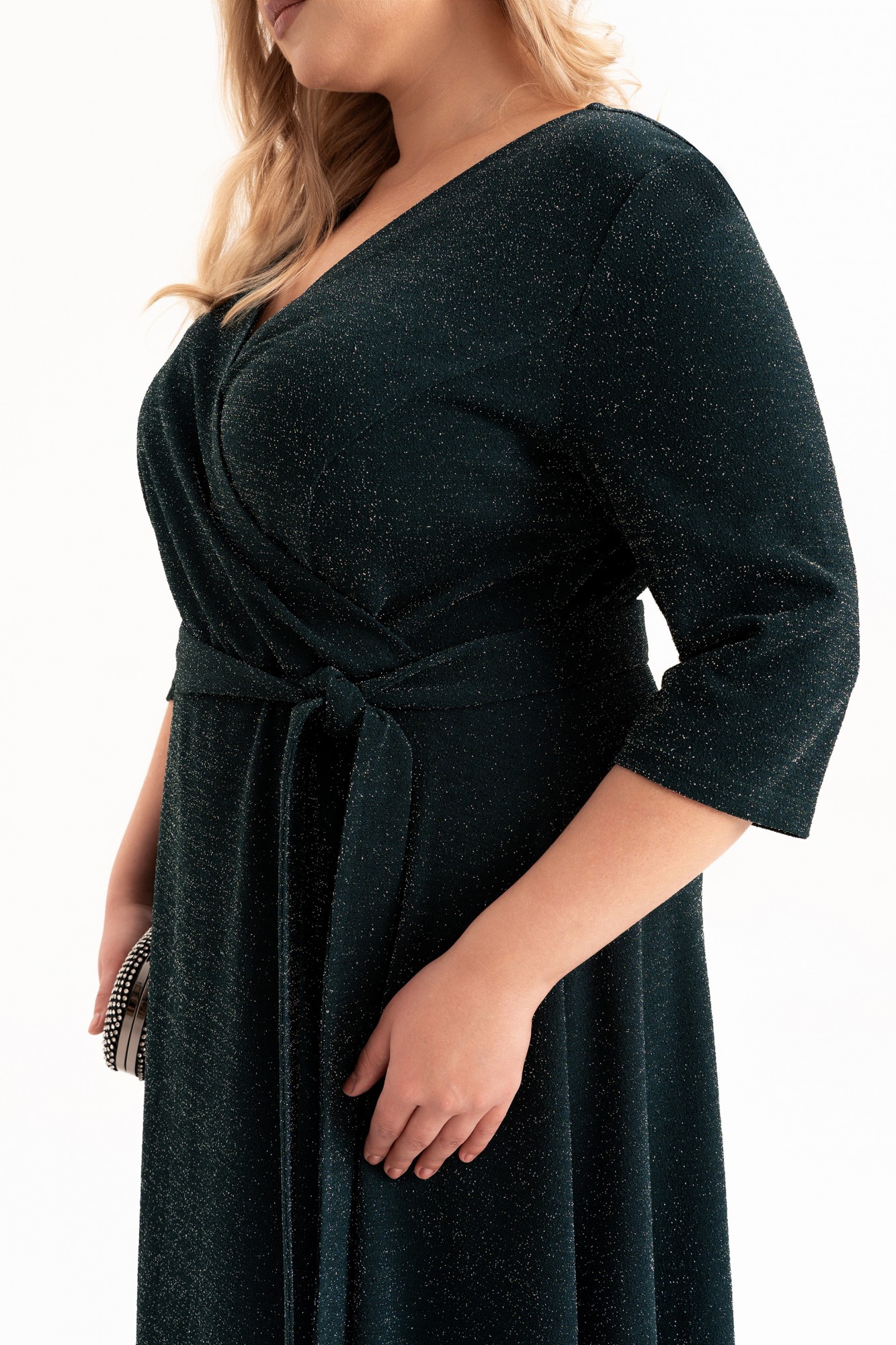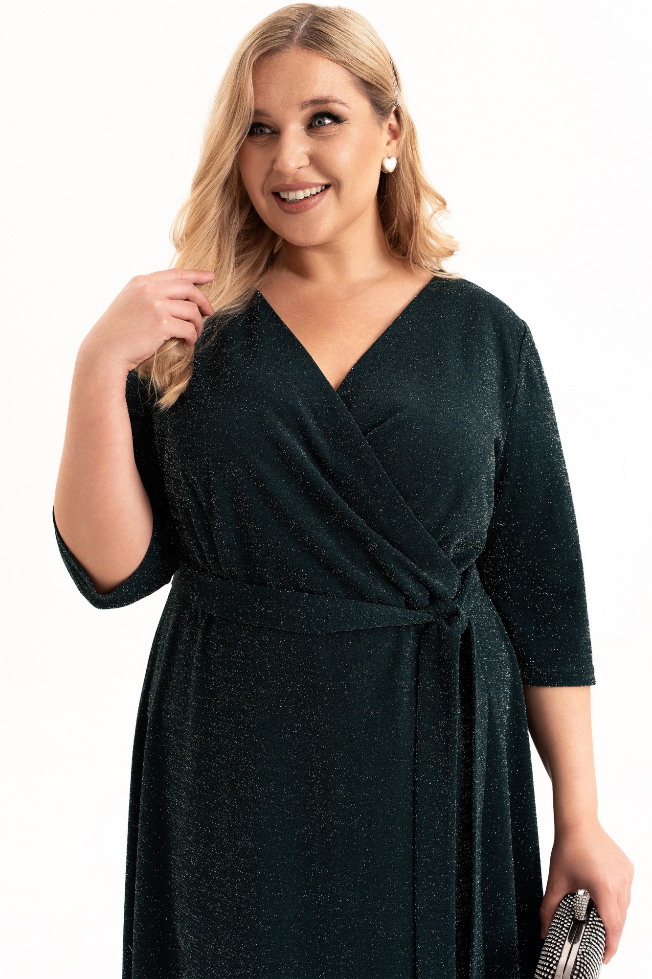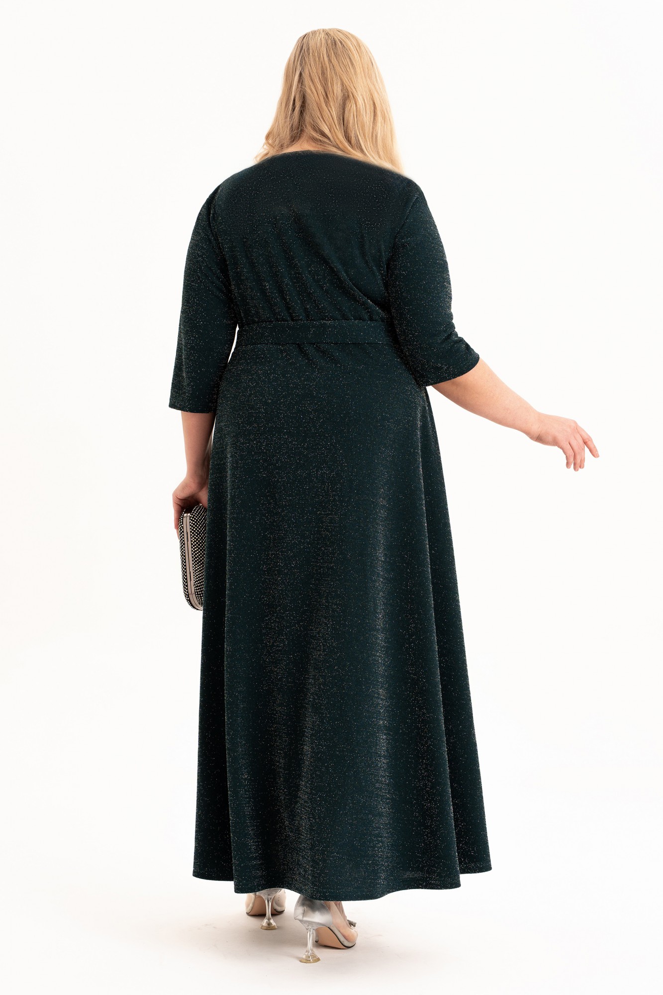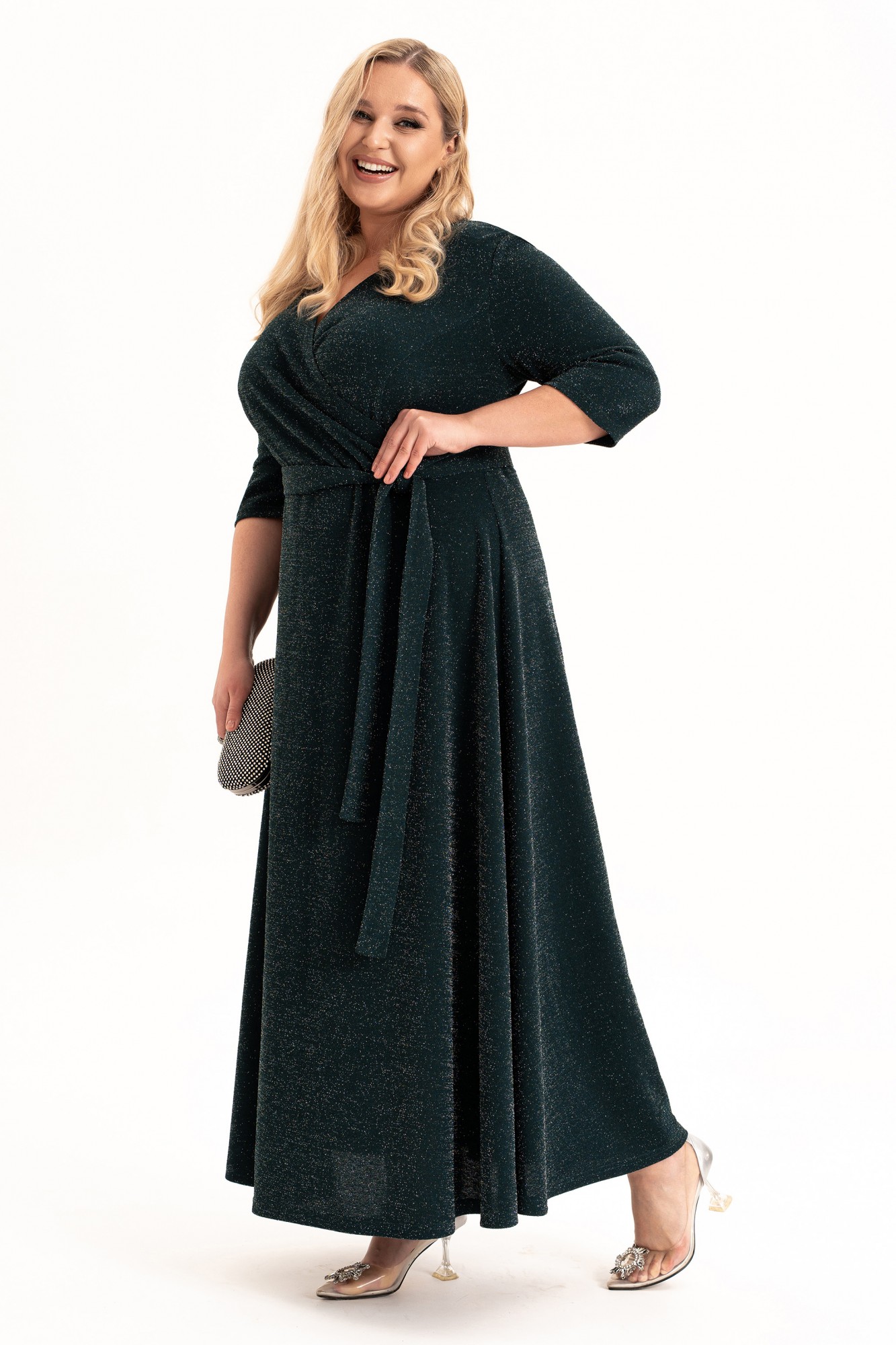 Нарядное платье на запах - это элегантный выбор для любой женщины, подростка или девушки, идеальное сочетание стиля и комфорта. Длинное вечернее платье сочного изумрудного цвета из стрейчевого трикотажного полотна с люрексом. Ткань мягкая, очень приятная к телу. Верхняя часть платья переда и спинки отрезные по линии талии. Лиф переда с эффектным запахом и рельефным бочком. Нижняя часть платья расширена к низу. Рукав втачной, длиной ¾. Платье со съёмным поясом. Съемный пояс и закрытые плечи выгодно подчеркивают женственность фигуры, а рукава длиной три четверти и пикантный V-образный вырез добавляют неповторимости вашему образу. Выполненное из премиальной ткани с блеском, платье представлено в различных размерах. Это универсальное платье подойдет для любого случая: будь то деловая встреча, вечерняя прогулка или особенный праздник. Тренд сезона 2025-2026года. Его можно носить в любое время года, от весны до зимы. Внимание к деталям и трендовый дизайн делают его идеальным выбором для множества мероприятий, включая свадебные фотосессии, ресторанные посиделки или корпоративные вечера. Платье нарядно, кокетливо и подходит как высоким, так и невысоким девушкам. Независимо от вашего стиля или сезона, наше платье будет идеальным выбором.